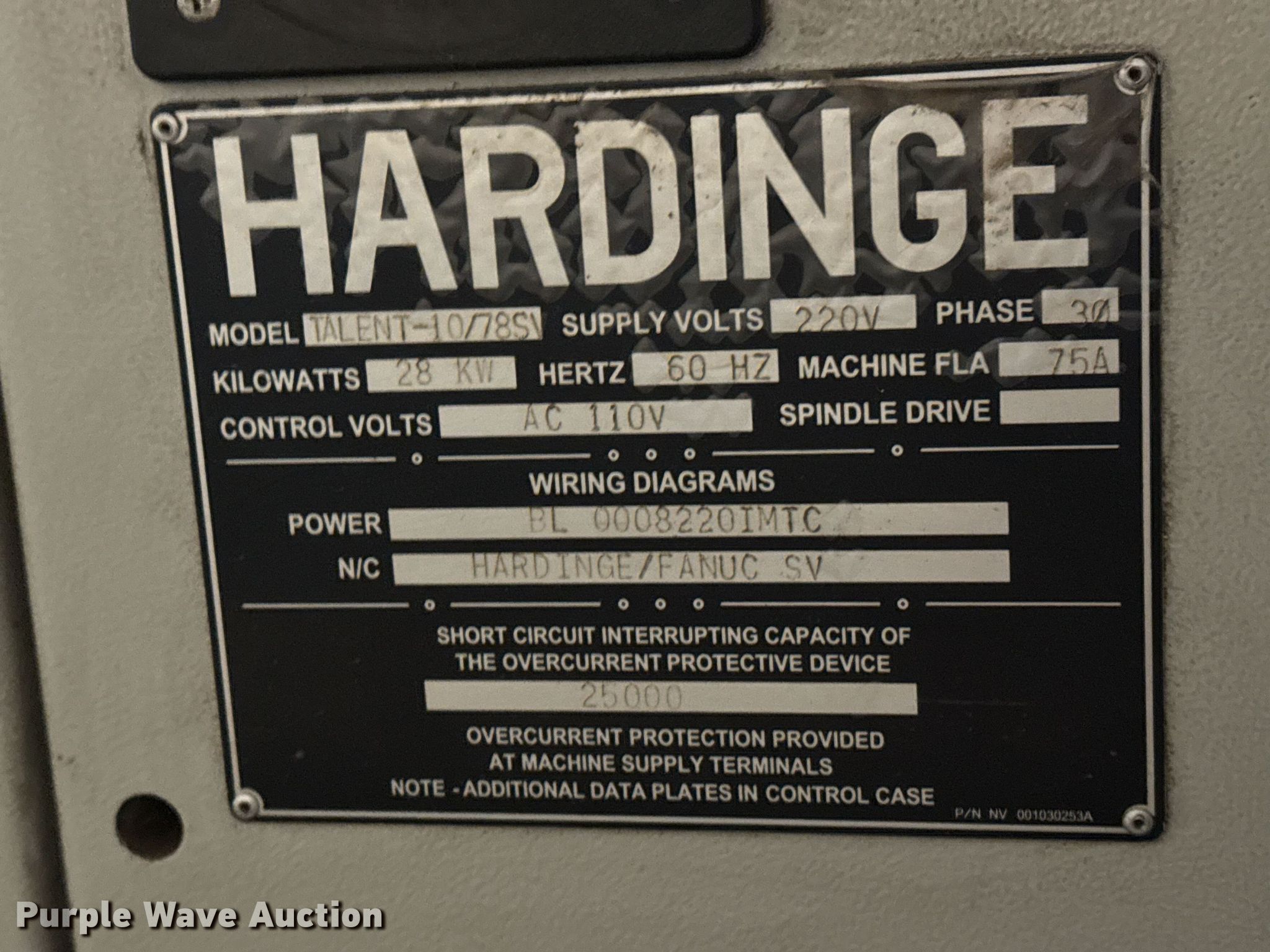 Hardinge Talent 10/78 SV CNC lathe. Electric Motor. Volts: 220, Phase: Three. Features Lathe chuck 10�, Auto tool changer. Notes Additional chuck parts included. Buyer responsible for all aspects of disassembly and removal. Assaria, KS 67416