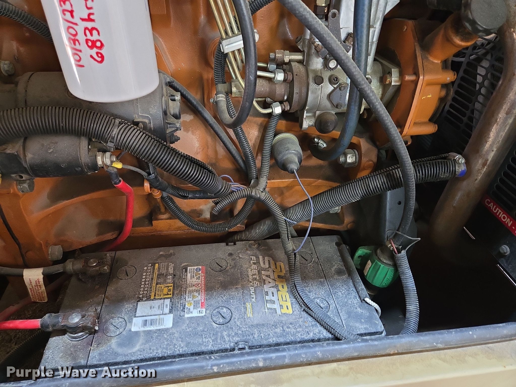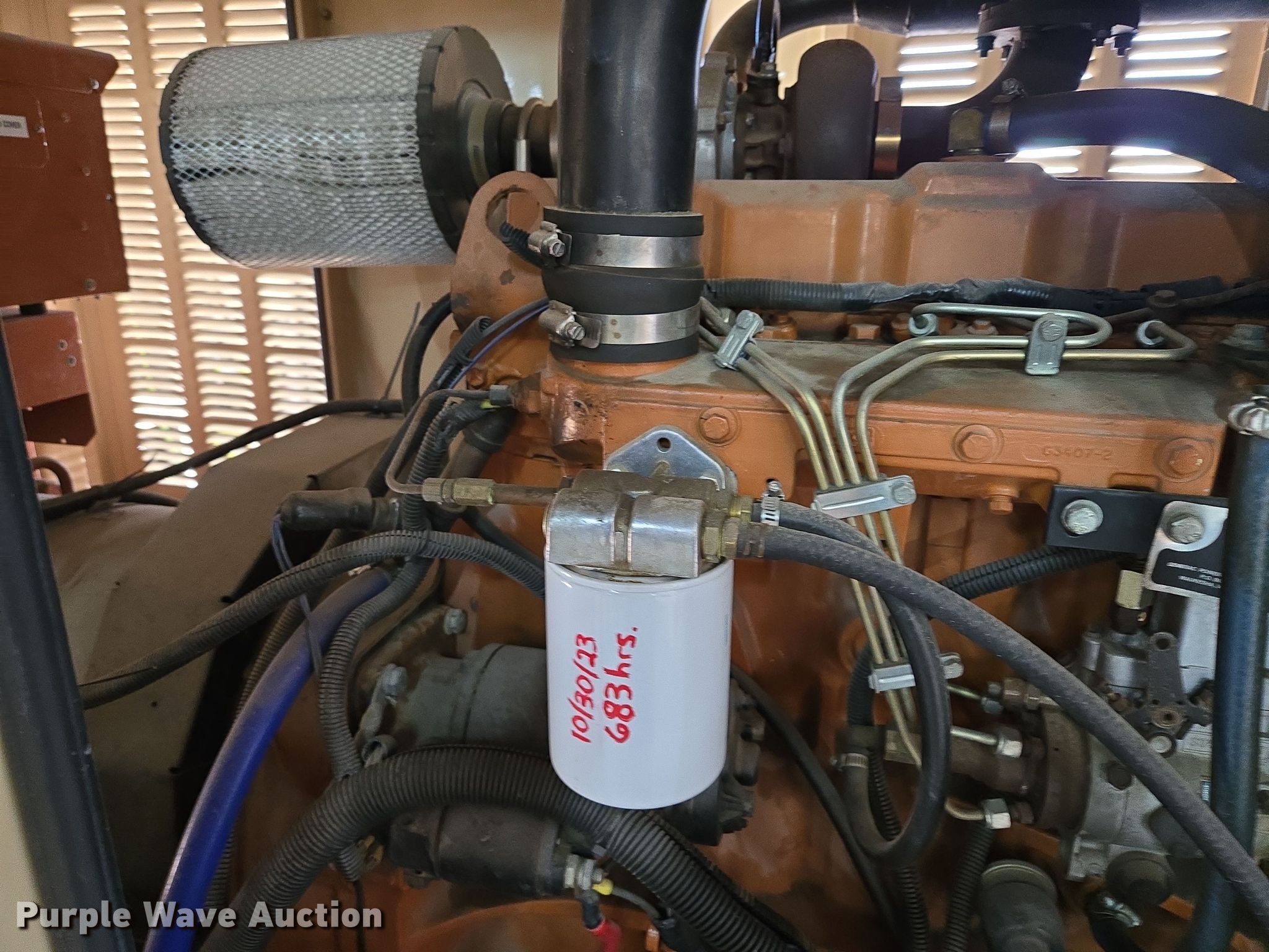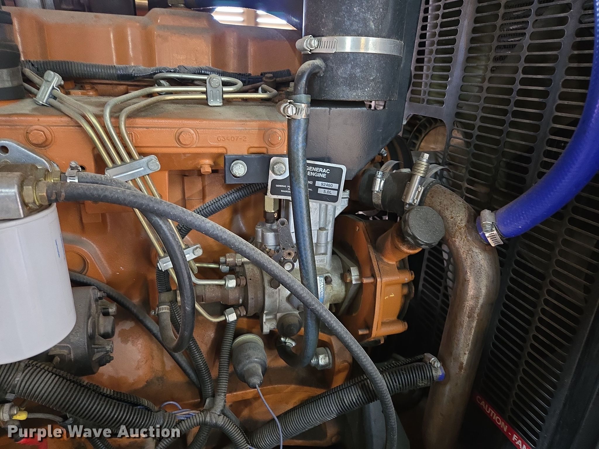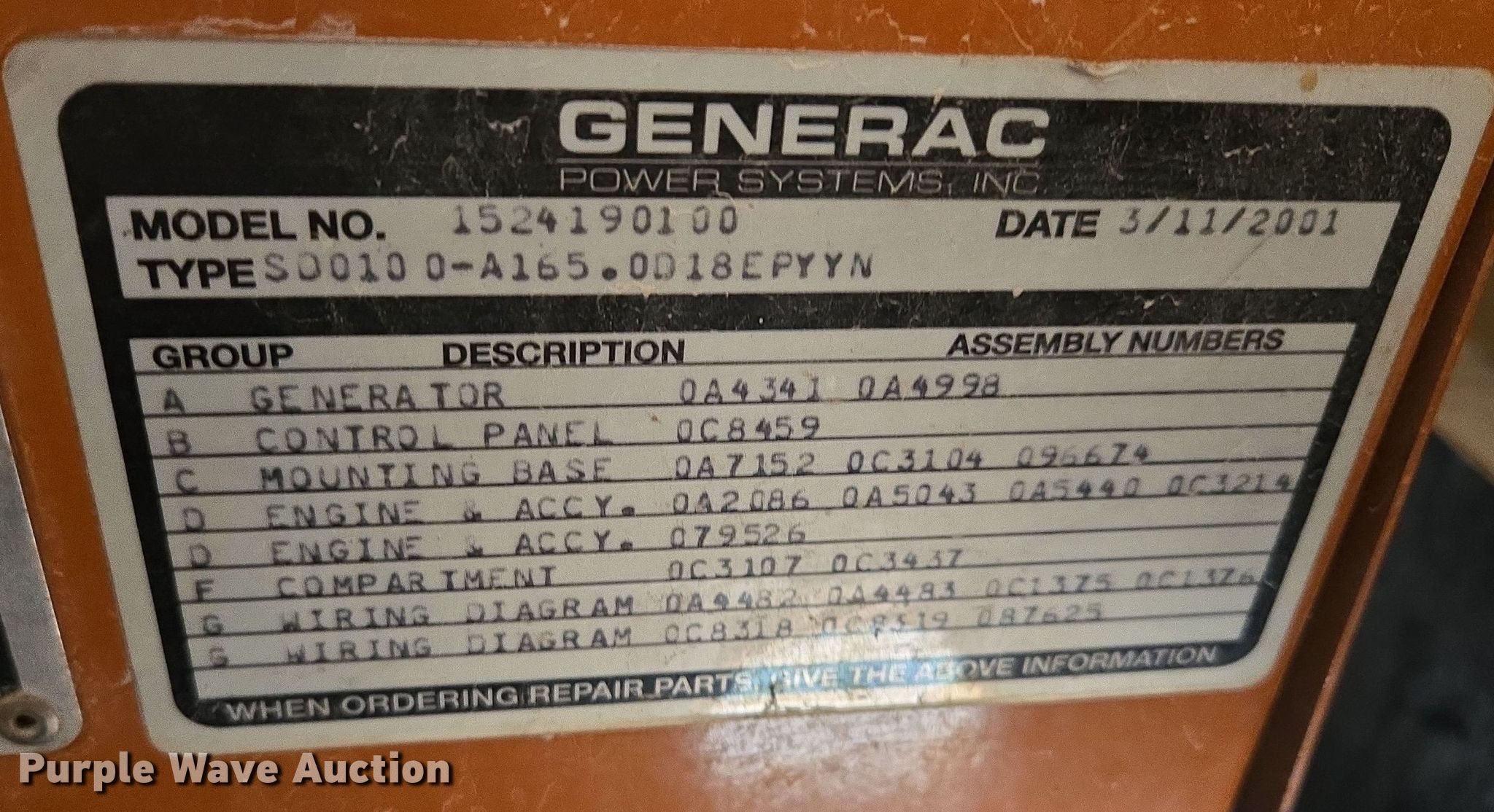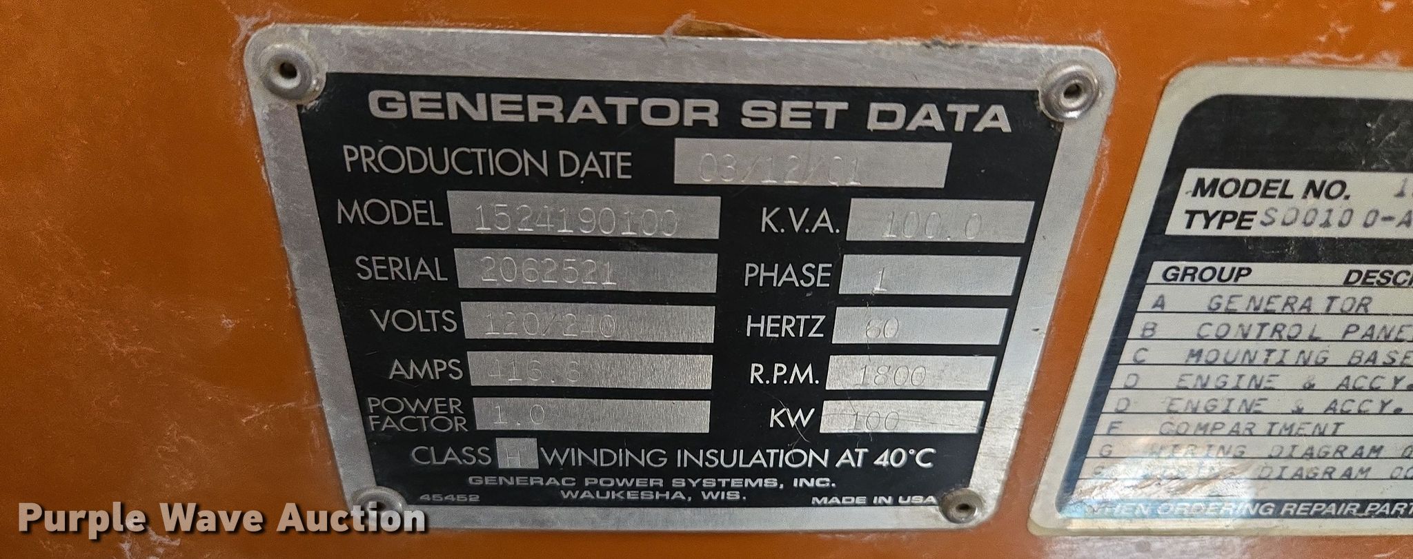 2001 Generac 2000 Series generator. Hours: 701 on meter, Serial: 2062521. Engine Generac, Serial: 92460, Displacement: 5.0L, Cylinders: 4, Fuel type: Diesel. Features Generator Generac, kVA: 100, kW: 100, Phase: Single, Electric start, Fuel tank, Skid mounted. Maher Oil Company. Kansas City, MO 64120