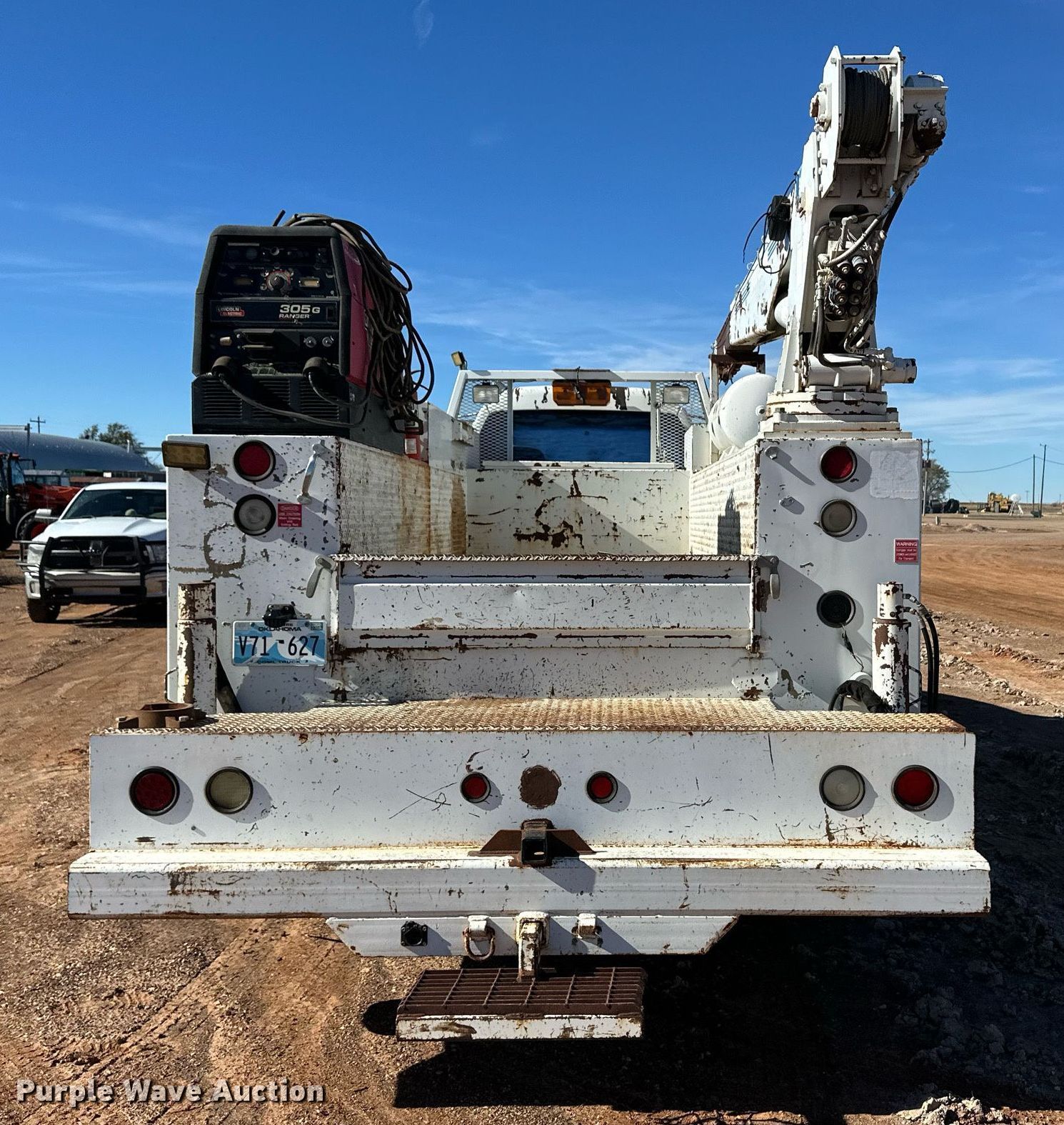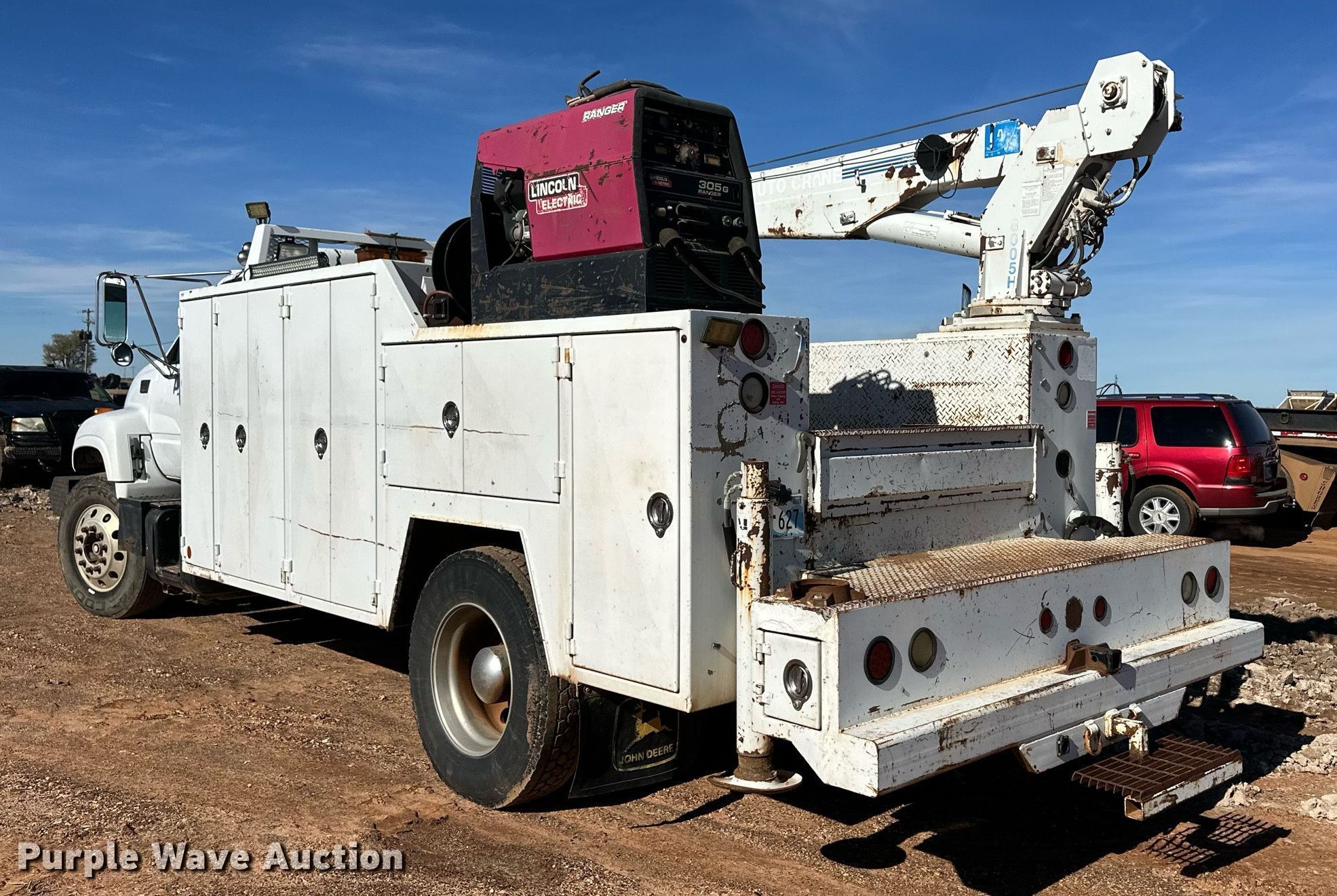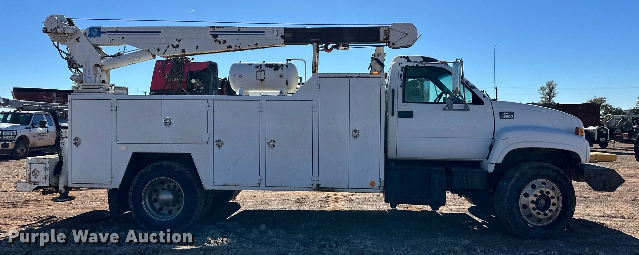 2000 GMC C7500 utility / service truck. Miles: 292,000 on odometer, VIN: 1GDK7H1C1YJ520432, Unit #: 401. Engine Caterpillar 3126, Displacement: 7.2L, Cylinders: 6, Fuel type: Diesel. Transmission Eaton Fuller, Manual, Speed: 7. Chassis Axles: Single, Suspension: Spring, Brakes: Air, PTO. Interior AC, Heat. Features Bed Seyller Custom Bodies, 14' L x 98" W, Welder/generator Lincoln Electric 305G Ranger, Fuel type: Gas, Watts: 9,500, Fuel type: Gas, Welder type: Leads, Stick (AC/DC), Crane Auto Crane 8005H, Maximum boom length: 28' Maximum lift capacity: 8,000 lbs.. Tires Size: 295/75R22.5. Notes Crane hydraulic leak. Oklahoma title. Title distribution may be delayed up to 30 days from verification of funds. Blue Sage Services. Knowles, OK 73844