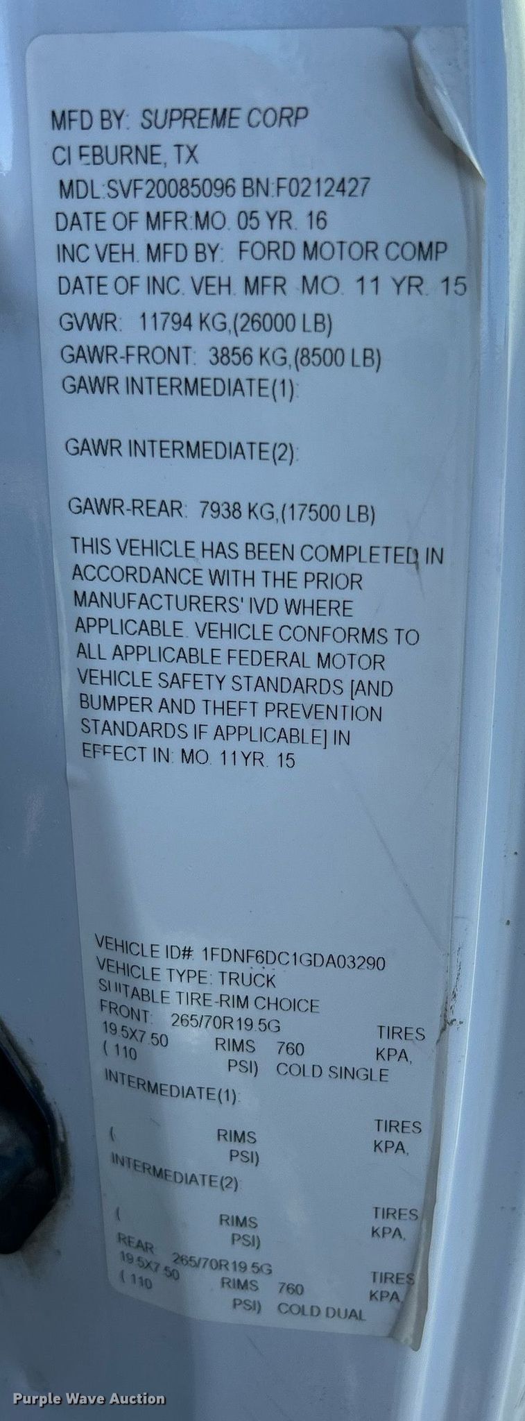 2016 Ford F650 Super Duty box truck. Miles: 309,762 on odometer, VIN: 1FDNF6DC1GDA03290. Engine Displacement: 6.7L, Cylinders: 8, Fuel type: Diesel. Transmission Automatic. Chassis Axles: Single, Suspension: Spring, Brakes: Hydraulic, GVWR: 26,000 lbs. Interior AC, Heat, Power windows, Power locks, Cruise control, Auxiliary controls. Features Box bed Supreme Corp, Serial: SVF20085096, 20.5' L x 96" W x 91" H, Floor: Wood. Tires Size: 245/70R19.5. Notes Bed contents included. Kansas title. Seller is a Missouri licensed motor vehicle dealer. Title will be assigned and distributed by the dealer. Please contact the seller for distribution questions. Title distribution may be delayed up to 30 days from verification of funds. Fruendly Auto Source Inc.. Moscow Mills, MO 63362