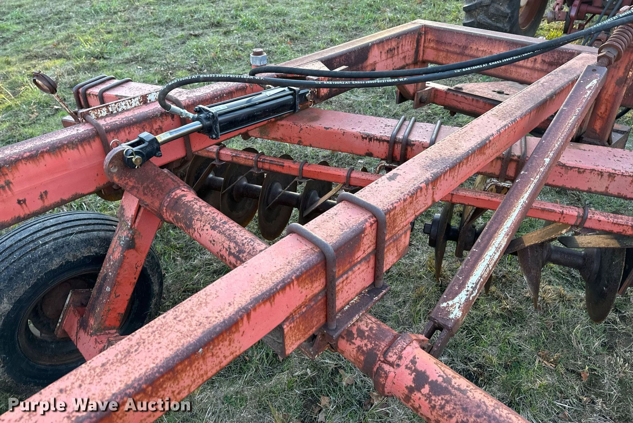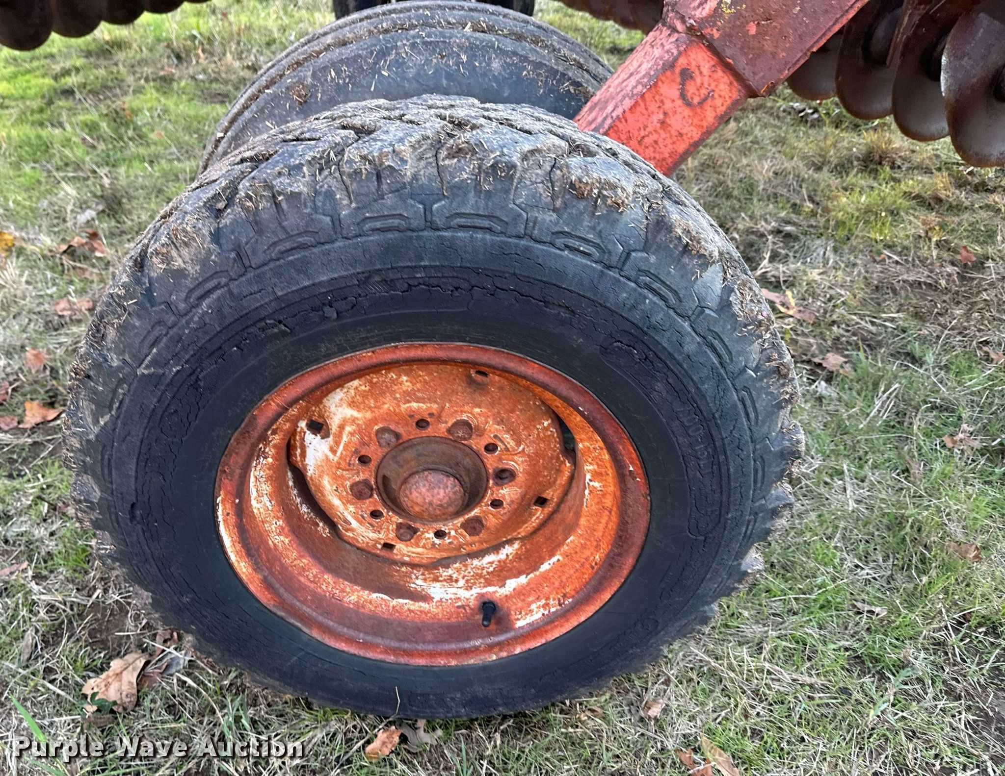 Allis-Chalmers 3100 off-set disk. Overall width: 13', Serial: 485. Features Front blades Diameter: 20", Spacing: 8", Rear blades Diameter: 18", Spacing: 9", Disk scrapers, Operation Hydraulic lift, Leveler: Manual. Tires Tire size: 7.00-15. Notes Tractor not included. Chelsea, OK 74016