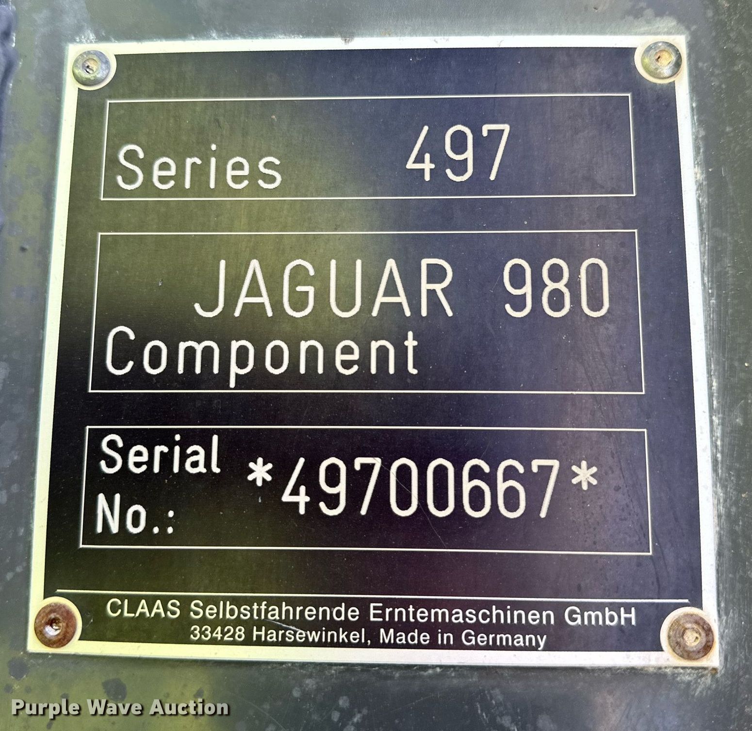 2015 Claas Jaguar 980 forage harvester. Working hours: 4,850 on meter, Cutter hours: 3,605 on meter, Serial: 49700667. Engine Mann, Serial: 71242198174222, Displacement: 2.02L, Cylinders: 12, Fuel type: Diesel, kW: 650. Transmission Hydrostatic. Operators station AC. Features Auto lube, On-board air, Kernel processor, Spout: High arch, Hydraulic adjust, Rear hitch, Head drive: Single. Tires Front: 800/65R32, Rear: 600/65R28. Gunnewick Custom Harvest Inc.. Hart, TX 79043