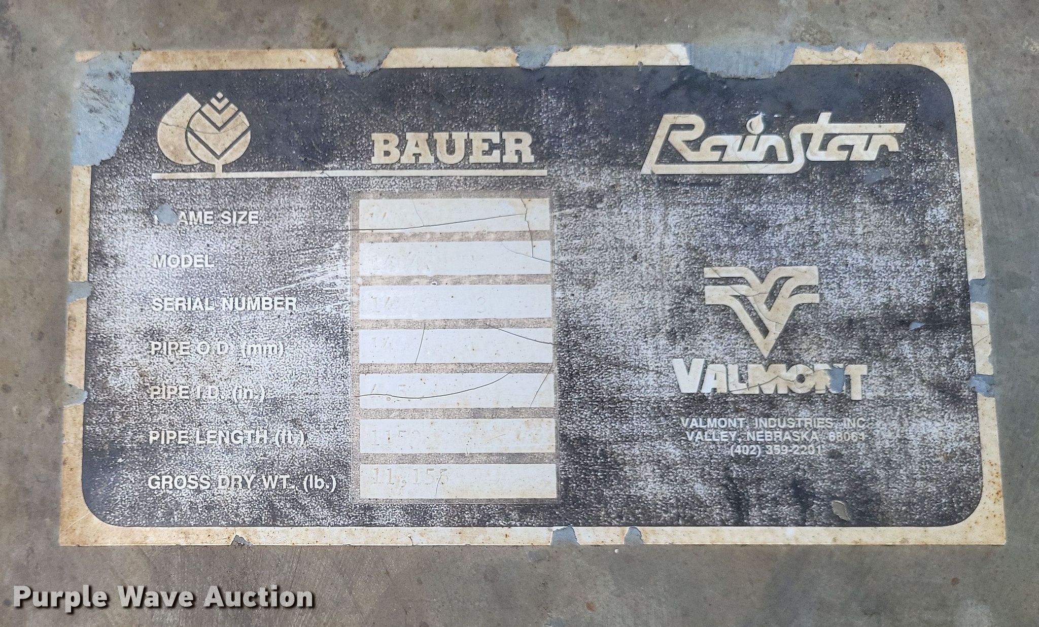 Bauer RainStar hose reel. Features. Sprinkler head, Hard hose: Approx. 1,100', Feeder hose: Approx. 20'. Tires Size: 12.5/80-18. Emerald View Turf Farms. O'Fallon, MO 63366