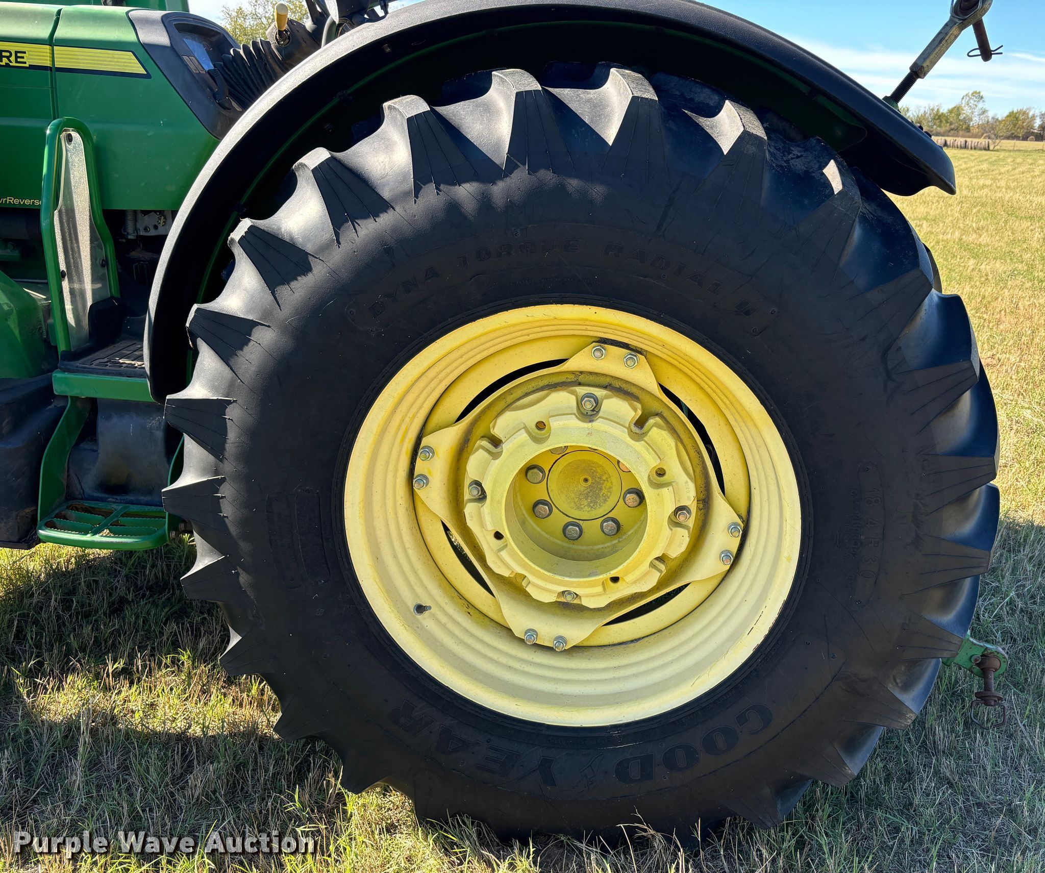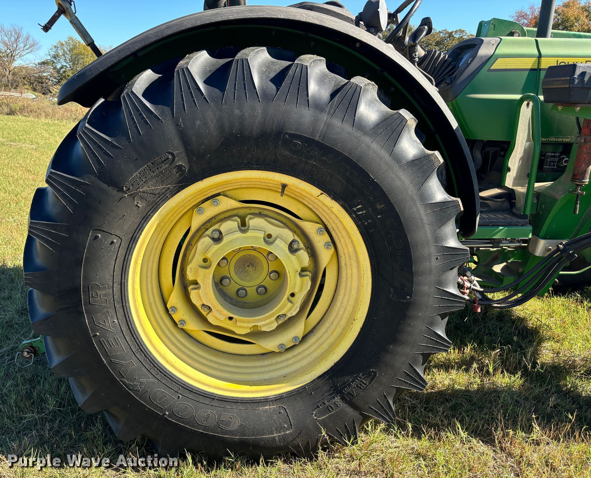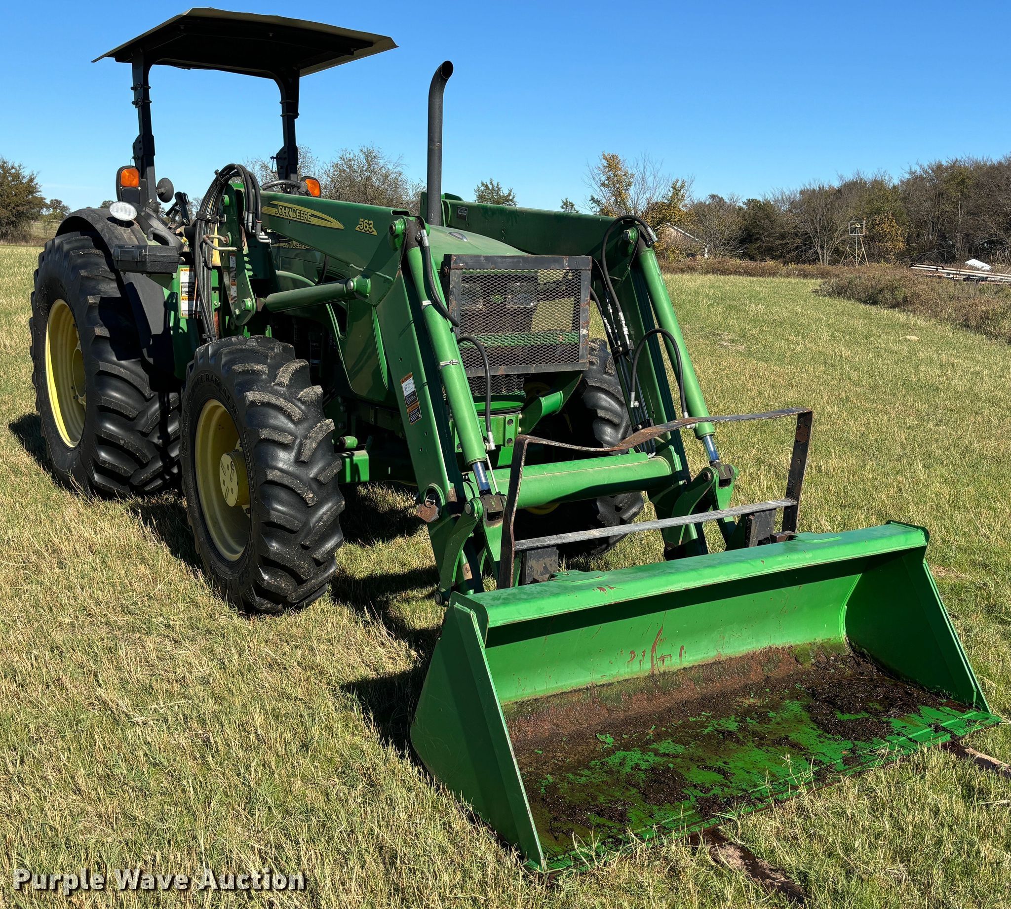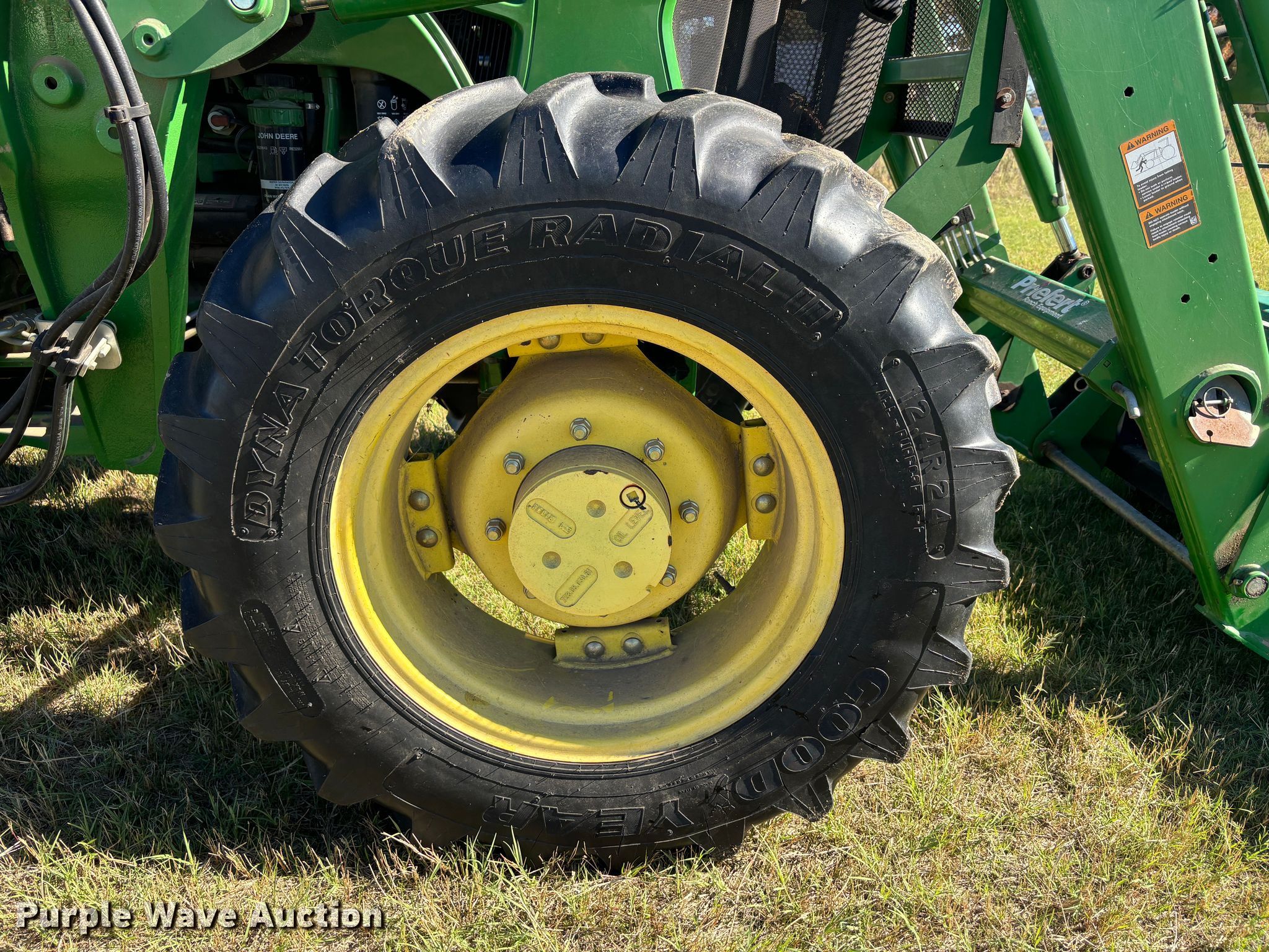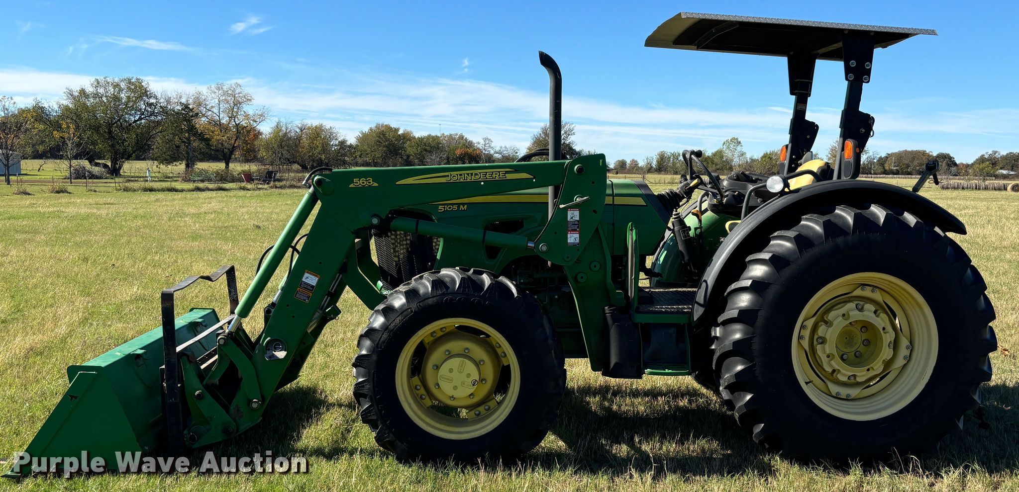 2009 John Deere 5105M MFWD tractor. Hours: 1,543 on meter, Serial: LV5105M160280. Engine Displacement: 4.5L, Cylinders: 4, Fuel type: Diesel. Transmission Synchro, 16F - 16R, Left-hand reverser. Features PTO: 540, Three point Top link, Hydraulic remote sets Rear: 2, Loader John Deere 563, Bucket Width: 74".. Tires Front: 12.4R24, Rear: 18.4R30. Thackerville, OK 73459