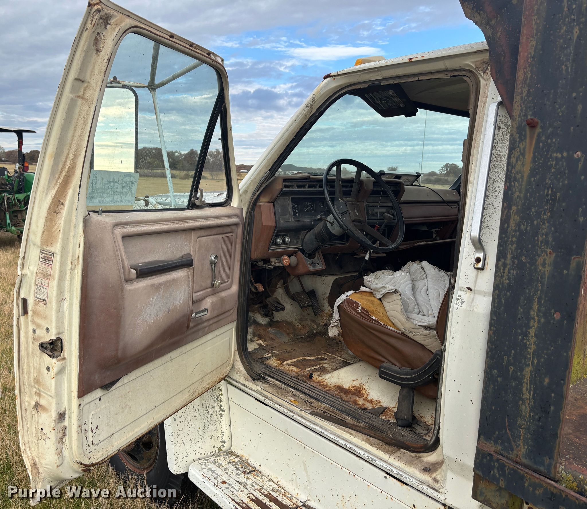 This 1982 Ford F600G flatbed truck will sell to the highest bidder regardless of price.