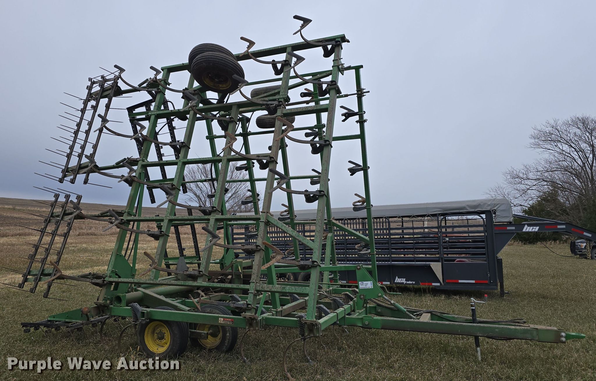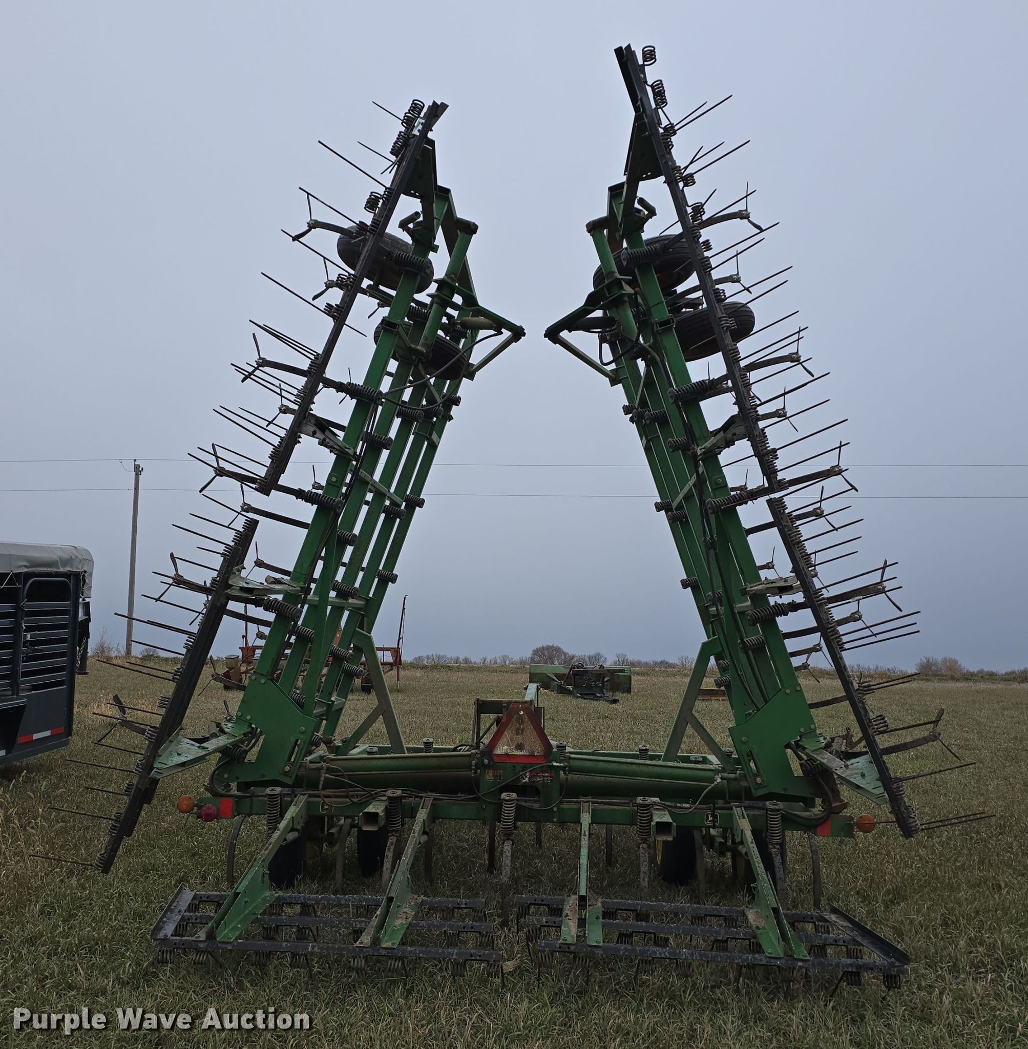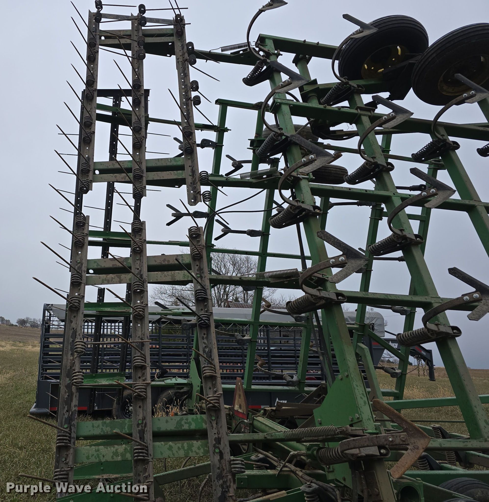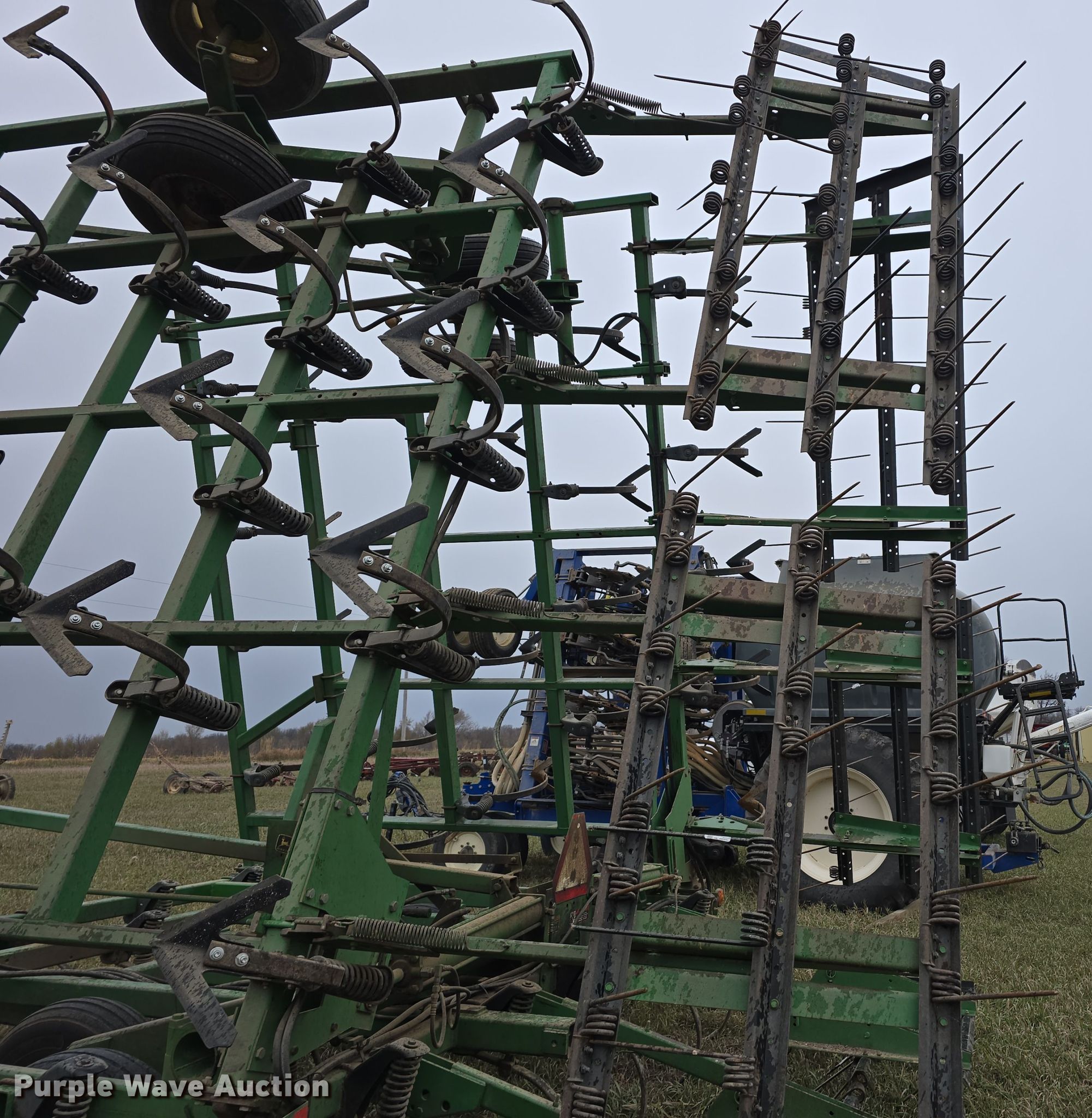 John Deere 980 field cultivator. Overall width: 38'. Features Shanks: 52, Sweep width: 12", Operation Hydraulic lift, Hydraulic fold, Leveler: Manual, Attachments Tine harrow Harrow bars: 3.. Tires Tire size: 9.5L-15, Gauge wheels. Prime Land and Cattle. Seneca, KS 66538