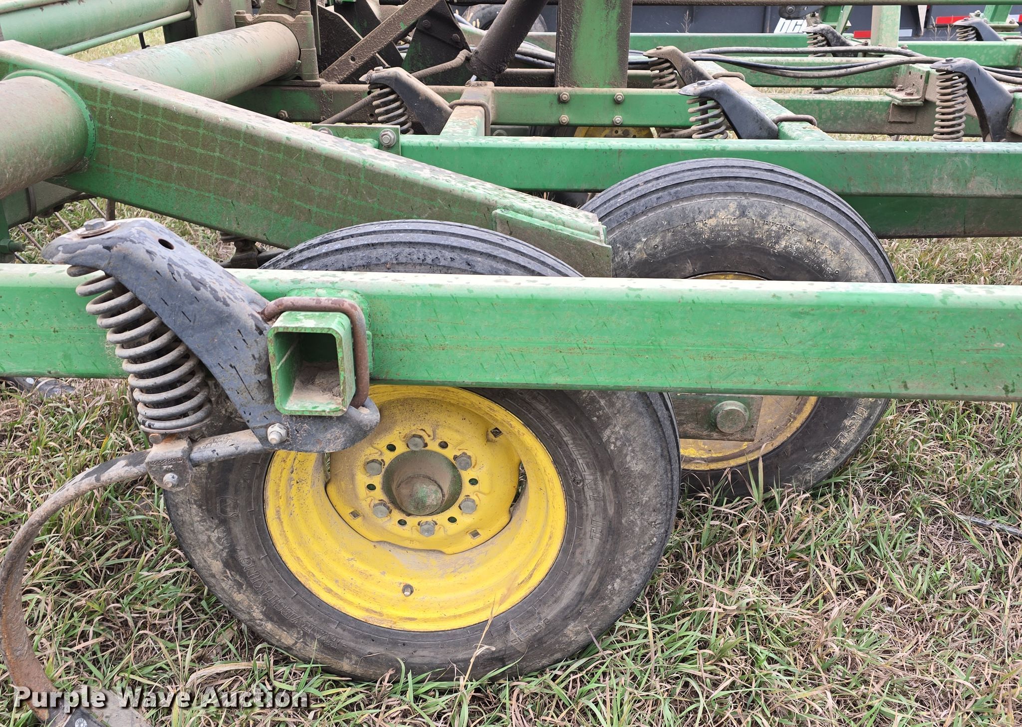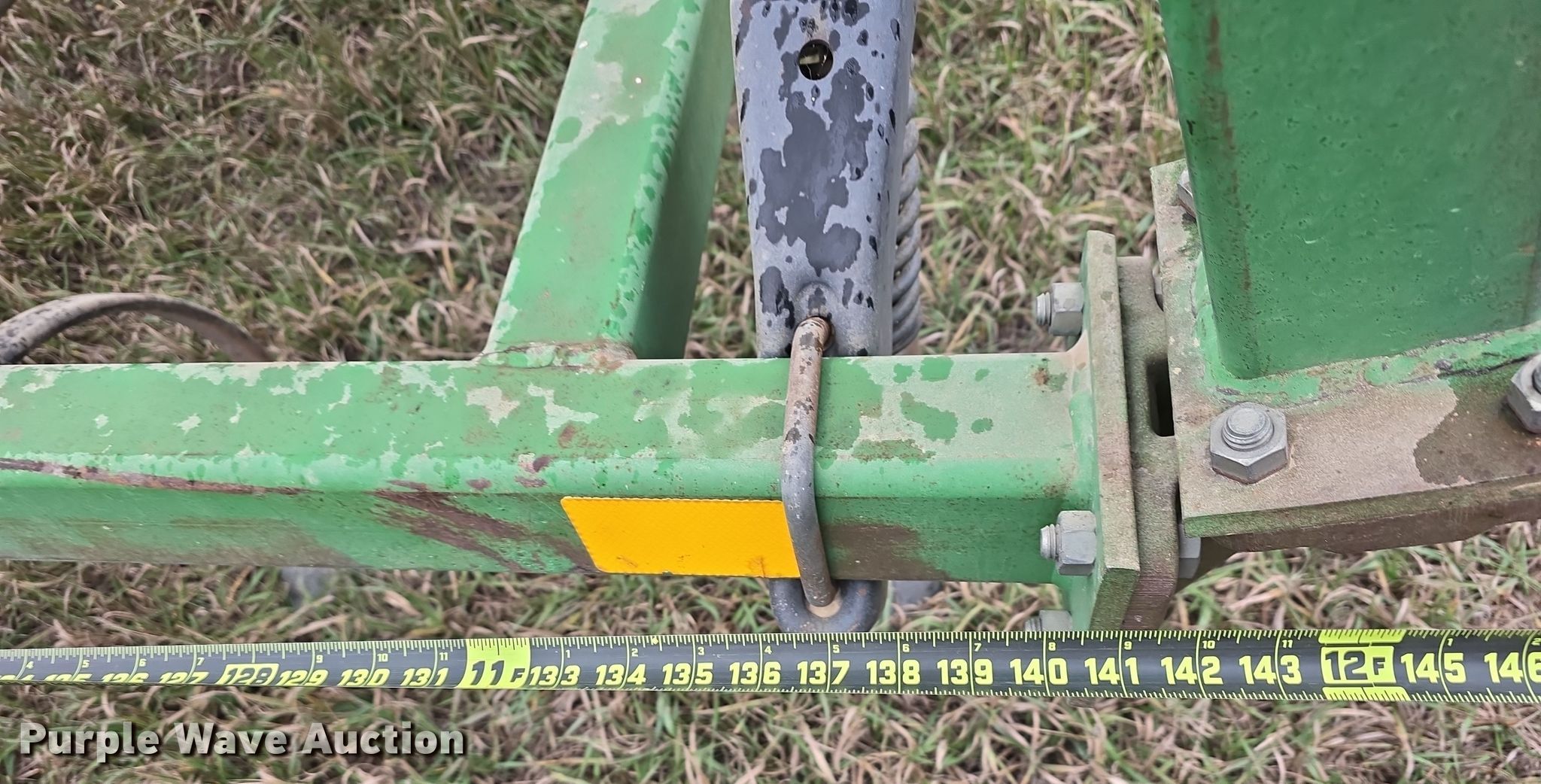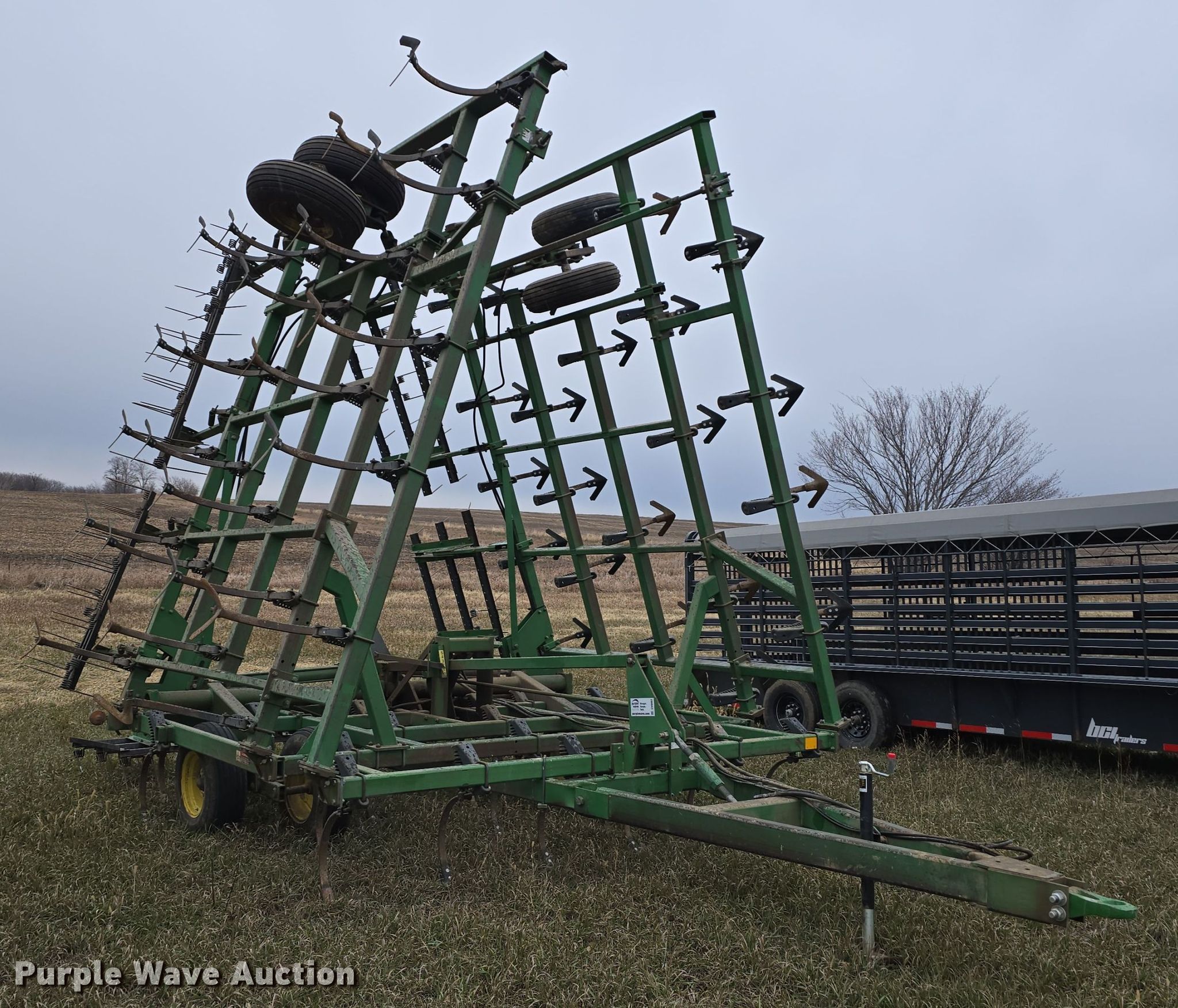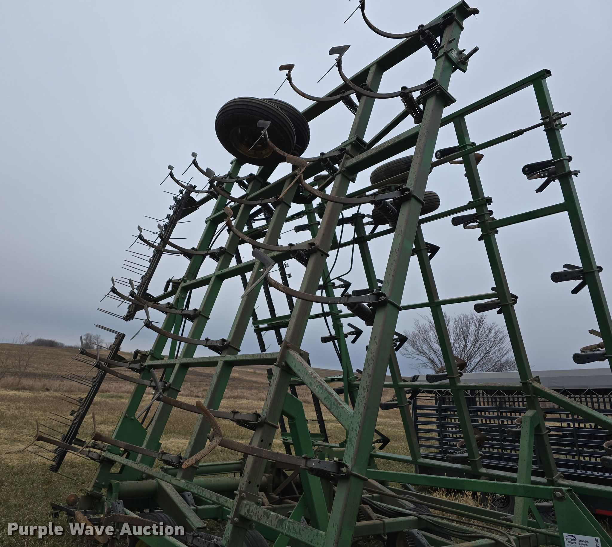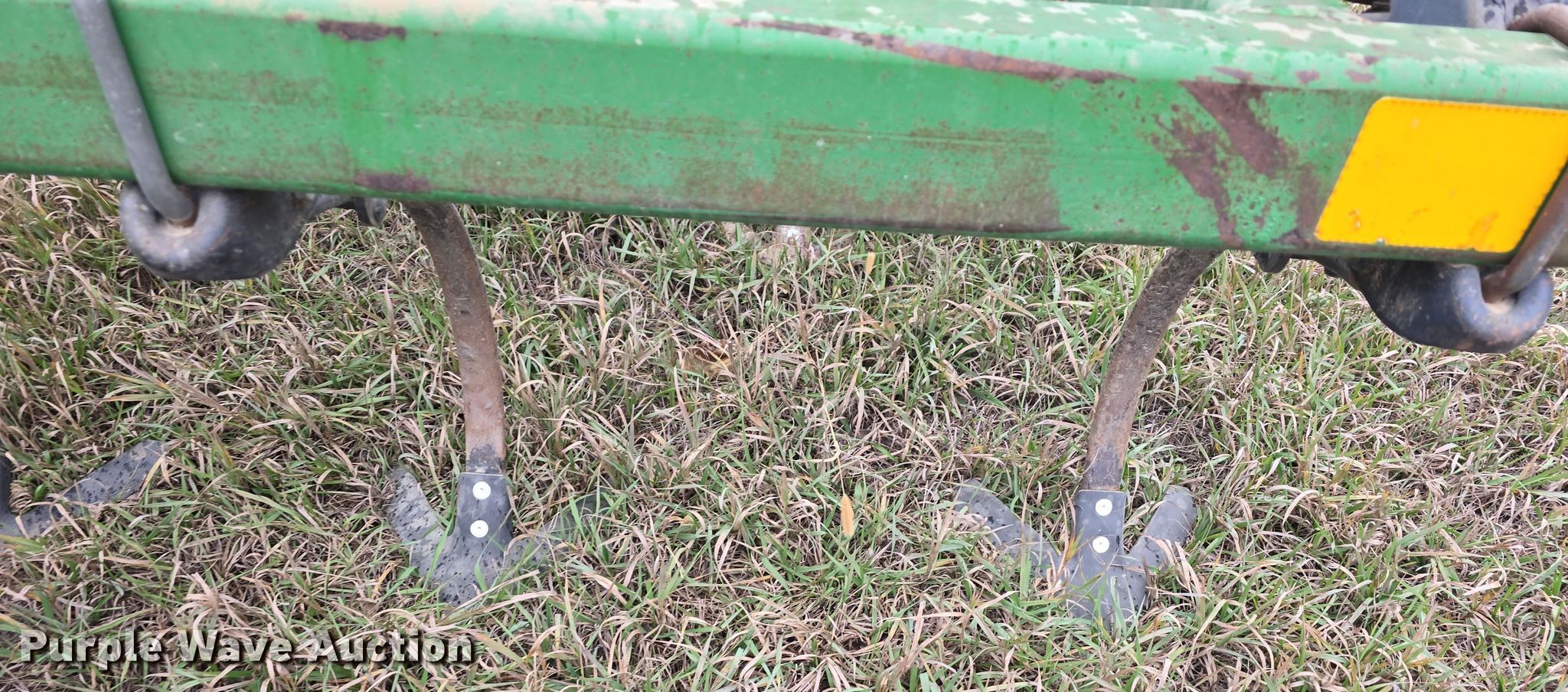 John Deere 980 field cultivator. Overall width: 38'. Features Shanks: 52, Sweep width: 12", Operation Hydraulic lift, Hydraulic fold, Leveler: Manual, Attachments Tine harrow Harrow bars: 3.. Tires Tire size: 9.5L-15, Gauge wheels. Prime Land and Cattle. Seneca, KS 66538