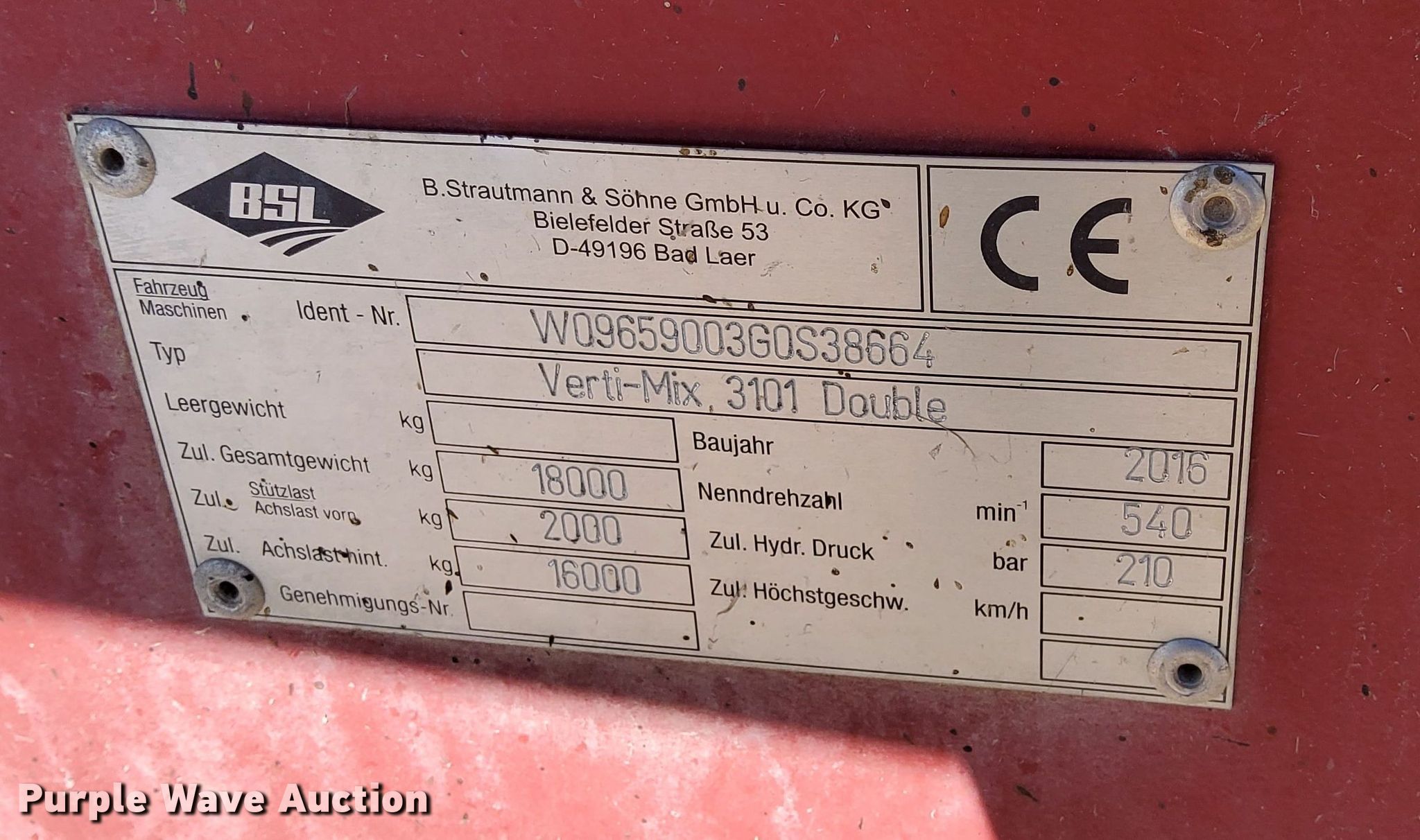 2016 Strautmann Verti-Mix 3101 Double feed grinder/mixer. Serial: W09659003G0S38664. Features PTO: 1 3/4" 1000, Scales DigiStar RD 2500V, Auger Quantity: 2, Discharge: Side, Conveyor Width: 32", Hydraulic door, Liner. Chassis Suspension: Spring, Axles: Tandem. Tires Size: 435/50R19.5. McCook, NE 69001