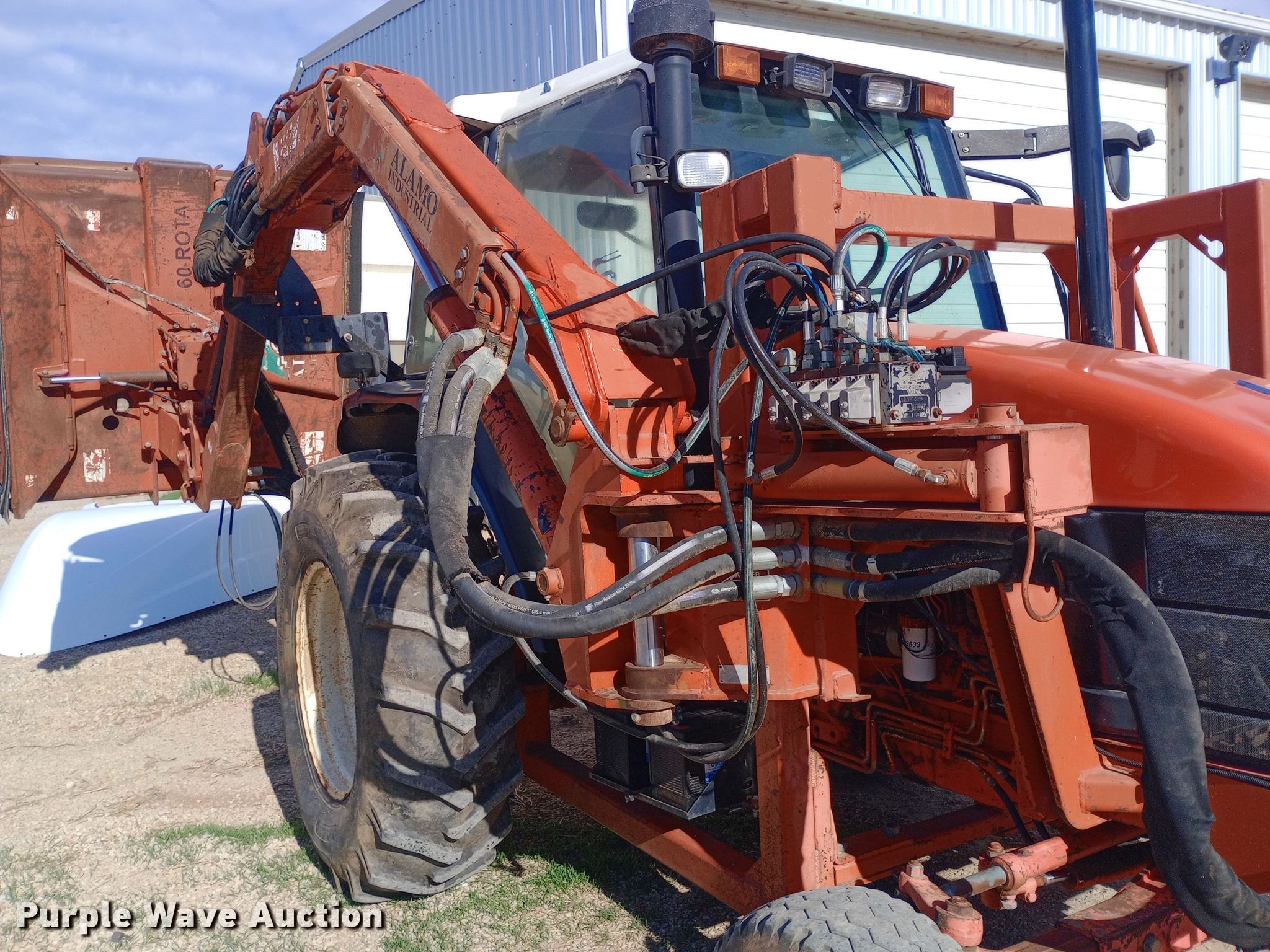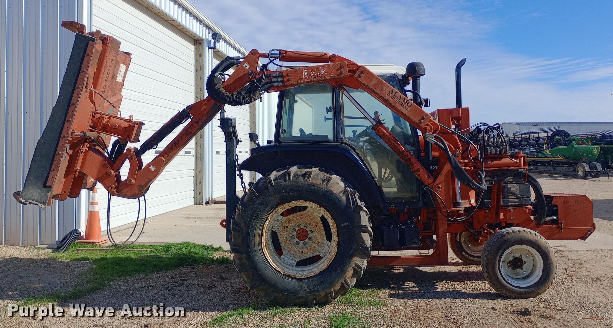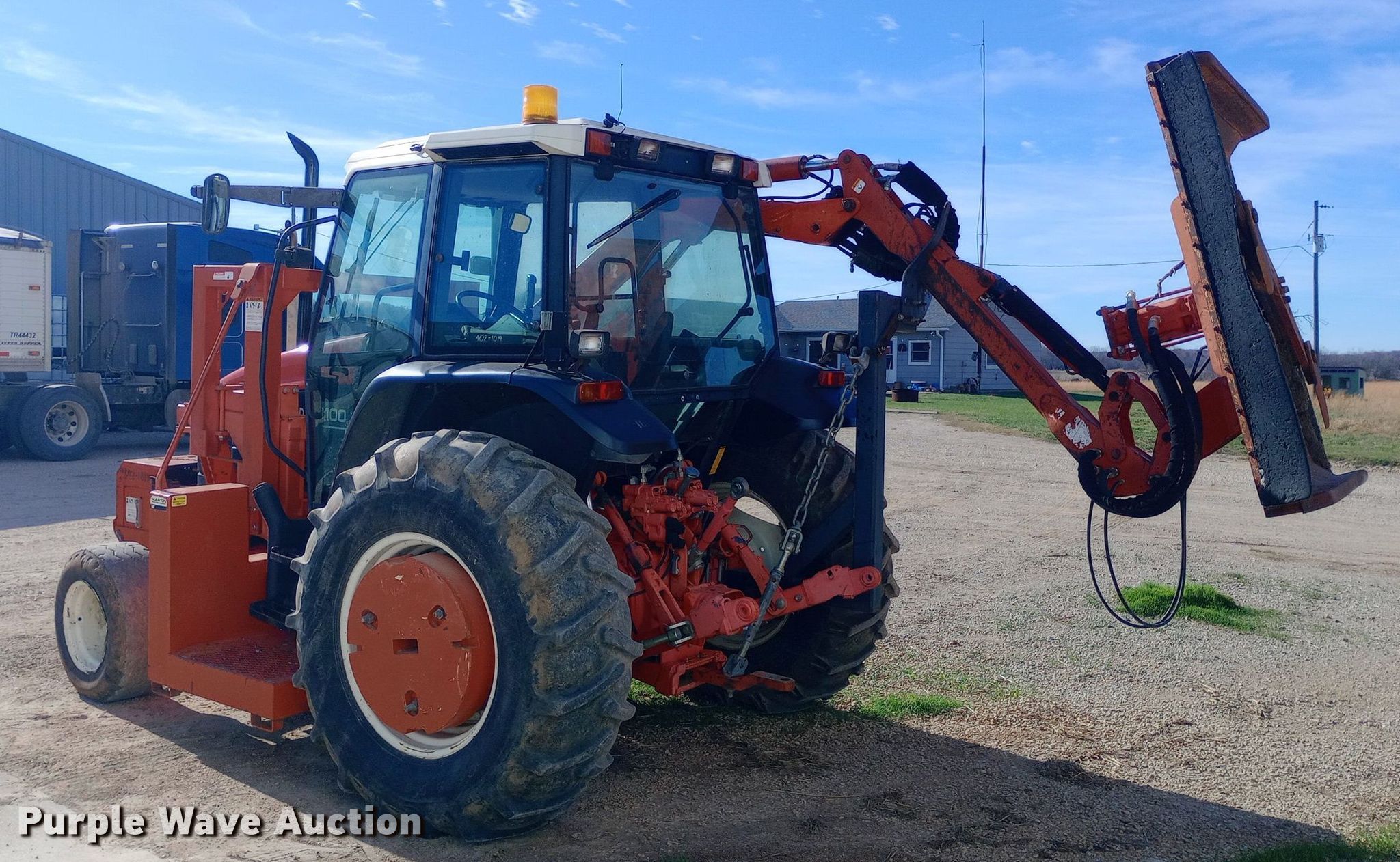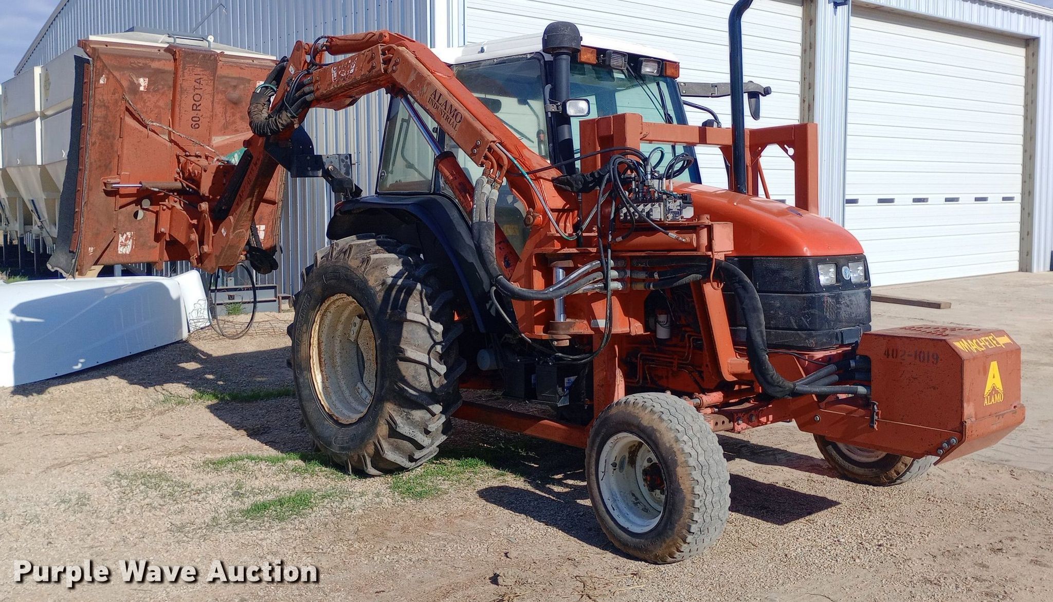 2000 New Holland TS100 tractor. Hours: 2,790 on meter, Serial: 135588B. Engine Cylinders: 4, Fuel type: Diesel. Transmission Synchro, 12F - 12R. Chassis Differential lock. Operators station AC, Heat. Features Three point Top link, Seven pin outlet, Hydraulic remote sets Rear: 4, Alamo Machete MB21 side boom rotary mower Width: 60", Serial: 01403, Hours: 2,148 on meter. Tires Front: 11L-16S, Rear: 18.4-30, Wheel weights: 1. Notes Side boom rotary mower issues, possible controller issues, Side boom rotary mower boom extension issues, must be operated from control valves out the tractor. KC Farms. Fredonia, KS 66736