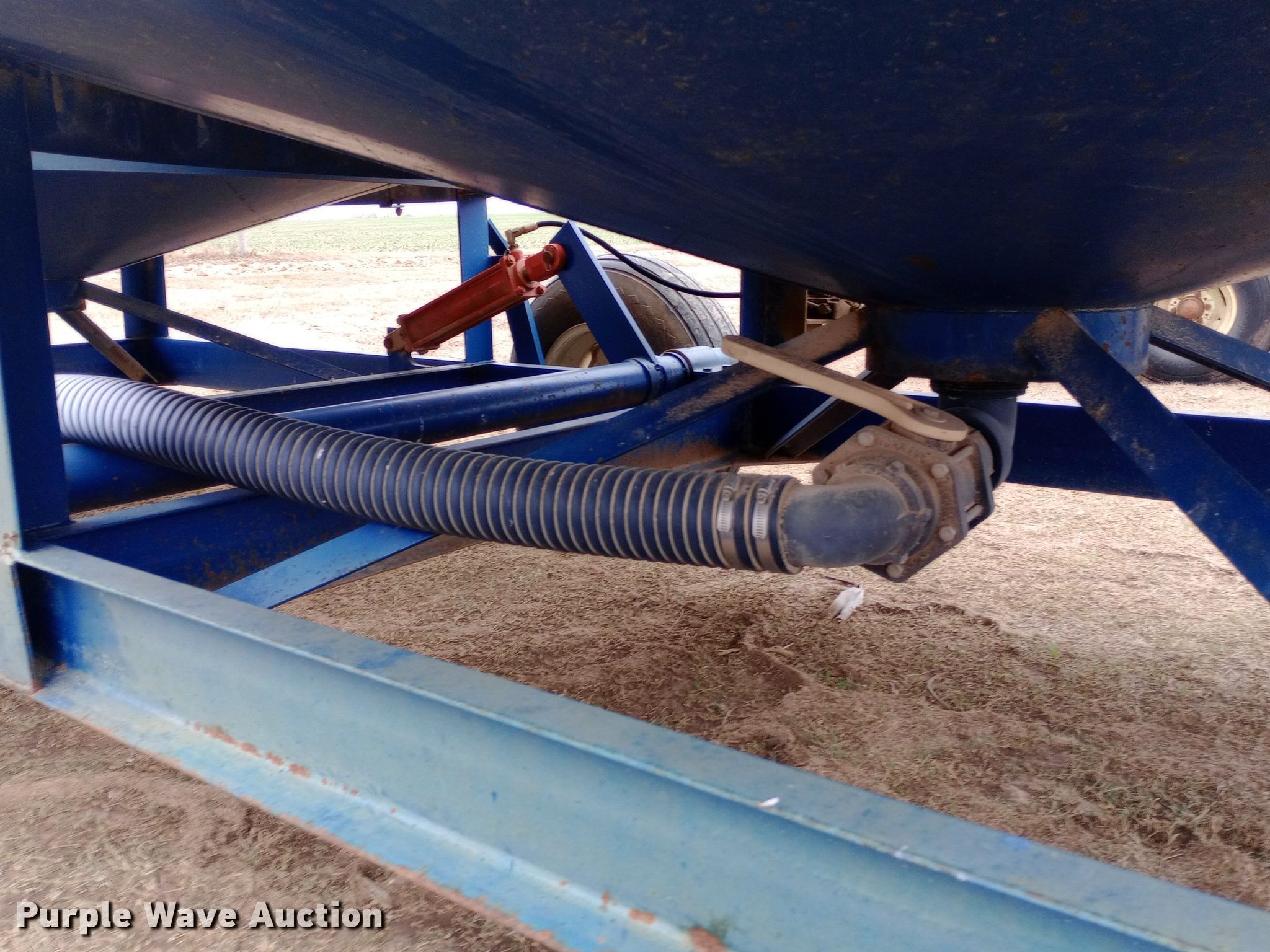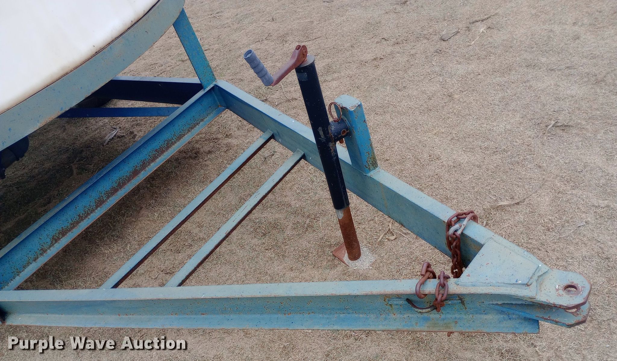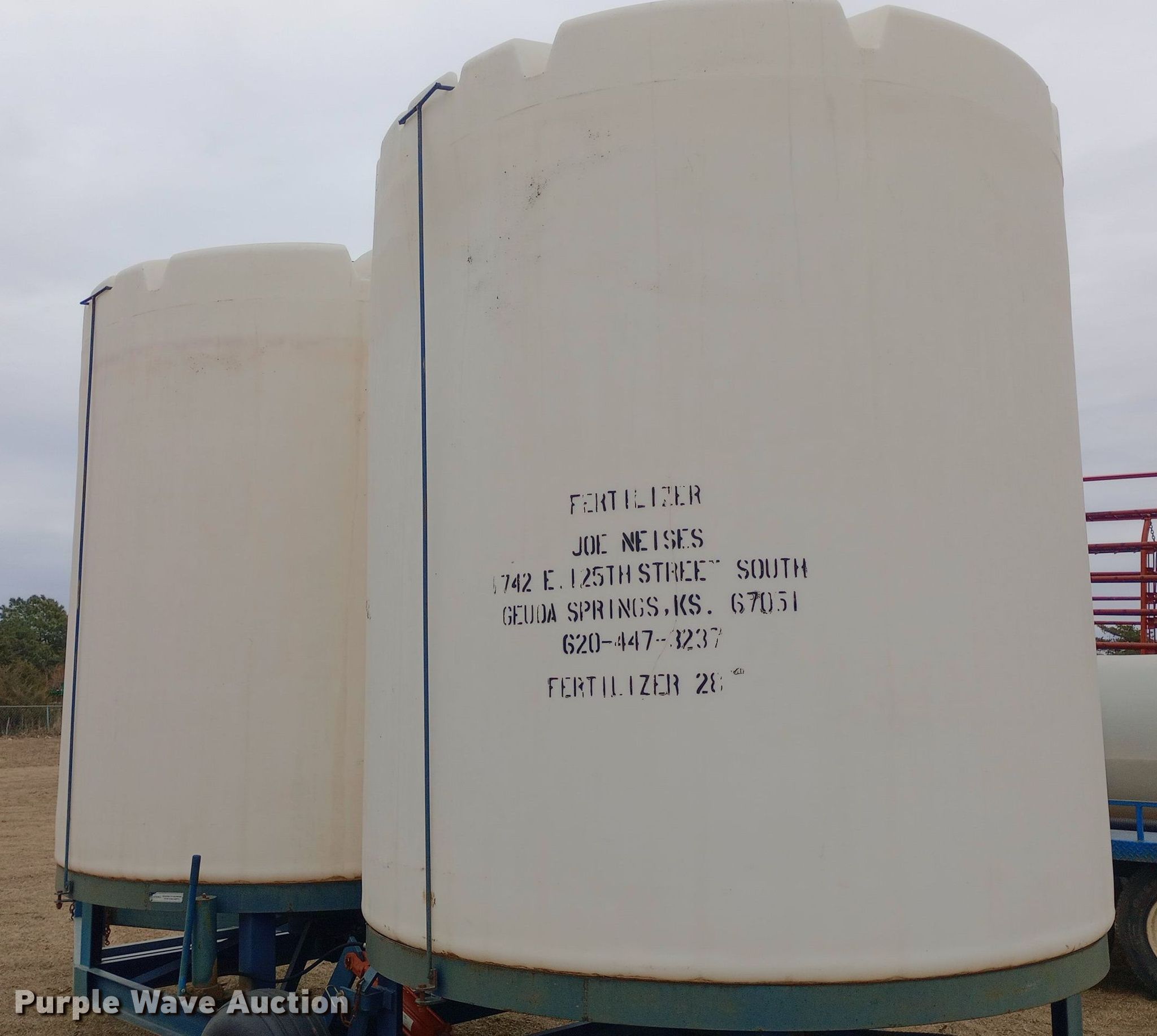 Shop built nurse tank trailer. Dimensions. Overall: 20' L x 92" W. Features Tank type: Poly, (2) tanks Capacity: 3,000 gallons, Total capacity: 6,000 gallons. Chassis Landing gear: Single. Tires Steel wheels, Size: 9.5L-15SL. Transfer of ownership documentation will be a bill of sale. Geuda Springs, KS 67051
