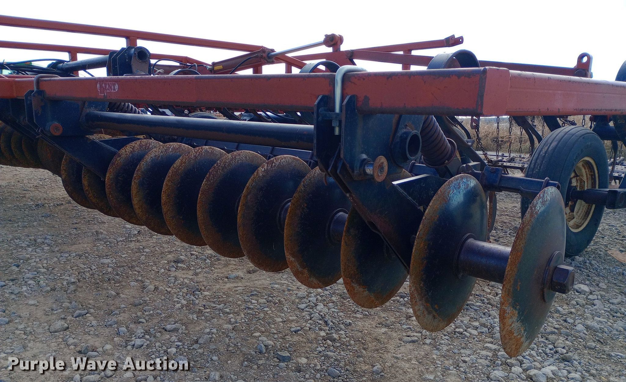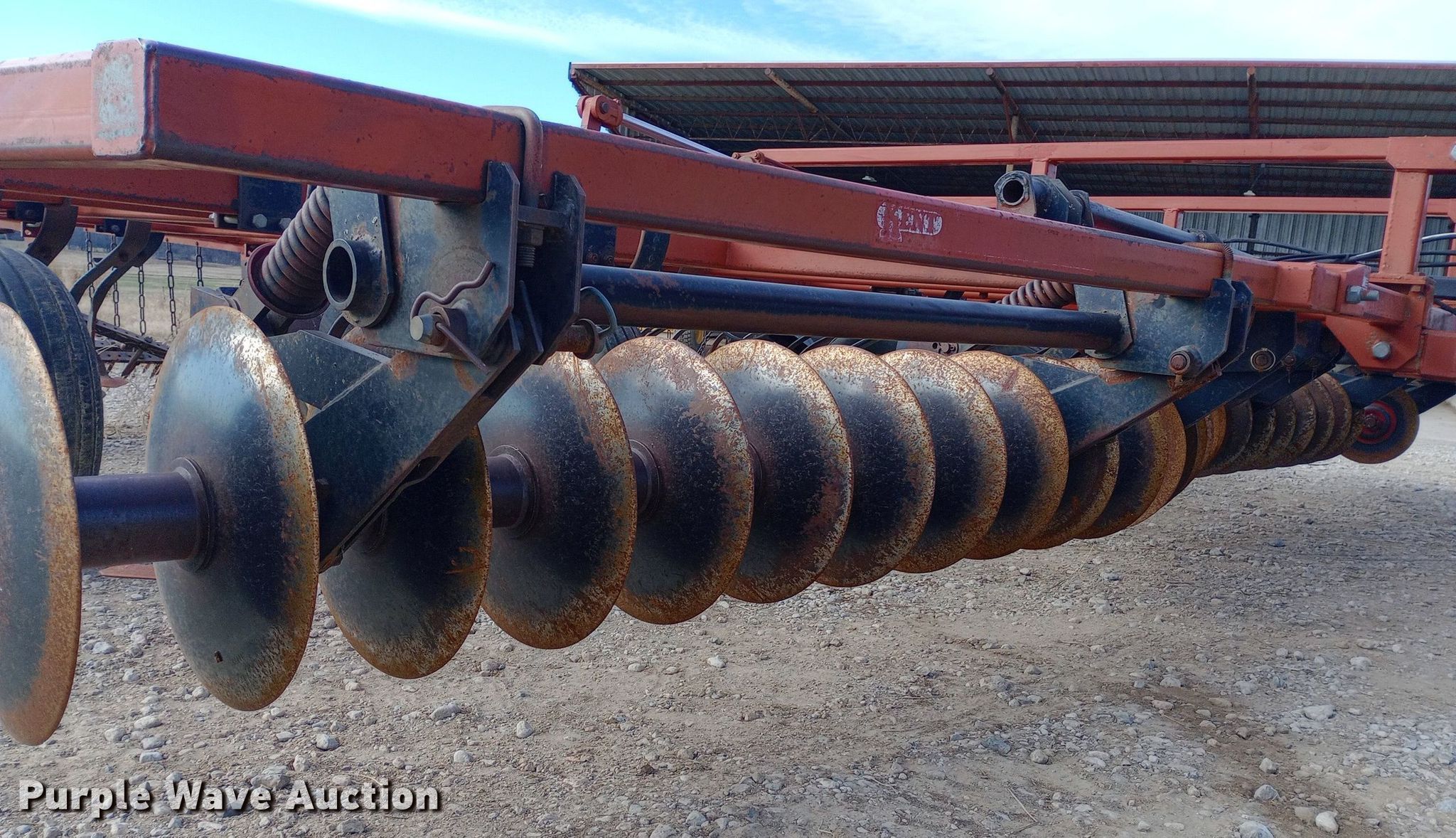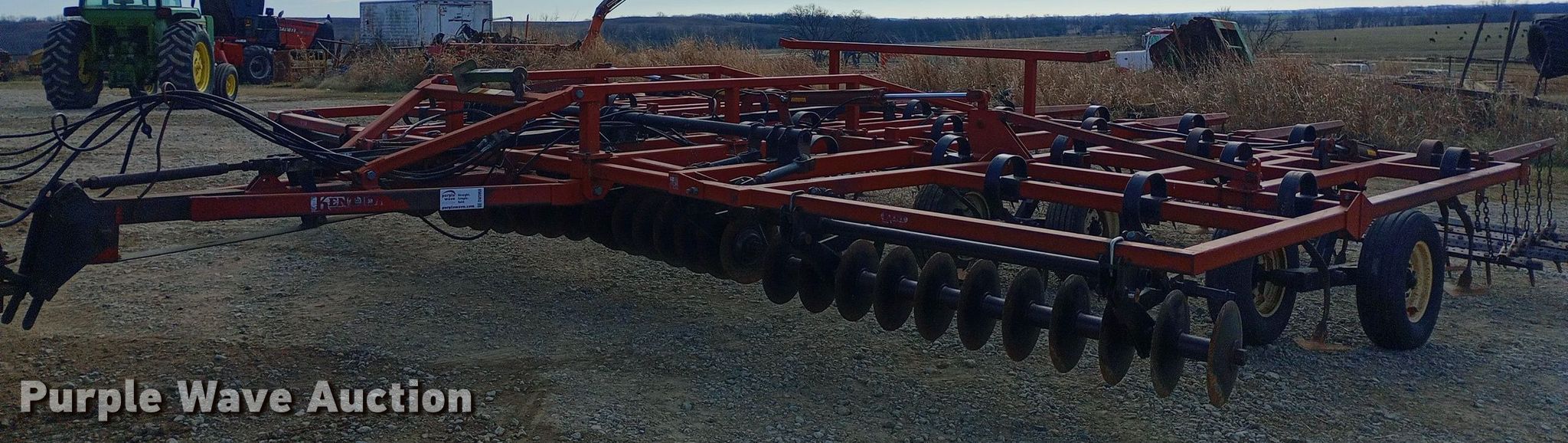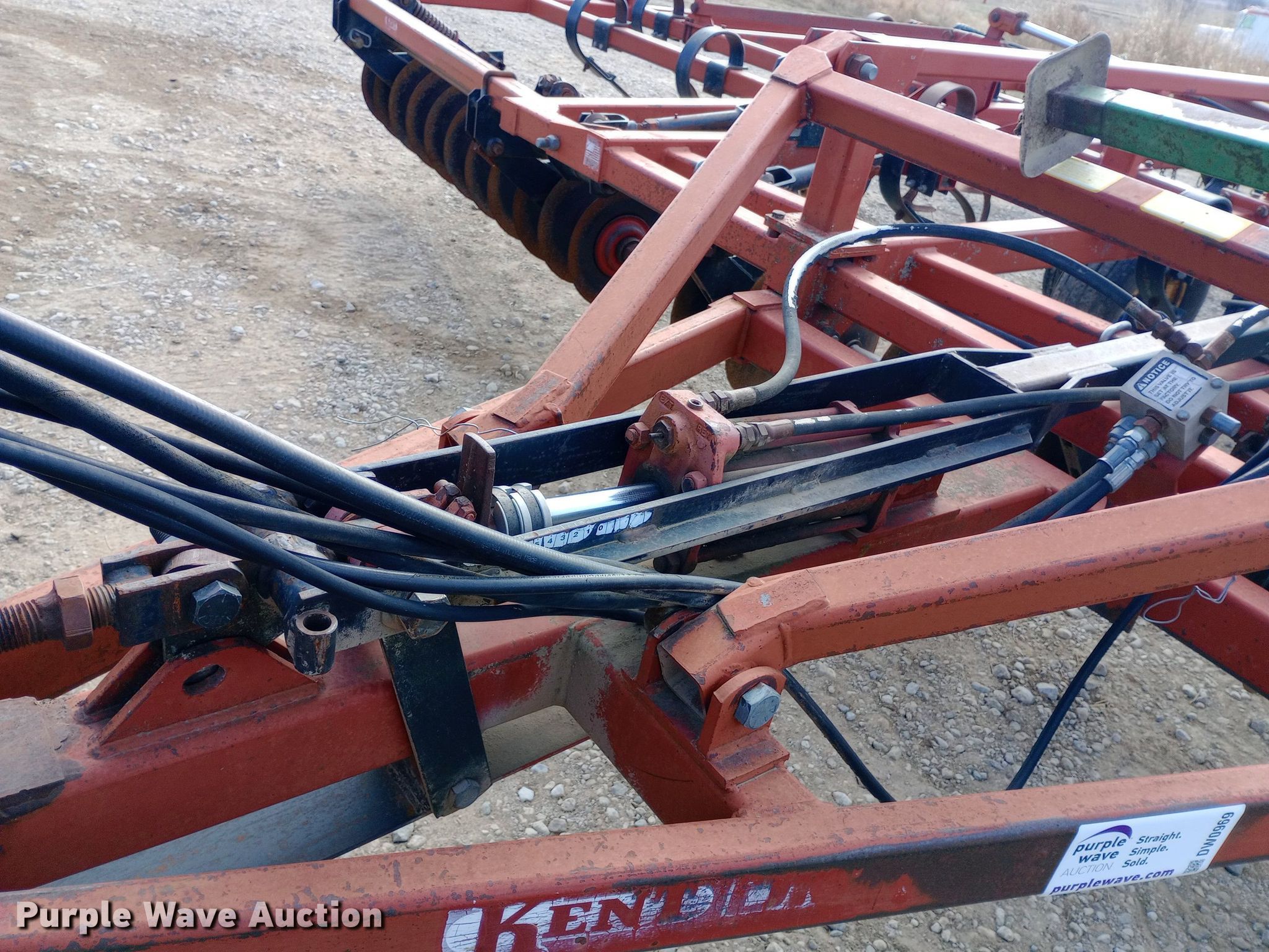 Kent field cultivator. Overall width: 24'. Features Blade diameter Front: 15", Operation Hydraulic lift, Hydraulic fold, Leveler: Hydraulic, Walking tandem axle, Attachments Spike tooth harrow Harrow bars: 5.. Tires Tire size: 9.5L-15. Notes Tractor not included. Hendricks Enterprises, Inc.. Howard, KS 67349