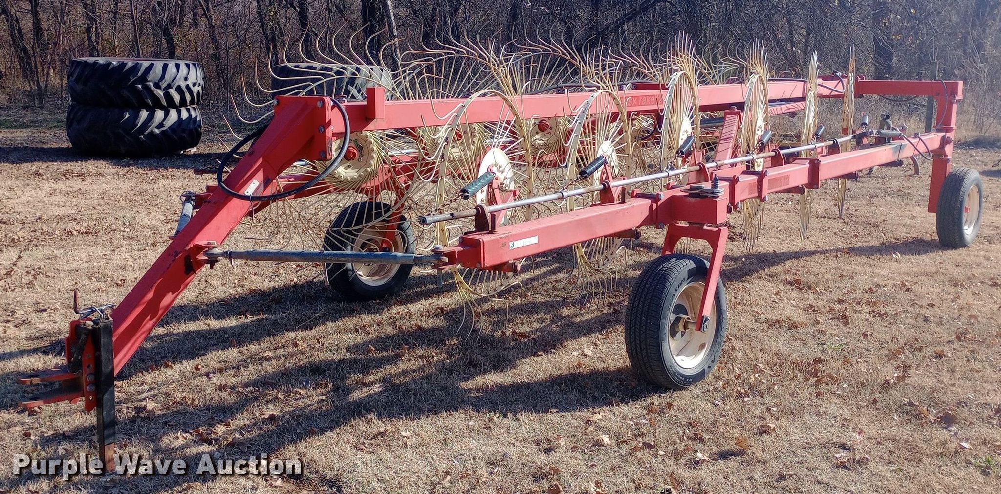 Farm King Easy Rake 12 hay rake. Serial: 108023. Features Width: 24', Wheels: 12 Diameter: 56", Hydraulic lift, Hydraulic fold. Tires Size: 225/75D15. Newkirk, OK 74647
