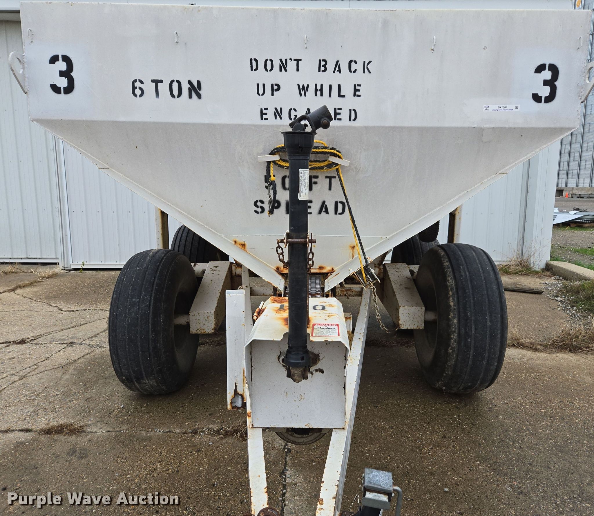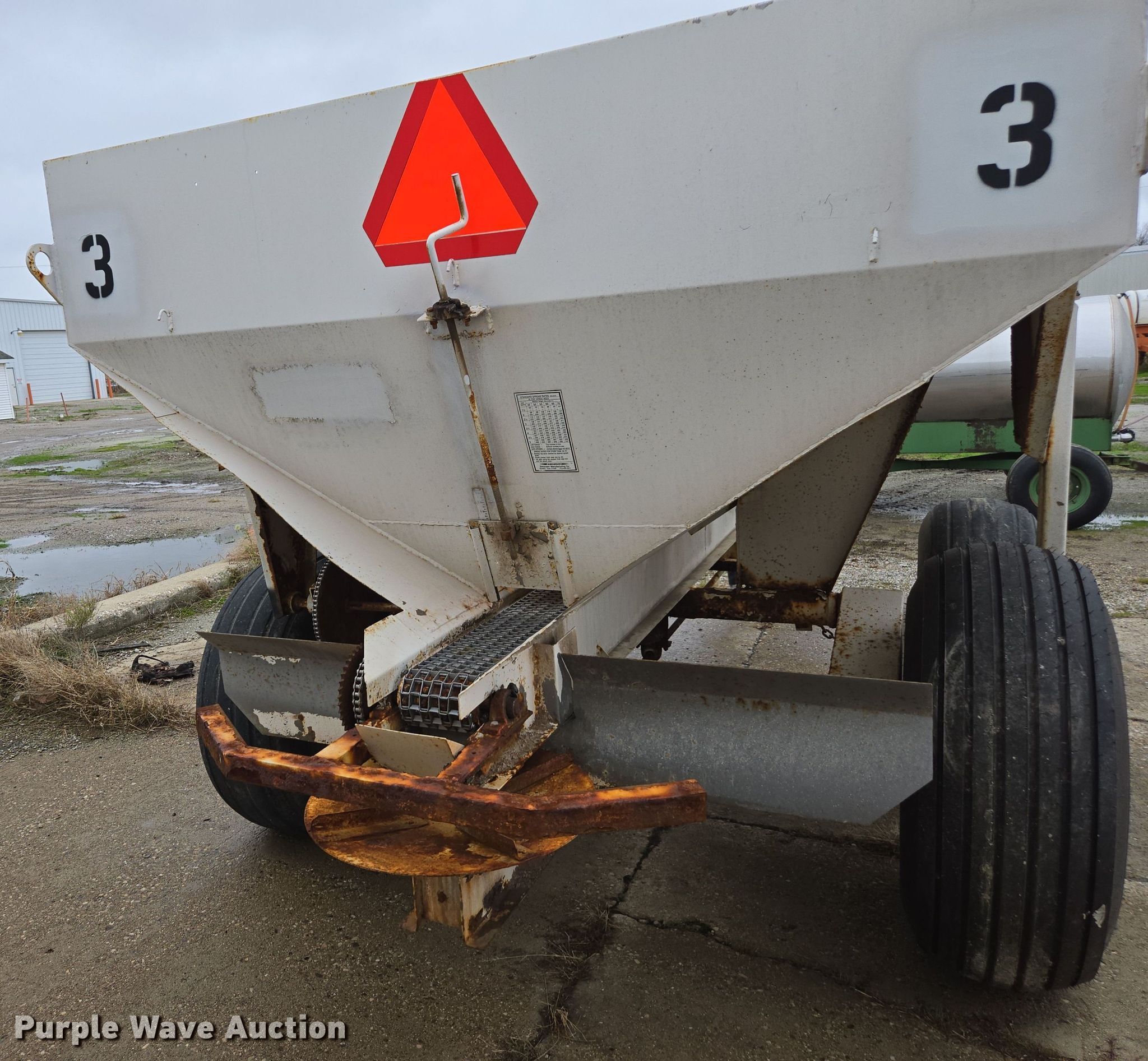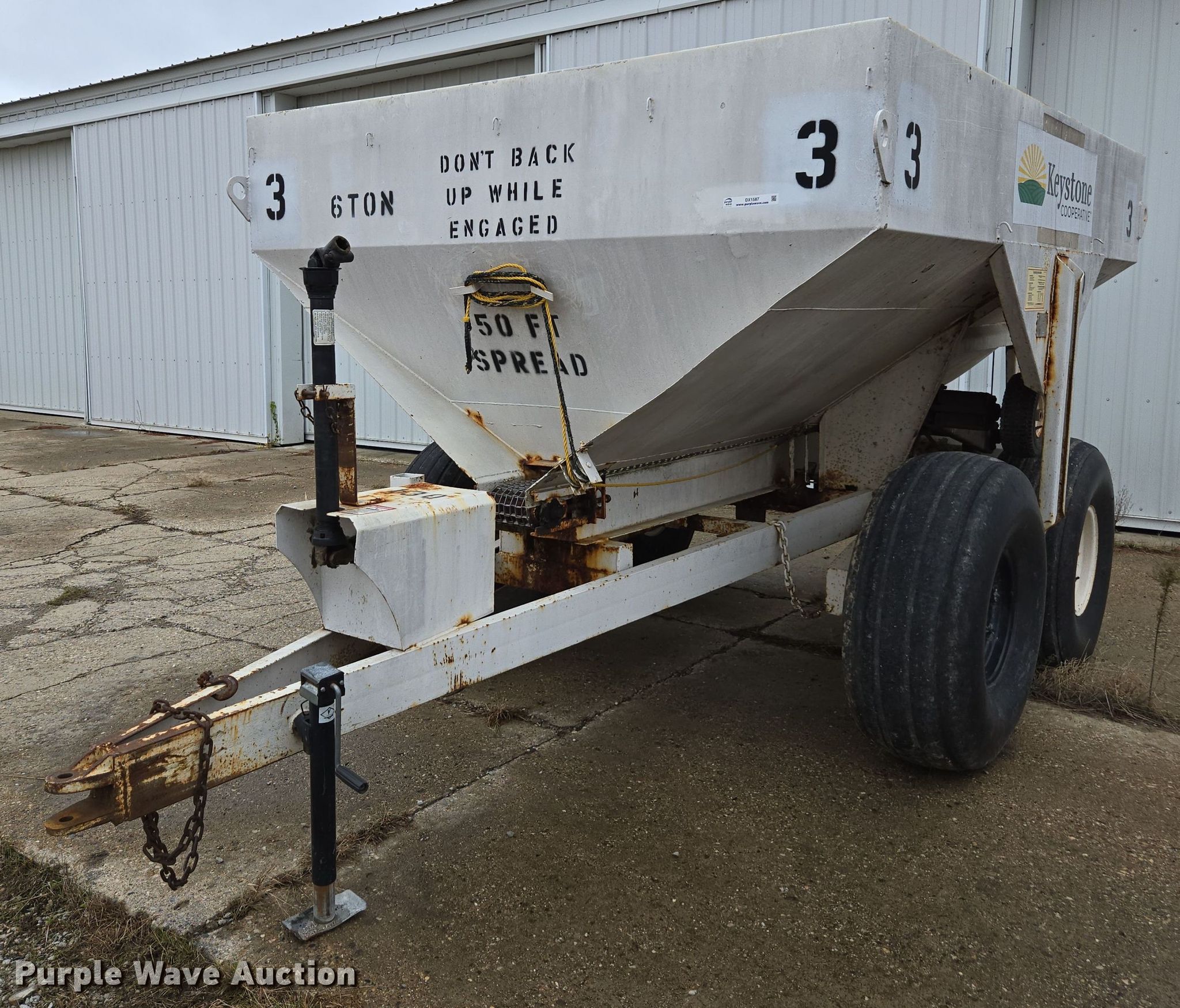 Western SMC2064S spreader. Serial: 1100S13540. Features PTO: 540, Dry fertilizer spreader Tons capacity: 6, Ground driven, Width: 6". Tires Size: 16.5-16.1. Keystone Cooperative. Bremen, IN 46506