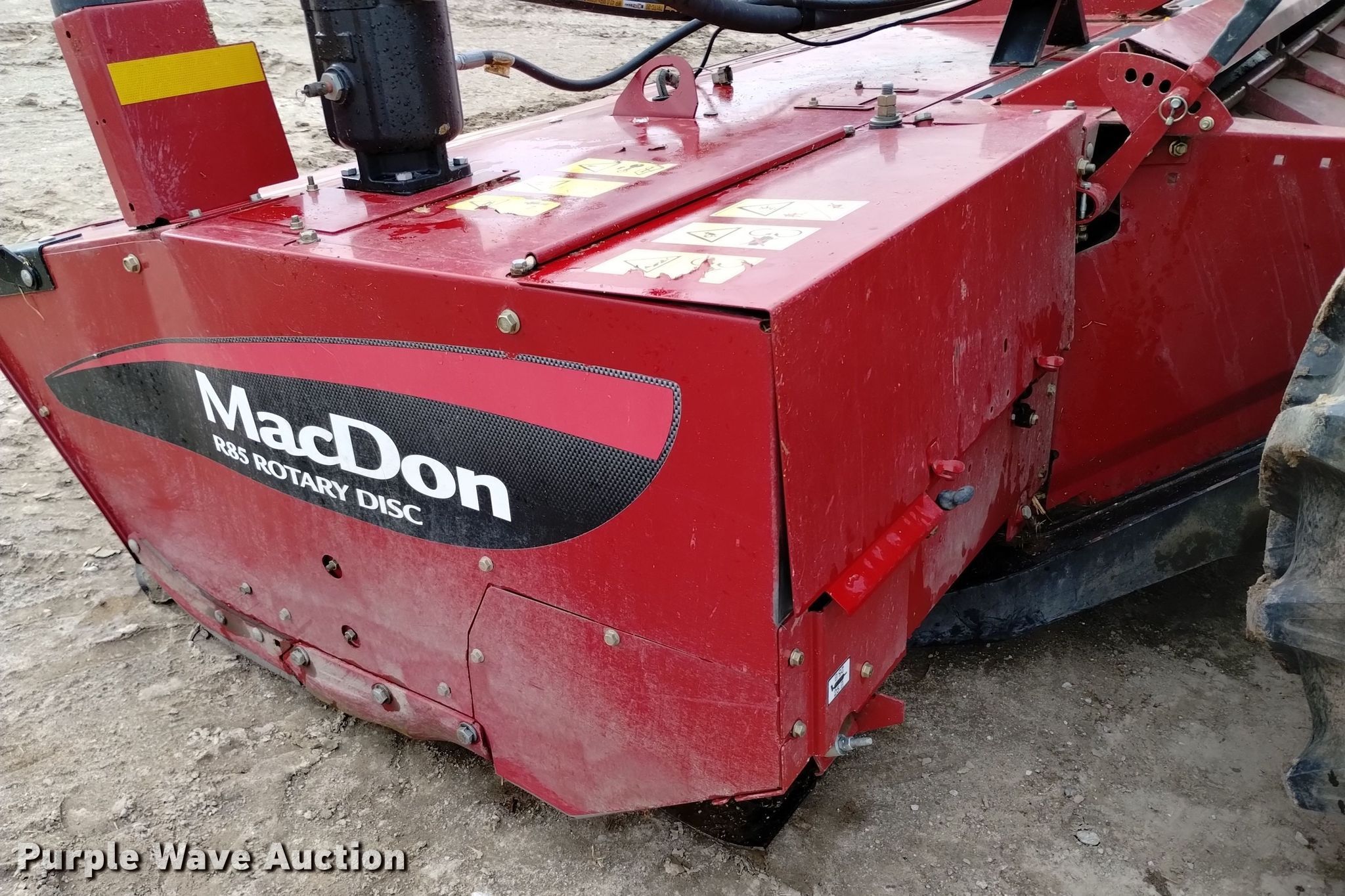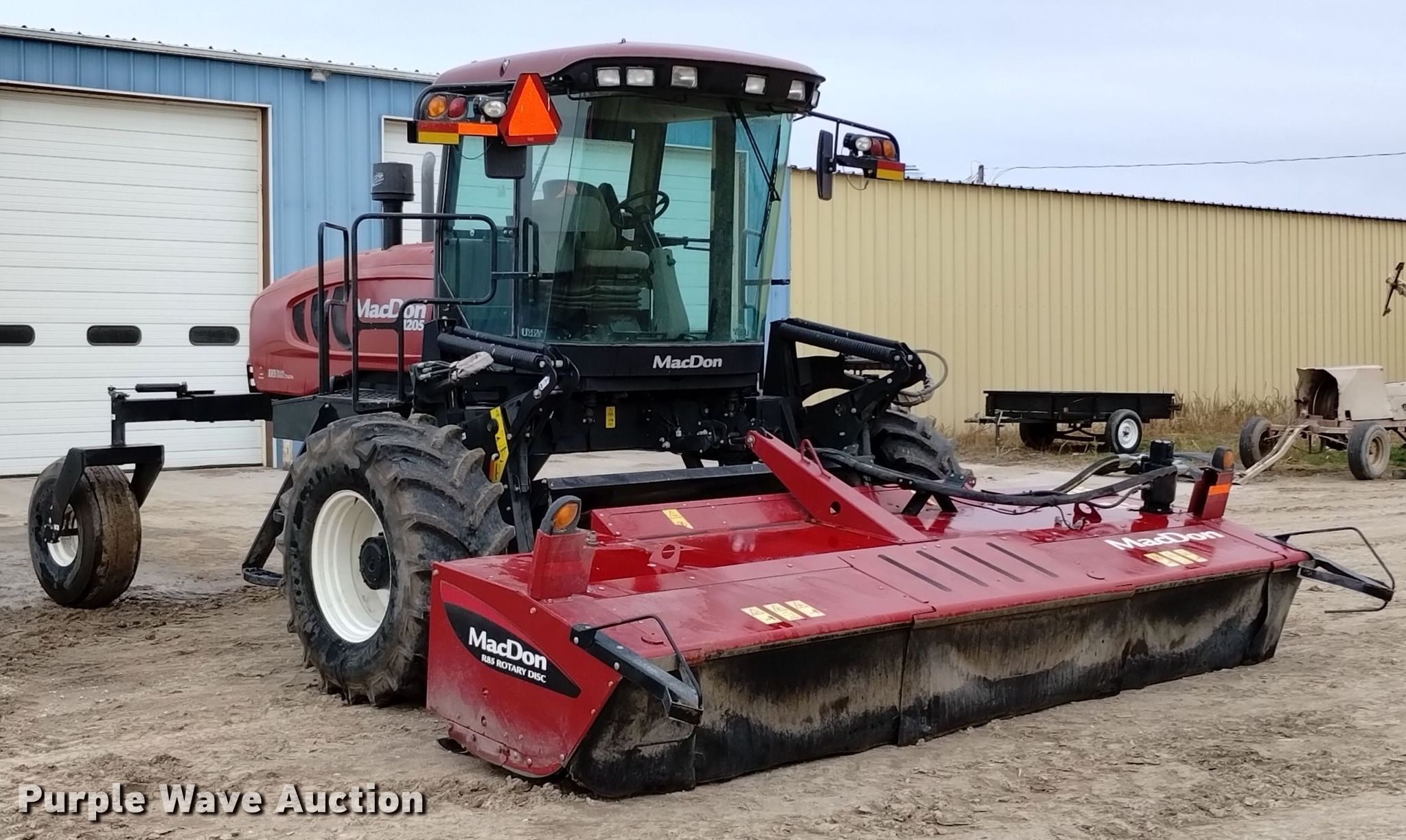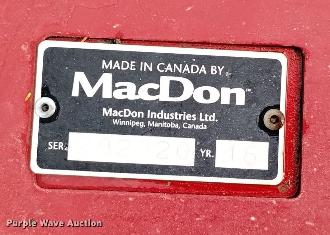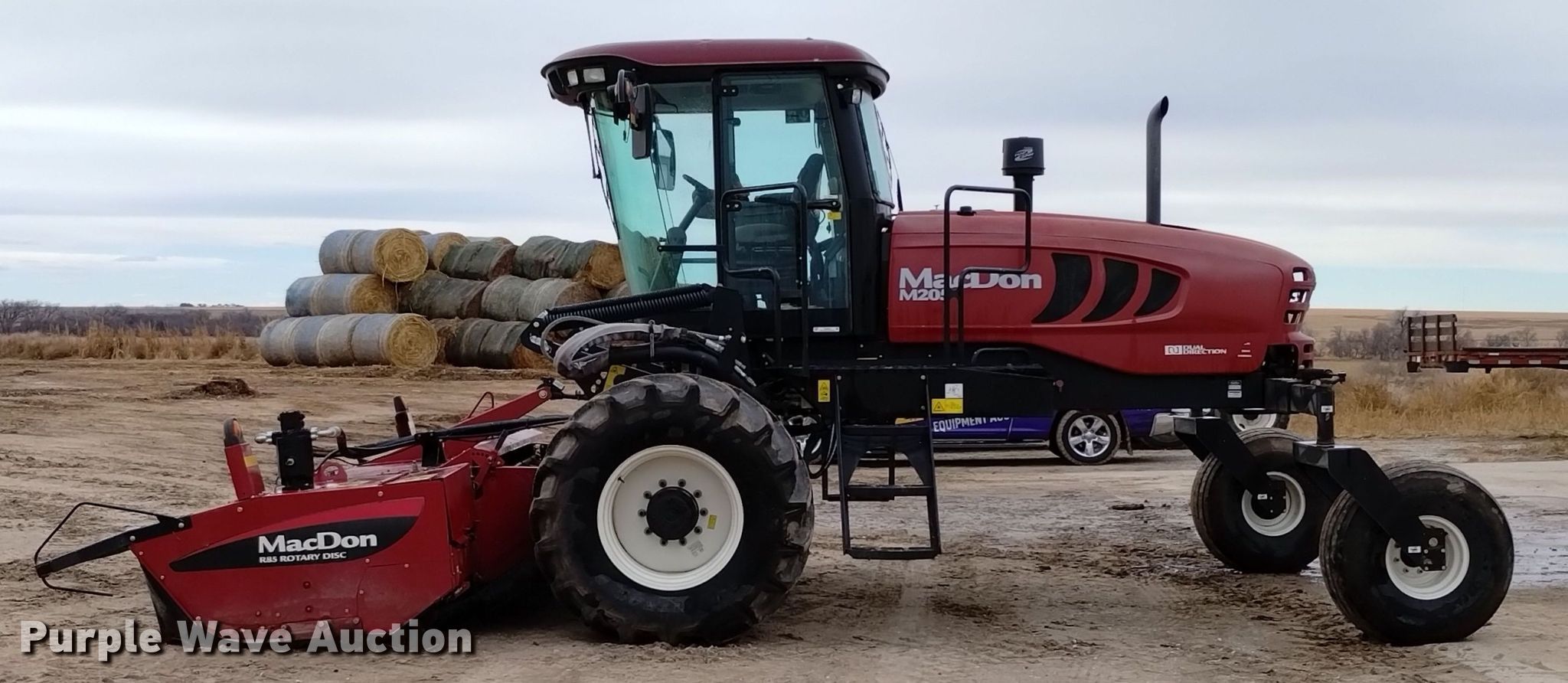 2016 MacDon M205 swather / windrower. Engine hours: 596 on meter, Header hours: 425 on meter, Serial: 292020. Engine Cylinders: 6, Fuel type: Diesel. Transmission Hydrostatic, Two speed travel. Operators station AC, Heat. Features Head Disc, MacDon R85, Width: 16', Hydraulic head tilt, Power reverser, Conditioners: Steel/ steel. Tires Front: 600/65R28, Rear: 16.5L-16.1. Sauvage Family Farm Retirement. Danbury, NE 69026