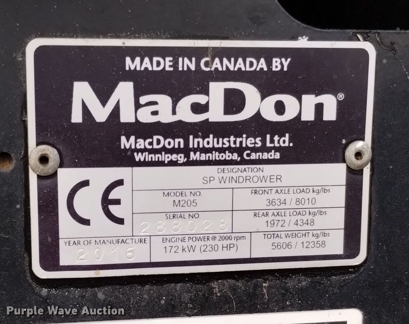 Purple Wave is selling a used Windrower Self Propelled in Nebraska. This item is a 2016 MacDon M205 swather / windrower with the following: Engine hours: 596 on meter, Header hours: 425 on meter, Serial: 292020