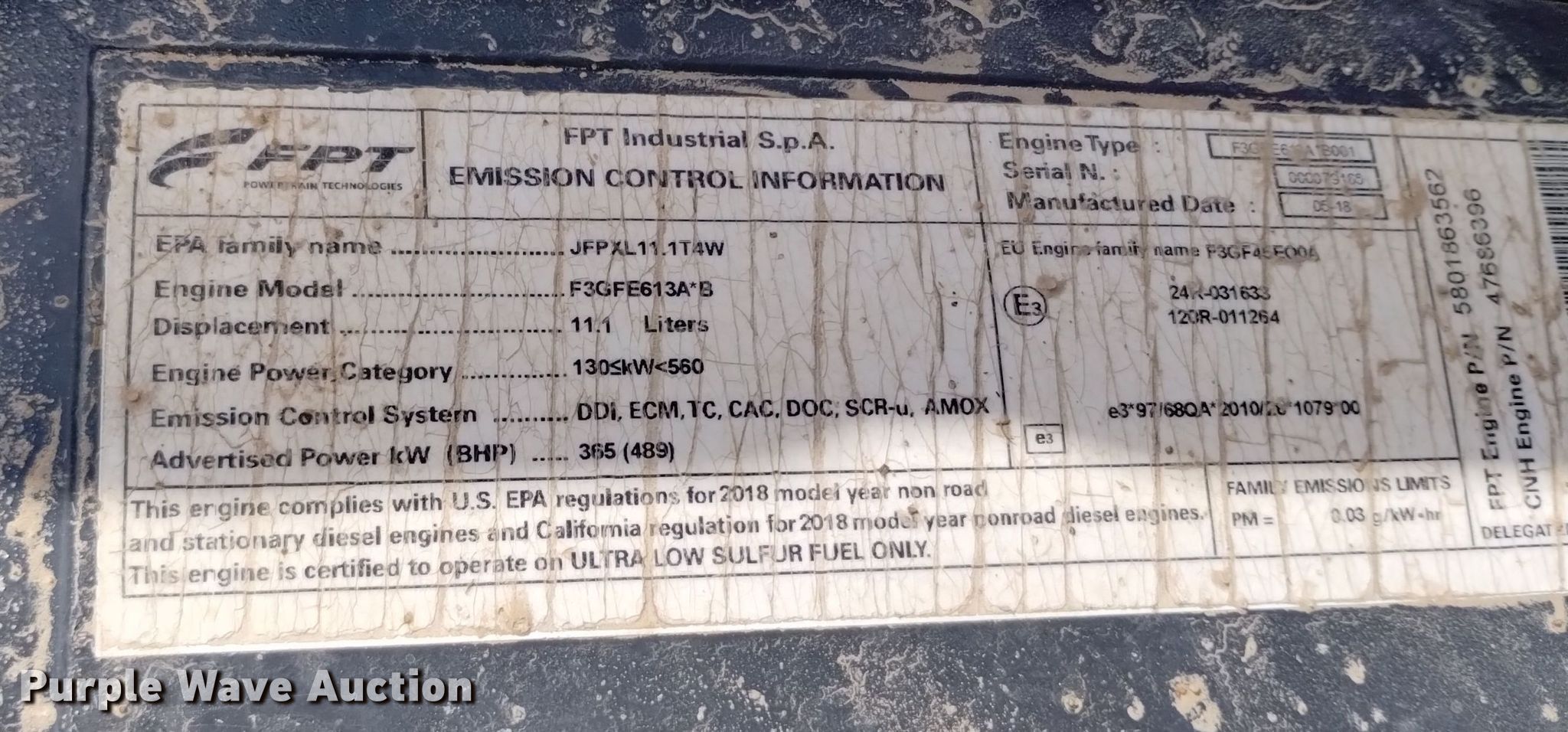 2018 Case IH 7240 combine. Engine hours: 787 on meter, Separator hours: 580 on meter, Serial: YJG23683J. Engine FPT F3GFE613A*B, Serial: 000079165, Displacement: 11.1L, Cylinders: 6, Fuel type: Diesel, HP: 365. Transmission Hydrostatic. Chassis Differential lock. Interior AC, Heat, Monitor Case IH AFS Pro 700. Features Operator manual, Single point header coupler, Feederhouse: Lateral tilt, Variable speed, Reverser, Concaves: Round, Small wire, Chaff spreader, Straw chopper, Bin: Extensions, Power folding bin, Rear hitch. Tires Front: 520/85R42, Rear: 600/70R28, Duals. Sauvage Family Farm Retirement. Danbury, NE 69026
