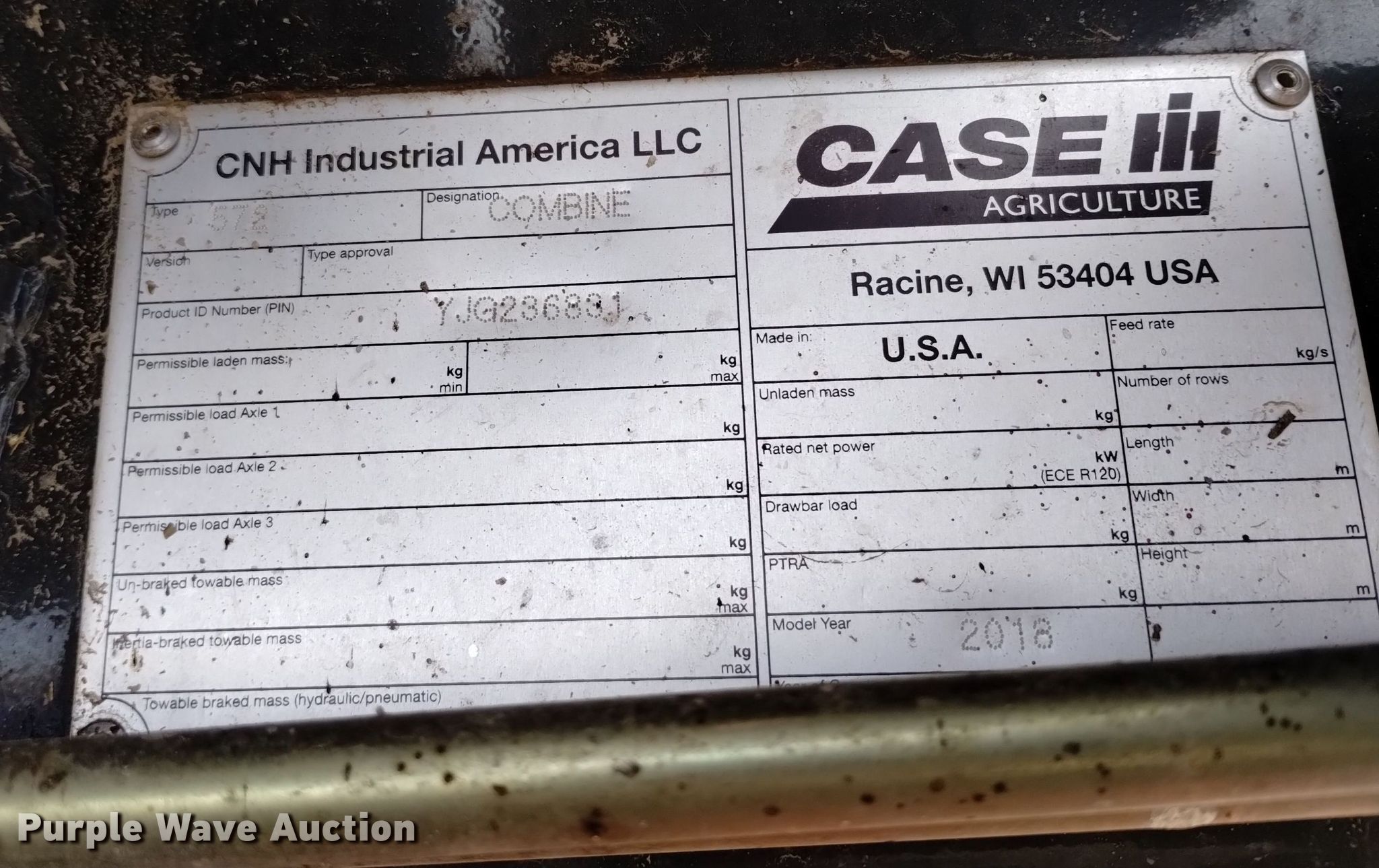 Purple Wave is selling a used Combine in Nebraska. This item is a 2018 Case IH 7240 combine with the following: Engine hours: 787 on meter, Separator hours: 580 on meter, Serial: YJG23683J