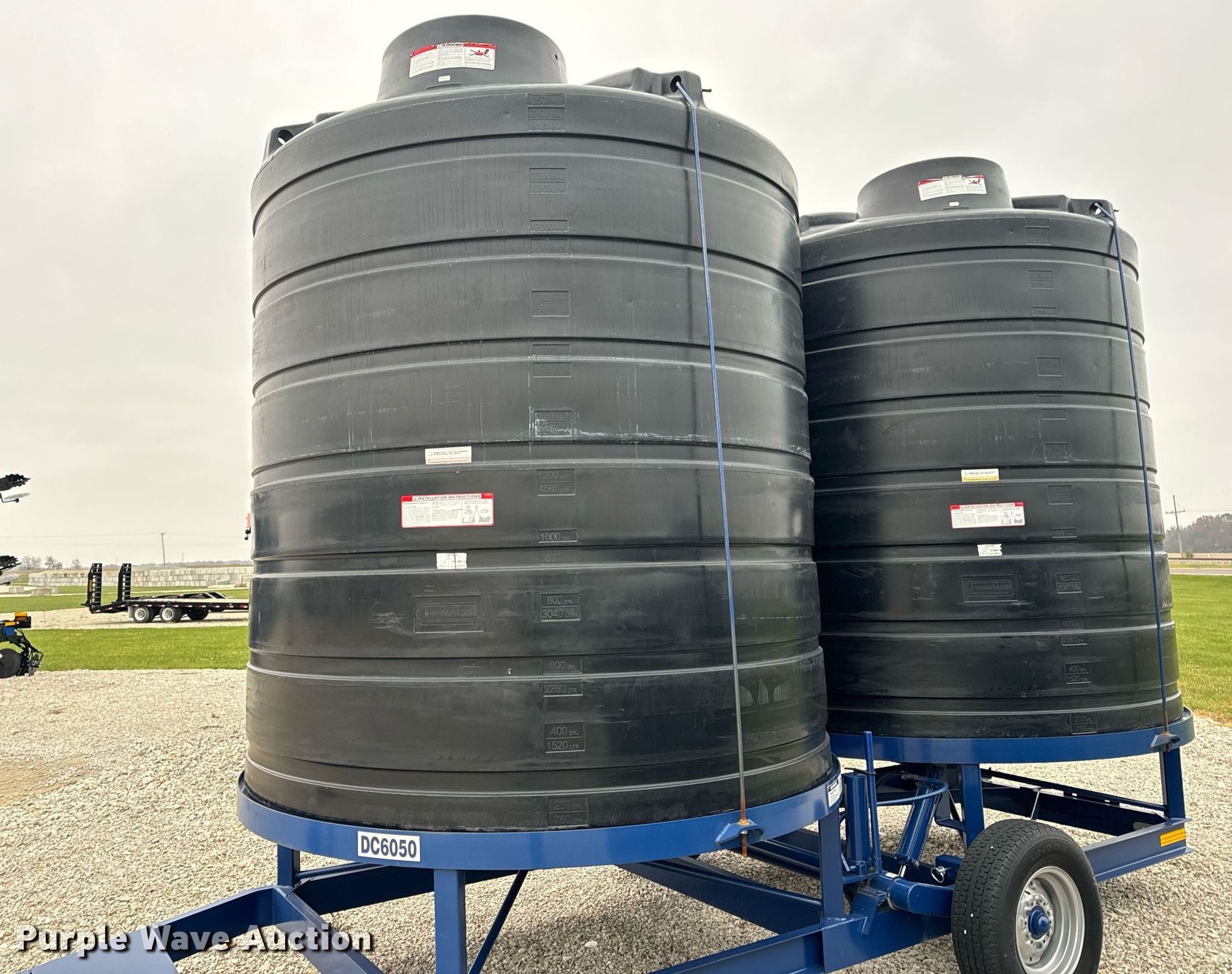 Duo-Lift DC6050 double cone nurse tank trailer. Serial: 10180121. Dimensions Overall: 21' 3" L x 96" W. Features Tank type: (2) poly Capacity: 2,500 gallons. Chassis Landing gear: Single, Axle: Single, Hitch: Pin. Tires Steel wheels, Size: ST225/75R15. Notes Unused. Transfer of ownership documentation will be a bill of sale. Parallel Ag. Montgomery City, MO 63361