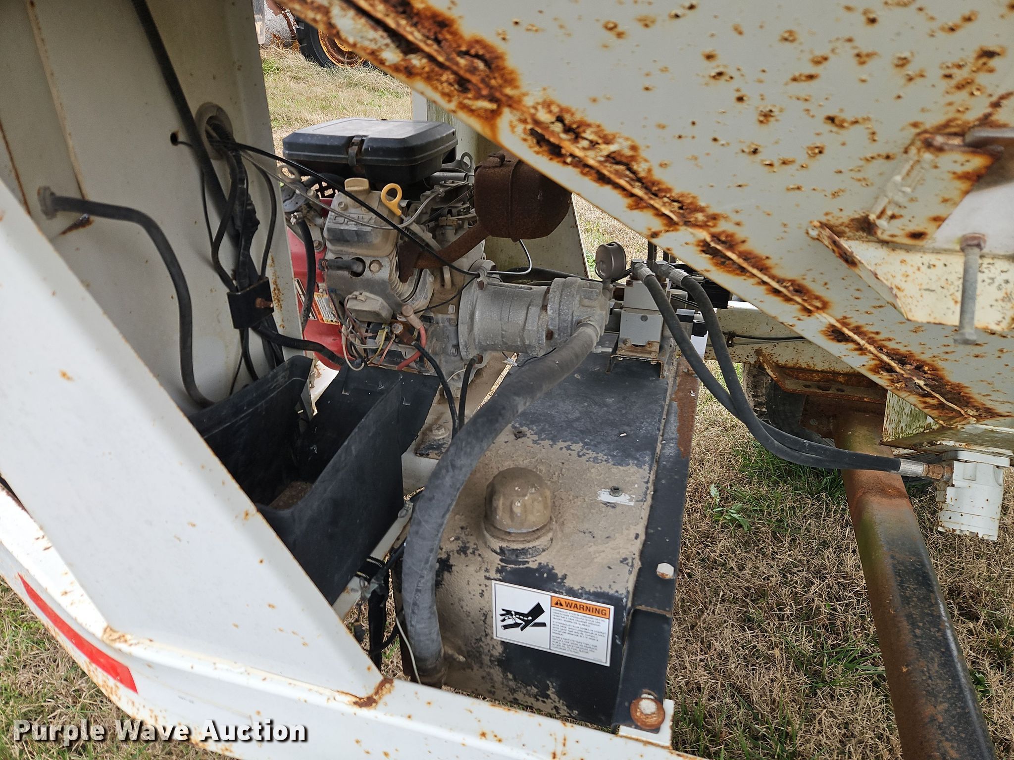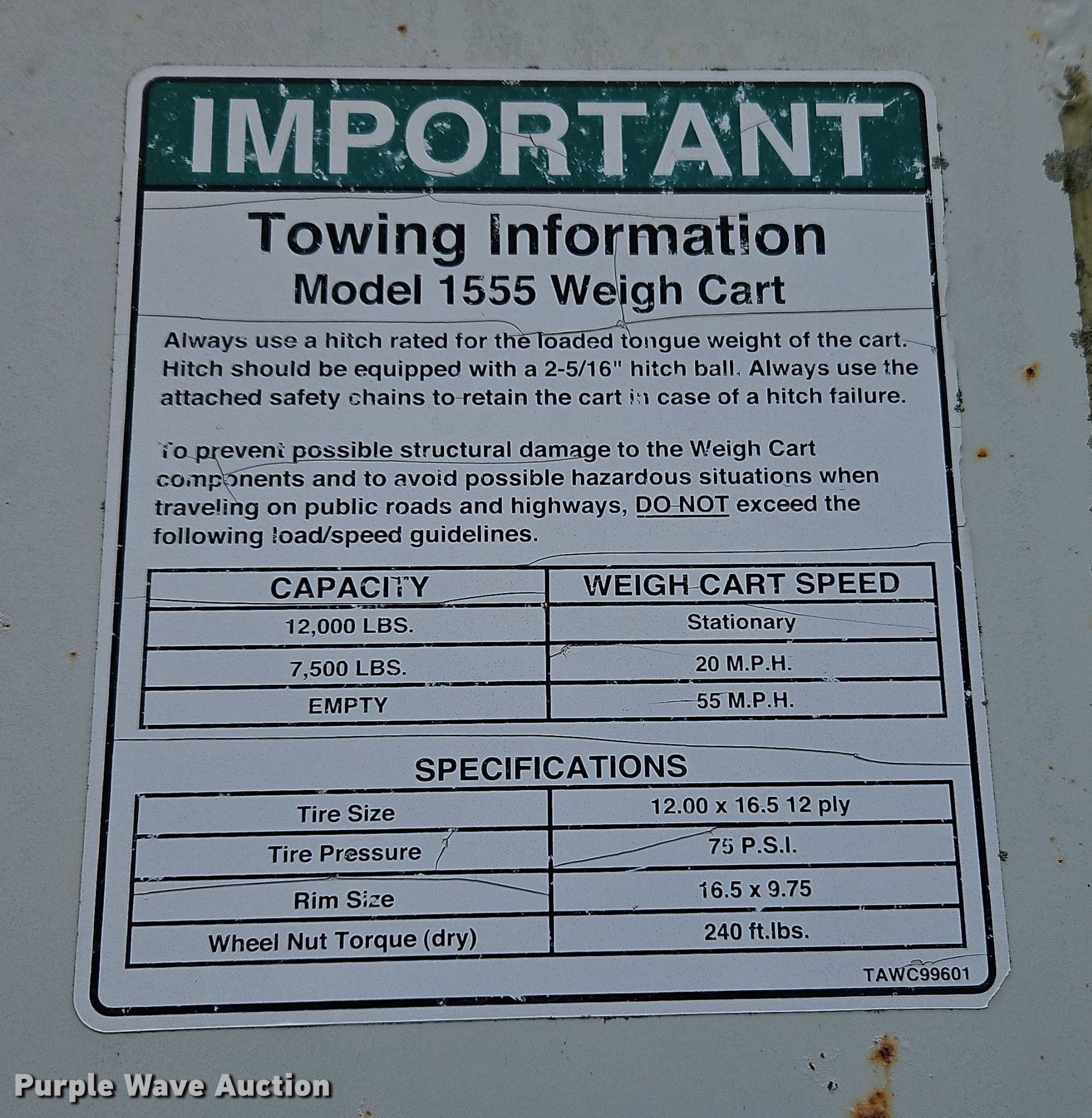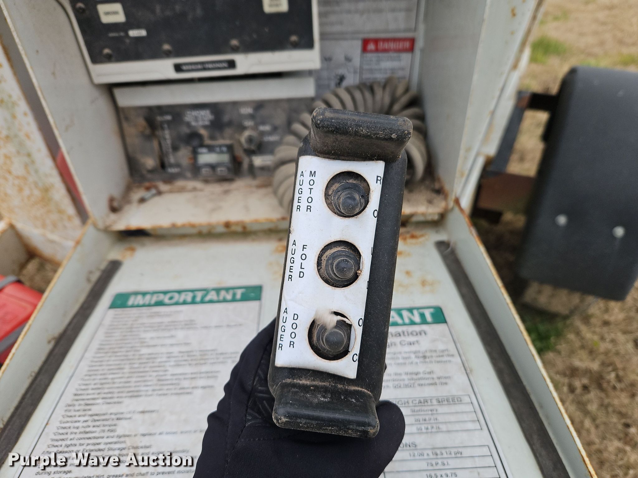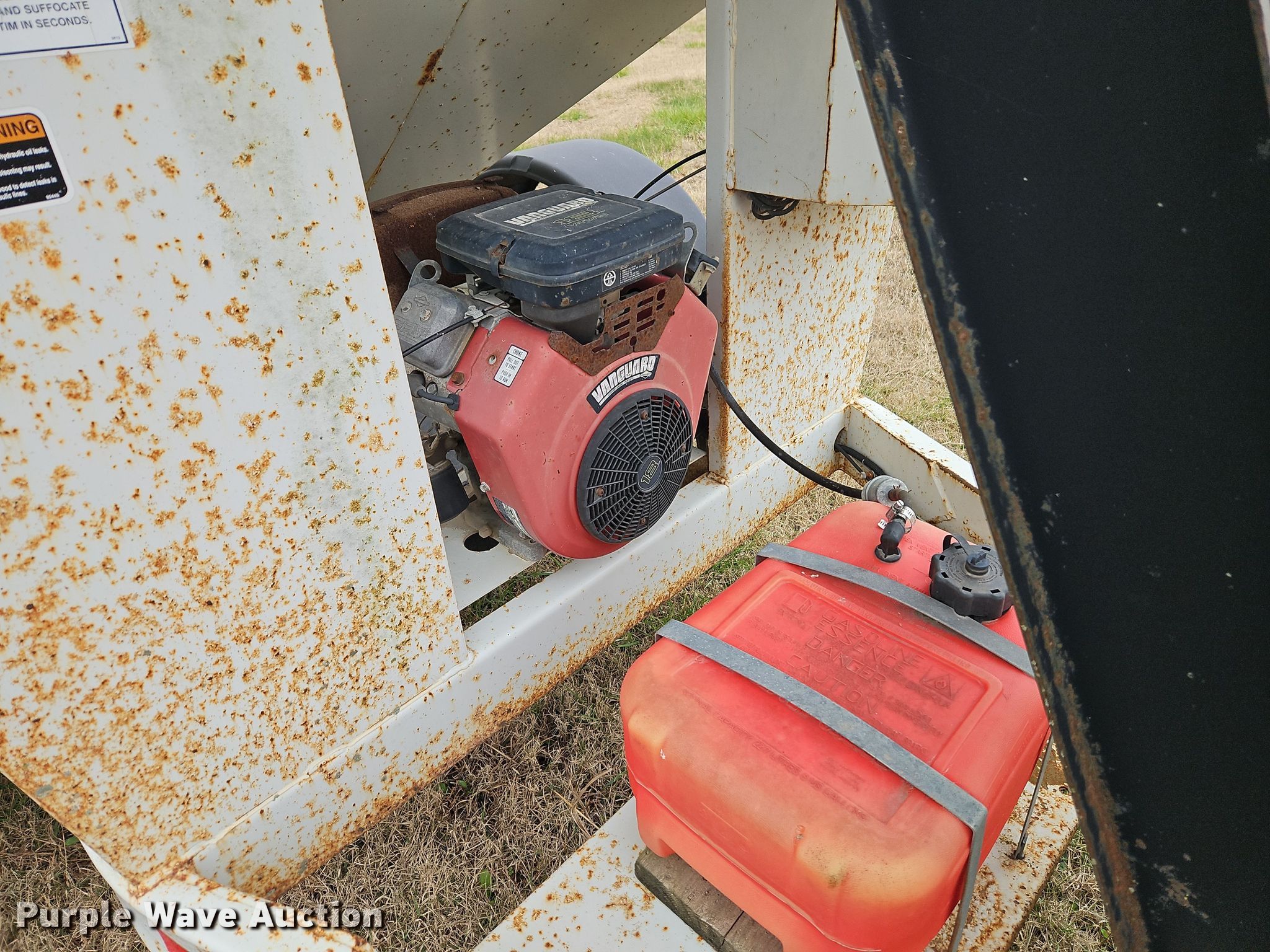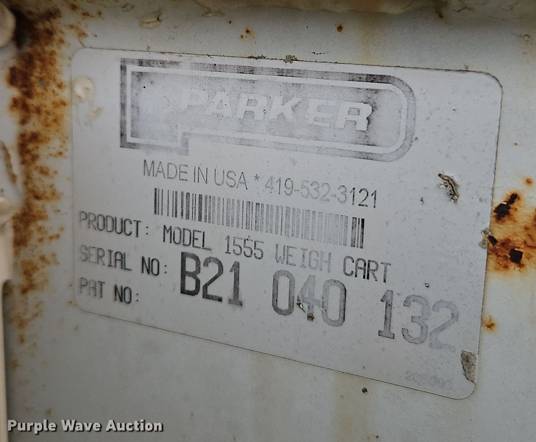 Parker 1555 seed tender. Engine. Briggs & Stratton Vanguard, Cylinders: 1, Fuel type: Gas, HP: 18. Features Lift: Hydraulic, Capacity: 6 tons, Auger diameter: 8", Shut-off gate: Hydraulic, Scales Weigh-Tronix 715, Monitor, Sight glass, Compartments: 1, Ball hitch size: 2 5/16". Tires Size: 12-16.5. MFA AgChoice. Weir, KS 66781