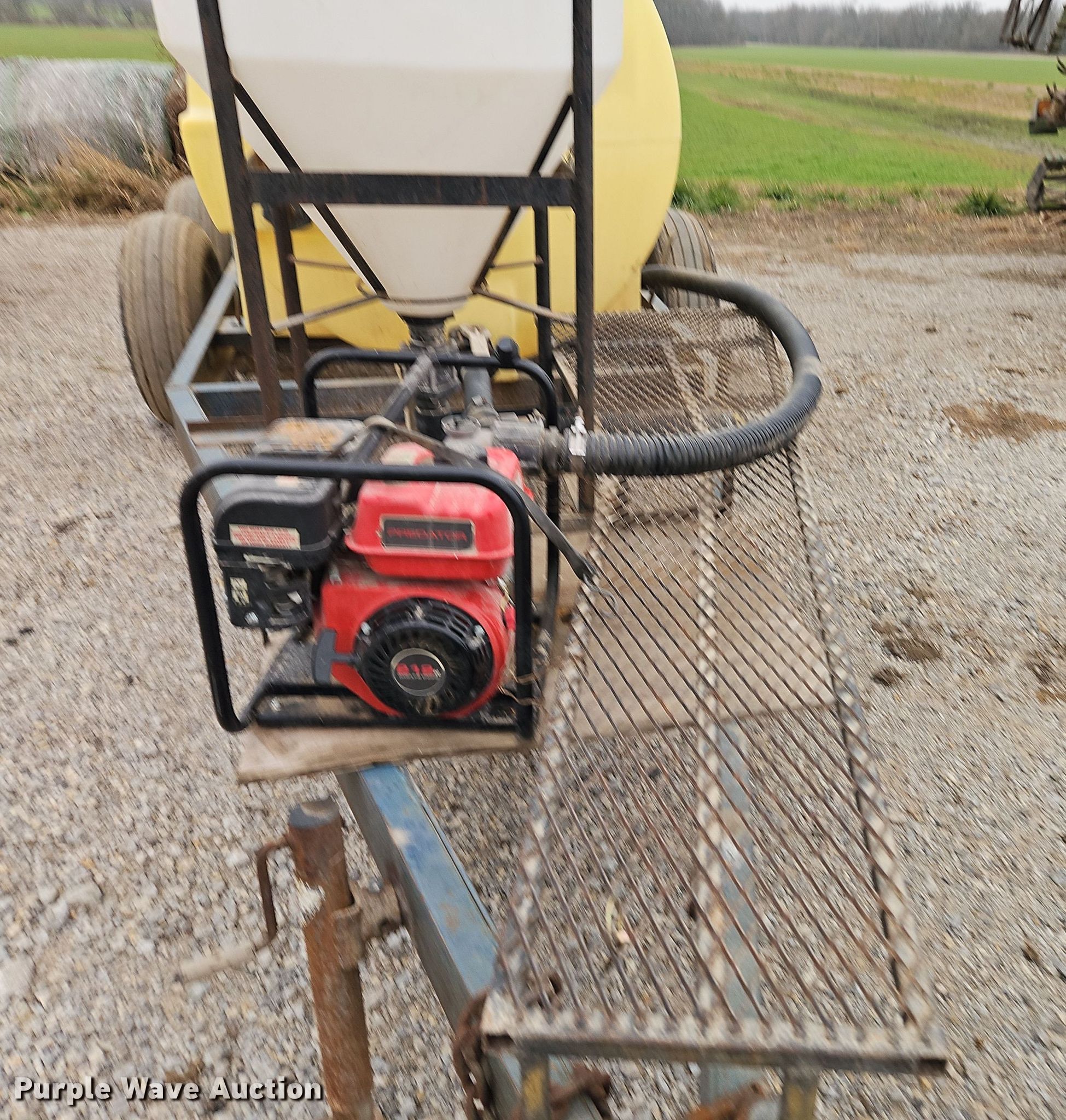 Shop built nurse tank trailer. Dimensions. Overall: 21' L x 86" W. Features Tank type: Poly Capacity: 1,025 gallons, Induction tank Capacity: 85 gallons, Compartments: 1, Outlet valves: 1 Size: 2.5", Pump Predator, Outlet size: 2.5". Chassis Landing gear: Single, Suspension: Spring, Axles: Tandem. Tires Steel wheels, Size: 11L-15. Transfer of ownership documentation will be a bill of sale. Segebartt Farms. Hepler, KS 66746