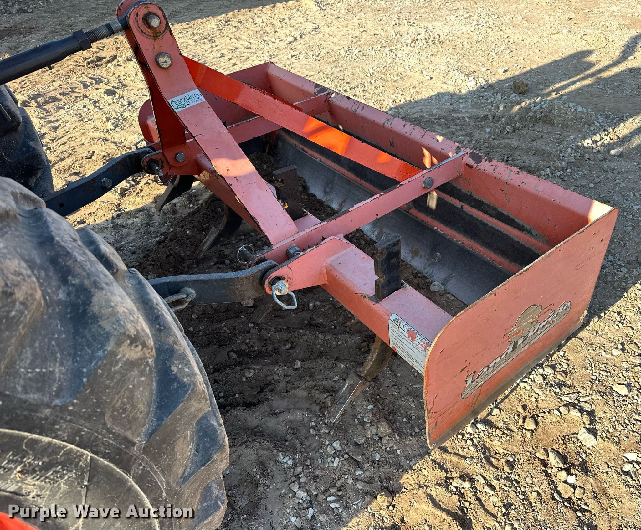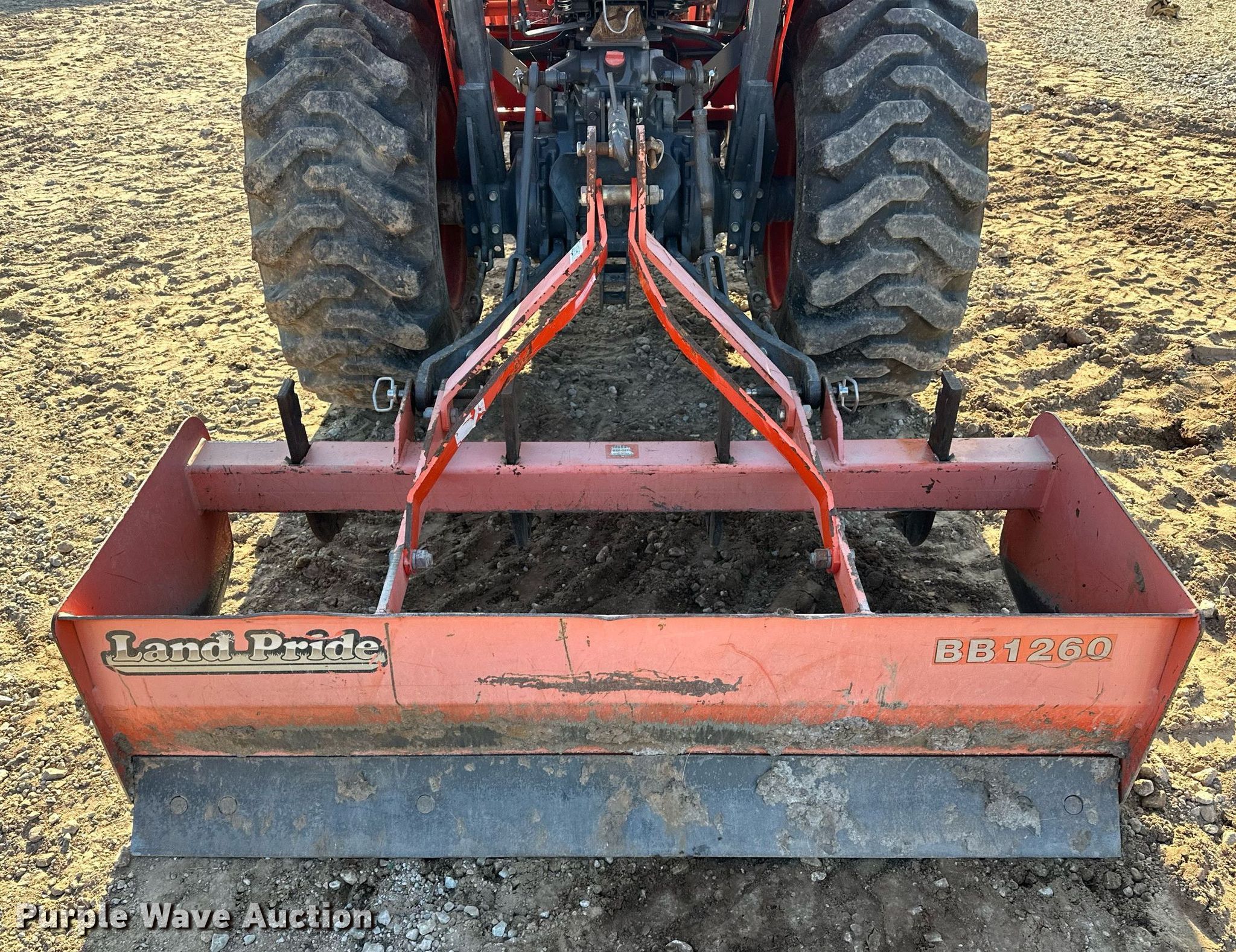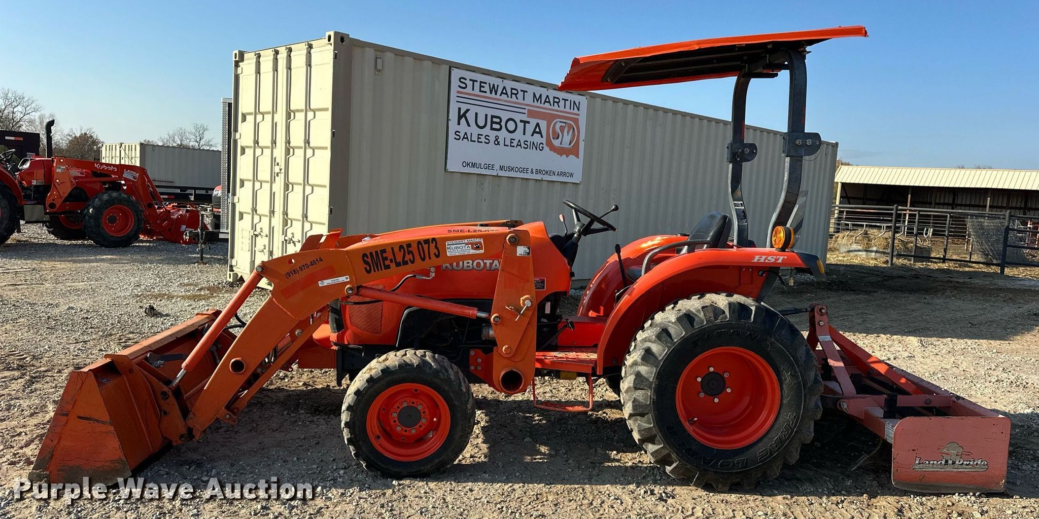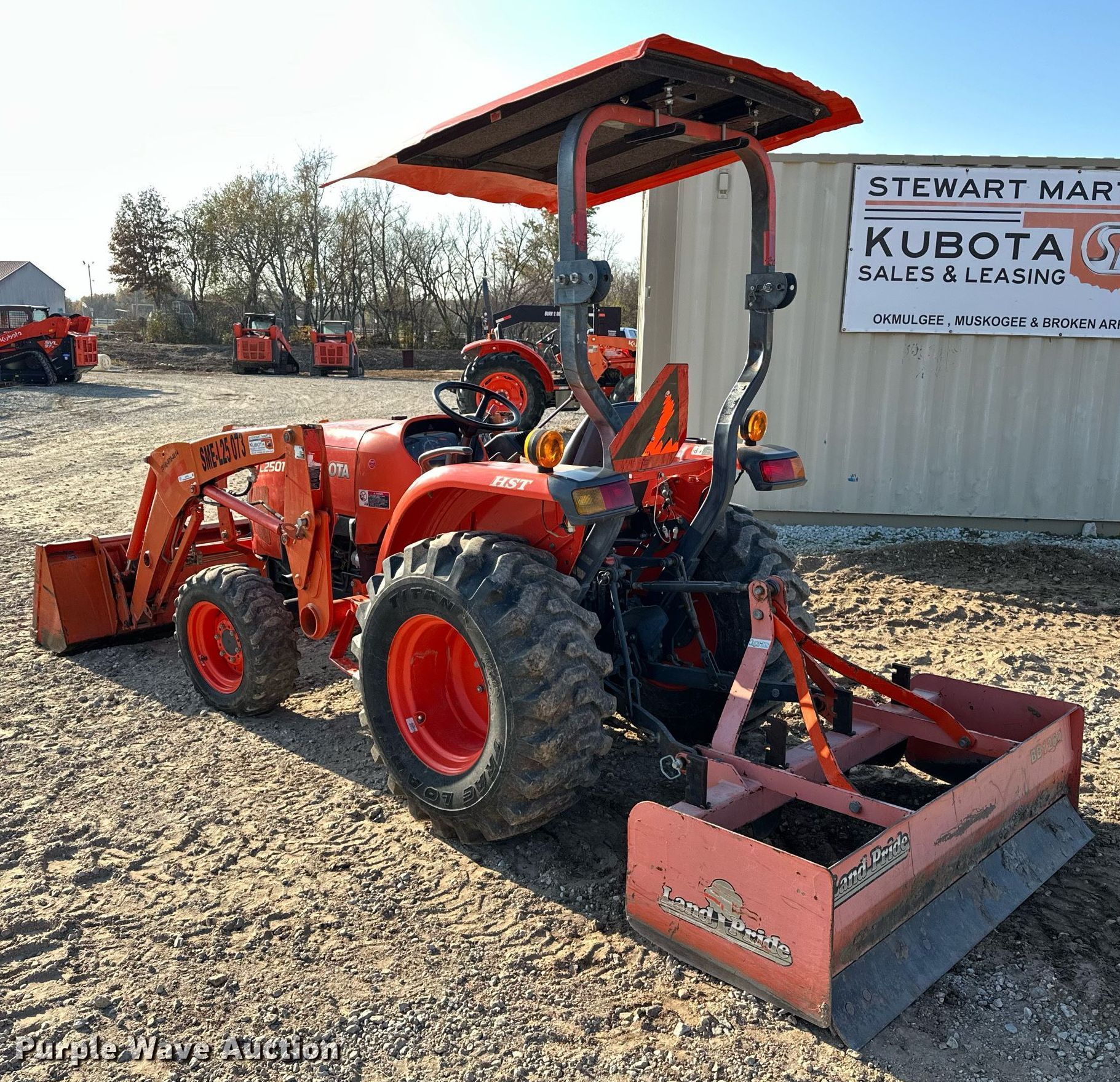 Kubota L2501D MFWD tractor. Hours: 765 on meter, Serial: 63073. Engine Kubota D1703, Displacement: 1.7L, Cylinders: 3, Fuel type: Diesel. Transmission Hydrostatic, Differential lock. Features PTO: 540, Three point Top link, Loader Kubota LA525, Quick attach, Controls: Joystick, Bucket Width: 65", Box blade Land Pride BB1260, Width: 5'. Tires Front: 27x8.50-15, Rear: 15x19.5. Notes Possible wheel issues. Stewart Martin Equipment. Okmulgee, OK 74447