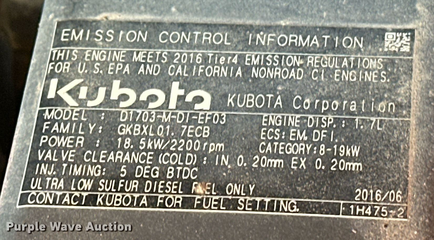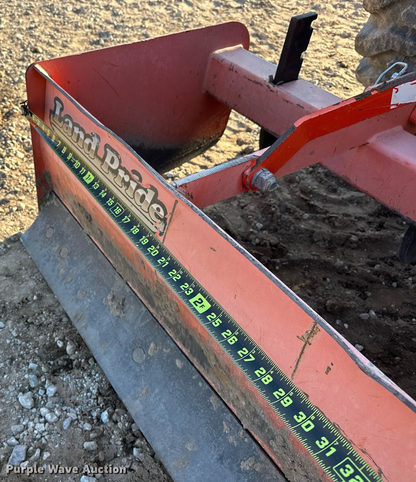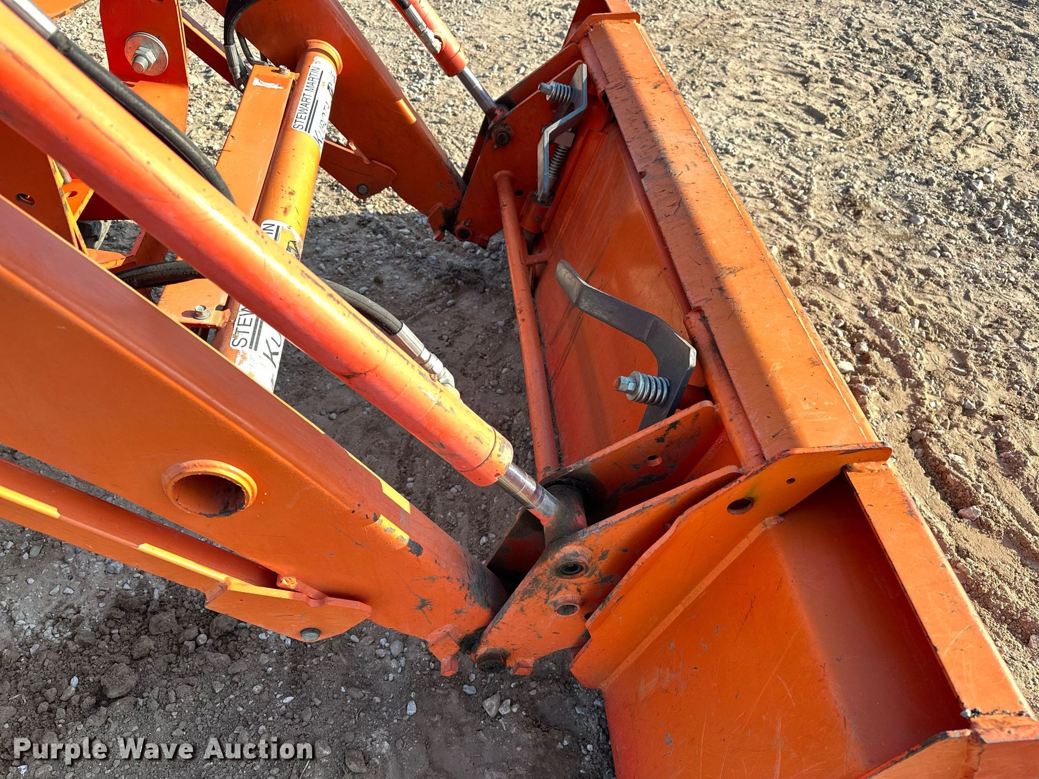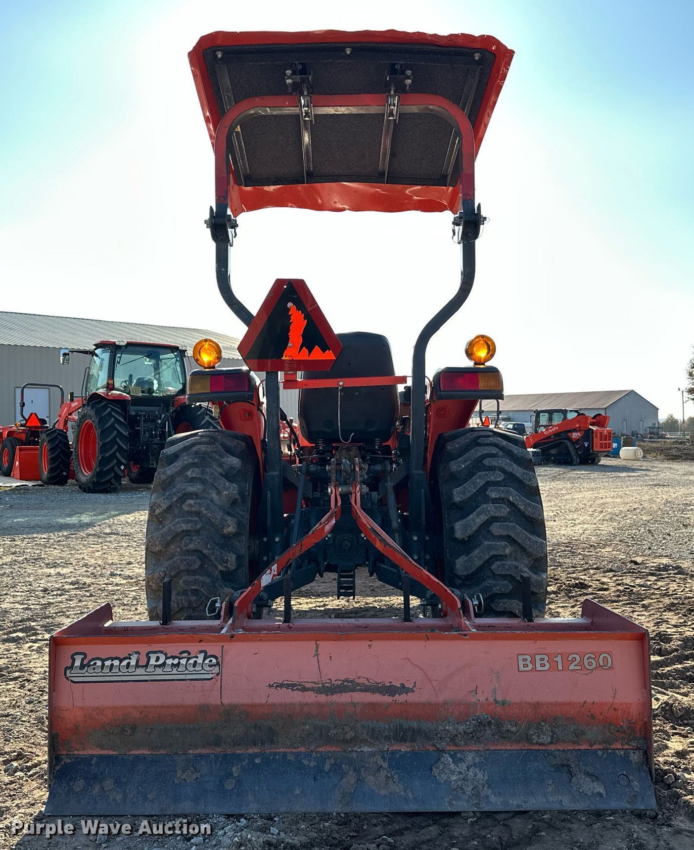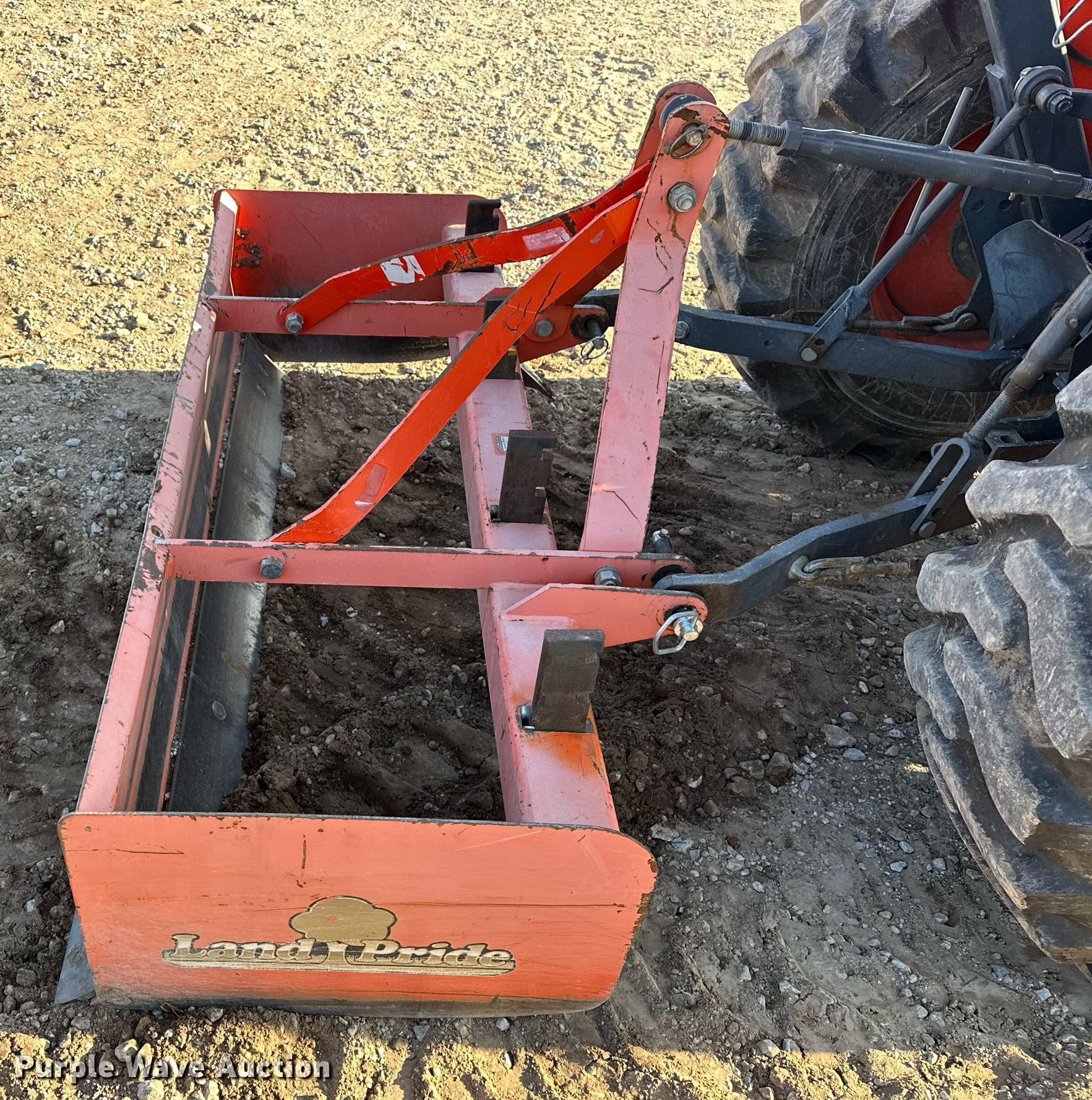 Kubota L2501D MFWD tractor. Hours: 765 on meter, Serial: 63073. Engine Kubota D1703, Displacement: 1.7L, Cylinders: 3, Fuel type: Diesel. Transmission Hydrostatic, Differential lock. Features PTO: 540, Three point Top link, Loader Kubota LA525, Quick attach, Controls: Joystick, Bucket Width: 65", Box blade Land Pride BB1260, Width: 5'. Tires Front: 27x8.50-15, Rear: 15x19.5. Notes Possible wheel issues. Stewart Martin Equipment. Okmulgee, OK 74447