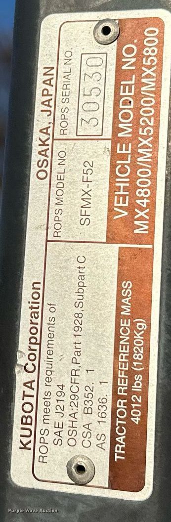 Purple Wave is selling a used Tractor in Oklahoma. This item is a 2019 Kubota MX4800D MFWD tractor with the following: Hours: 355 on meter, Serial: 54947