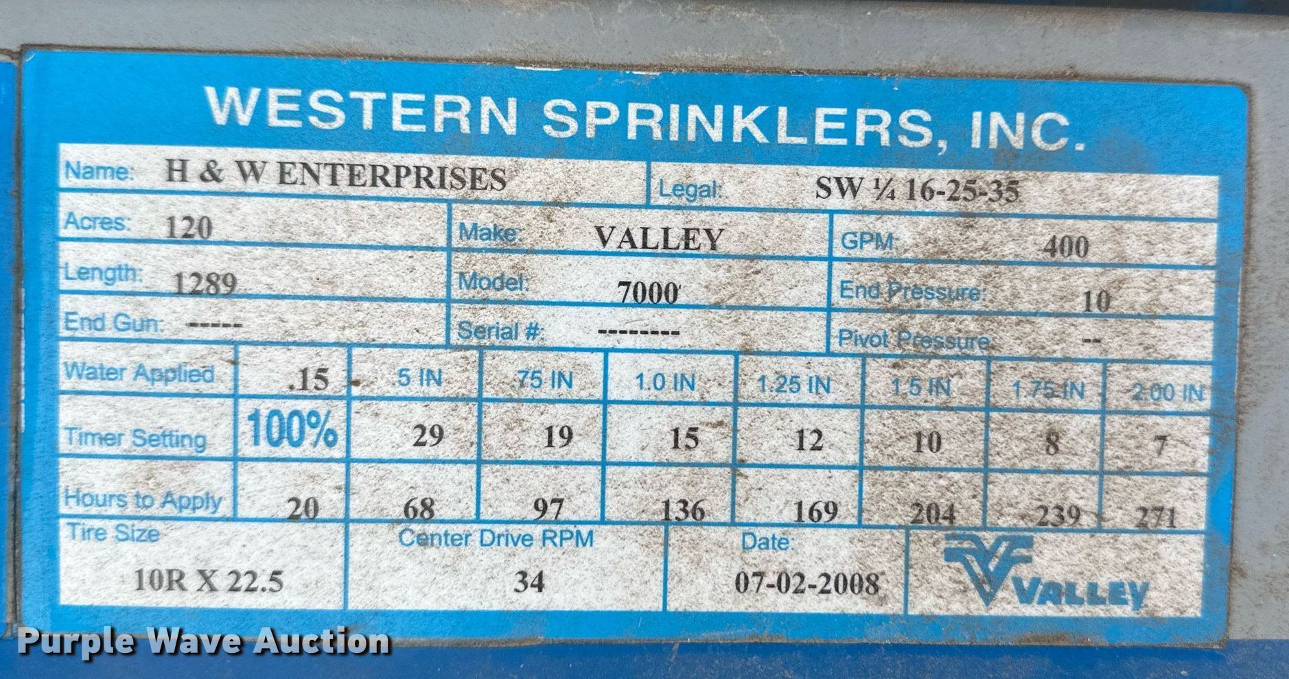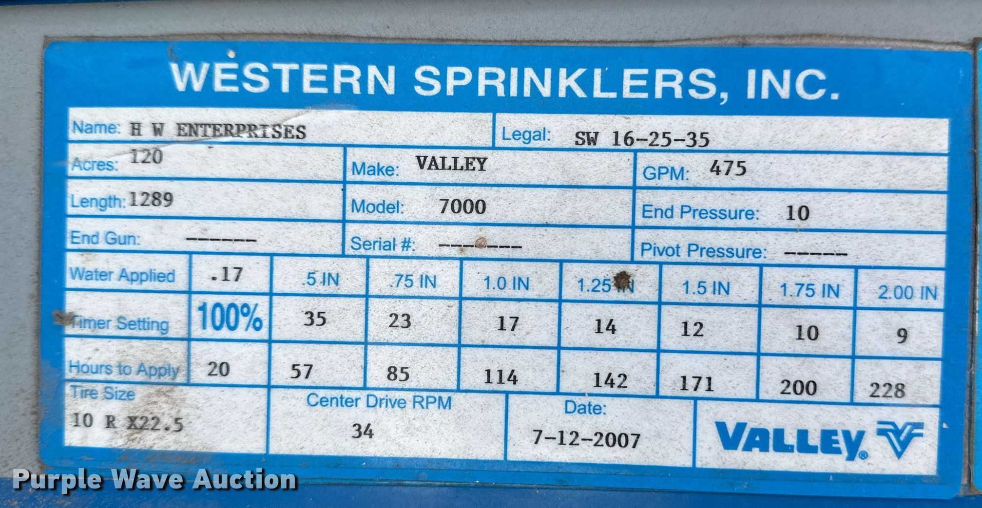 Valley 7000 center pivot. Hours: 39,331 on meter. Electric motor Volts: 480, Phase: Three. Features Length: Approx. 1,320', Sections: 8. Tires (10) 11R22.5, (6) 11.2-38. Fuller Land and Mineral. Garden City, KS 67846