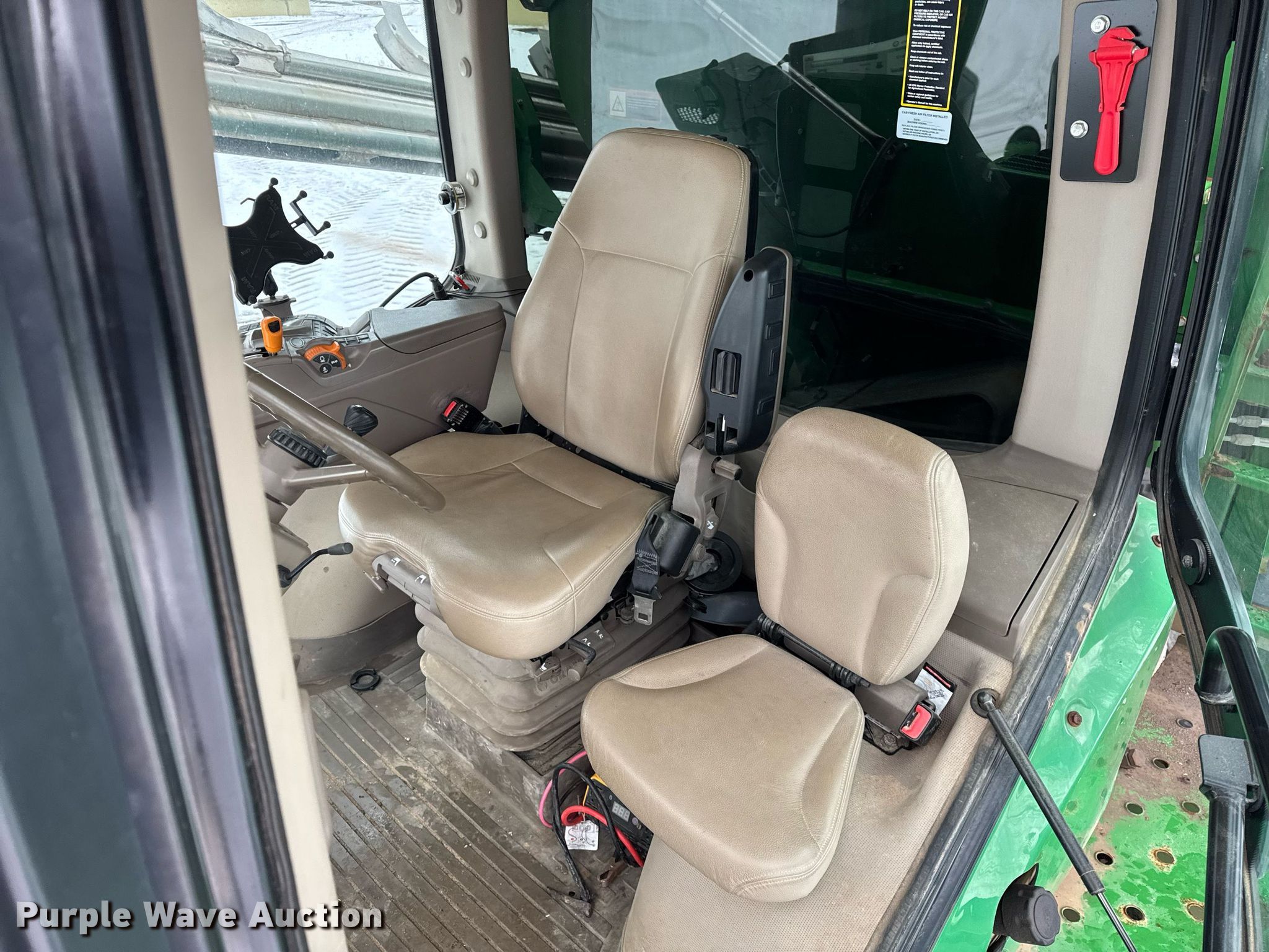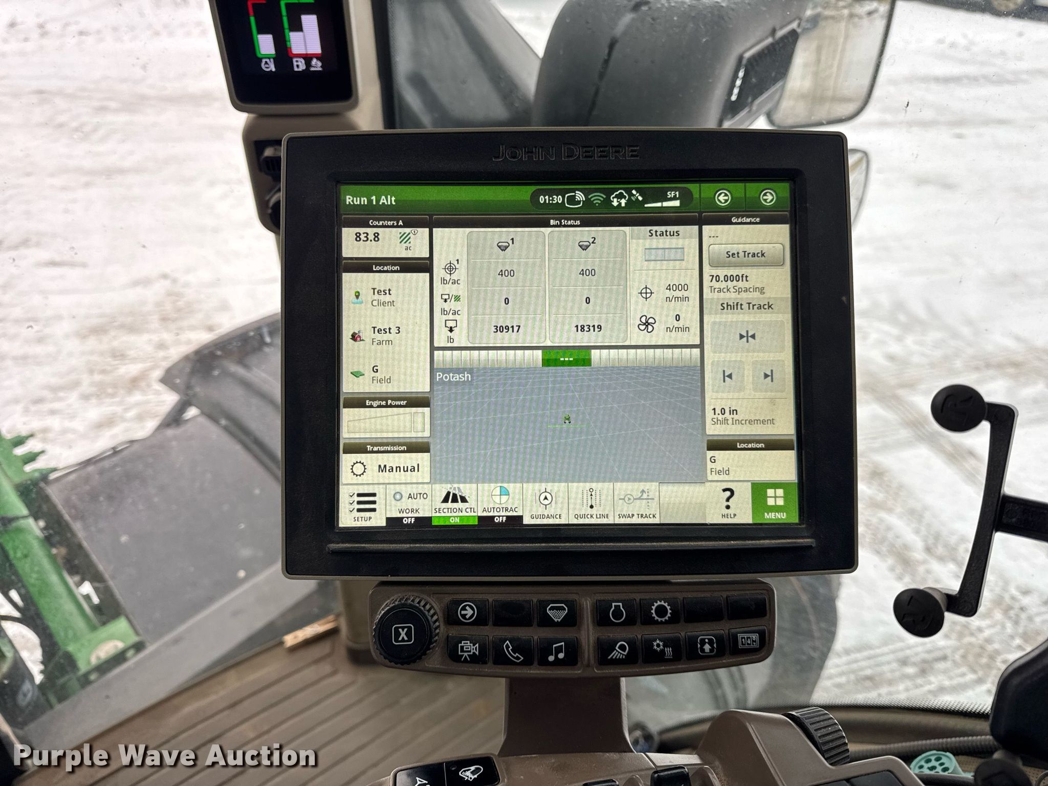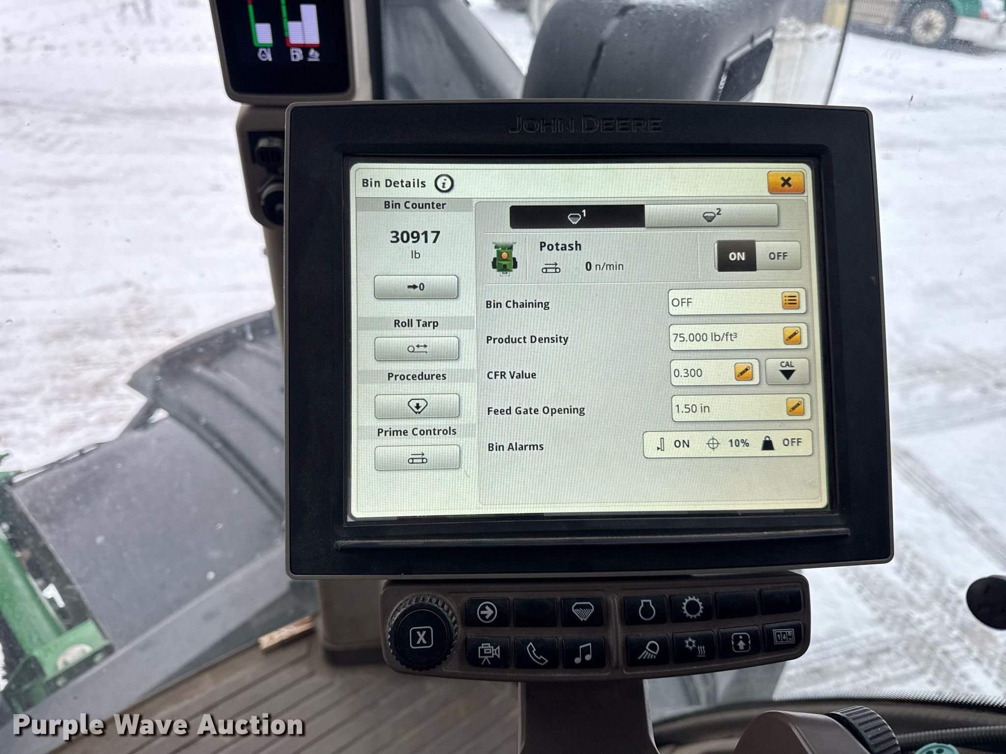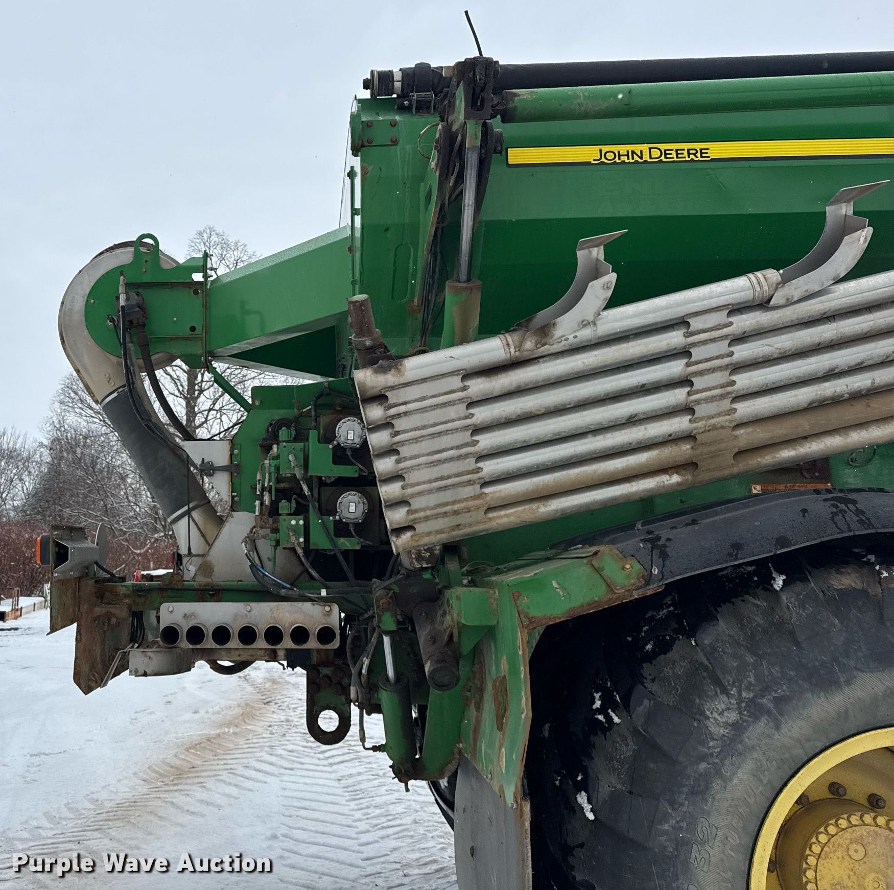 2018 John Deere F4365 applicator. Engine hours: 1,961 on meter, Serial: 1N04365FVJ0188148. Engine John Deere, Displacement: 9.0L, Cylinders: 6, Fuel type: Diesel. Transmission IVT. Operators station AC, Heat, Rotary beacon. Features Hydraulic ladder, Boom Width: 70', Sections: 2, Hydraulic boom fold, Hydraulic height control, Dry fertilizer spreader bed John Deere AB485, Capacity: 300 cu.ft., Length: 12', Stainless steel, Roll tarp, Conveyor belt Width: 16", Electronics GPS monitor John Deere, GPS receiver John Deere Starfire 6000, Auto steer. Tires Front: 750/50R26, Rear: 1050/50R32, Flotation tires. Keystone Cooperative. Hamilton, MI 49419
