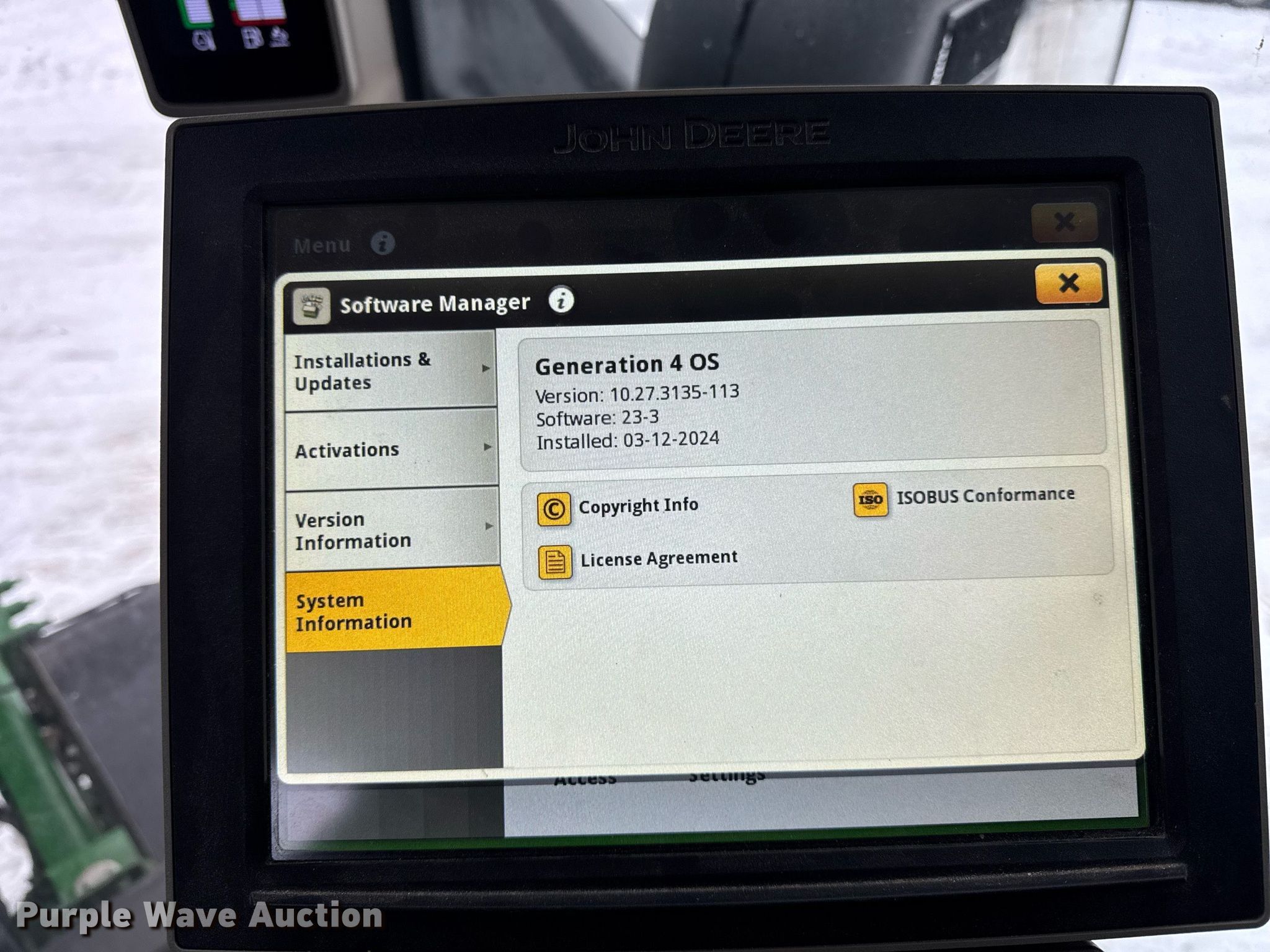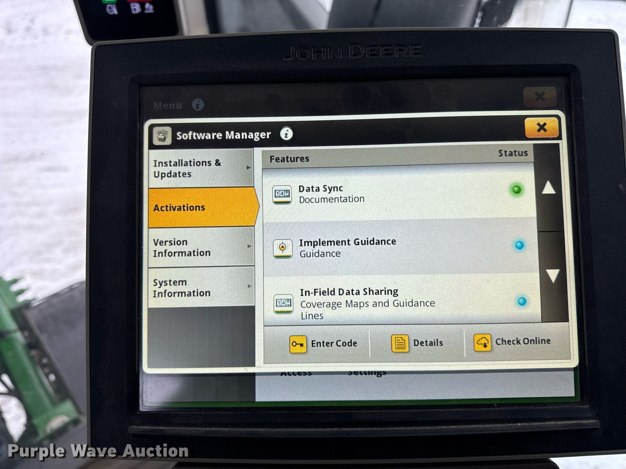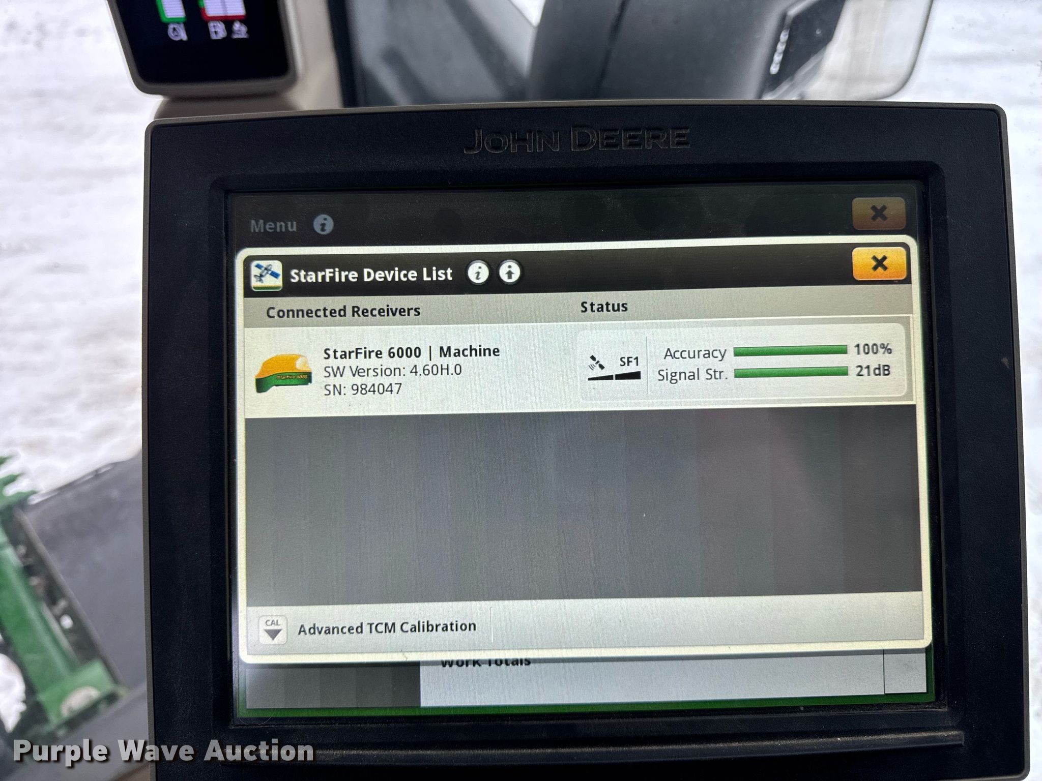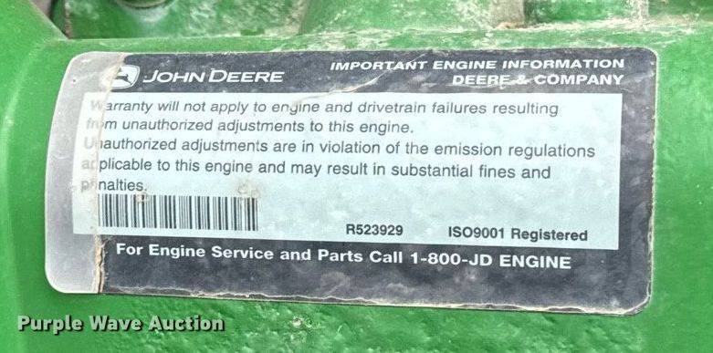 2018 John Deere F4365 applicator. Engine hours: 1,961 on meter, Serial: 1N04365FVJ0188148. Engine John Deere, Displacement: 9.0L, Cylinders: 6, Fuel type: Diesel. Transmission IVT. Operators station AC, Heat, Rotary beacon. Features Hydraulic ladder, Boom Width: 70', Sections: 2, Hydraulic boom fold, Hydraulic height control, Dry fertilizer spreader bed John Deere AB485, Capacity: 300 cu.ft., Length: 12', Stainless steel, Roll tarp, Conveyor belt Width: 16", Electronics GPS monitor John Deere, GPS receiver John Deere Starfire 6000, Auto steer. Tires Front: 750/50R26, Rear: 1050/50R32, Flotation tires. Keystone Cooperative. Hamilton, MI 49419