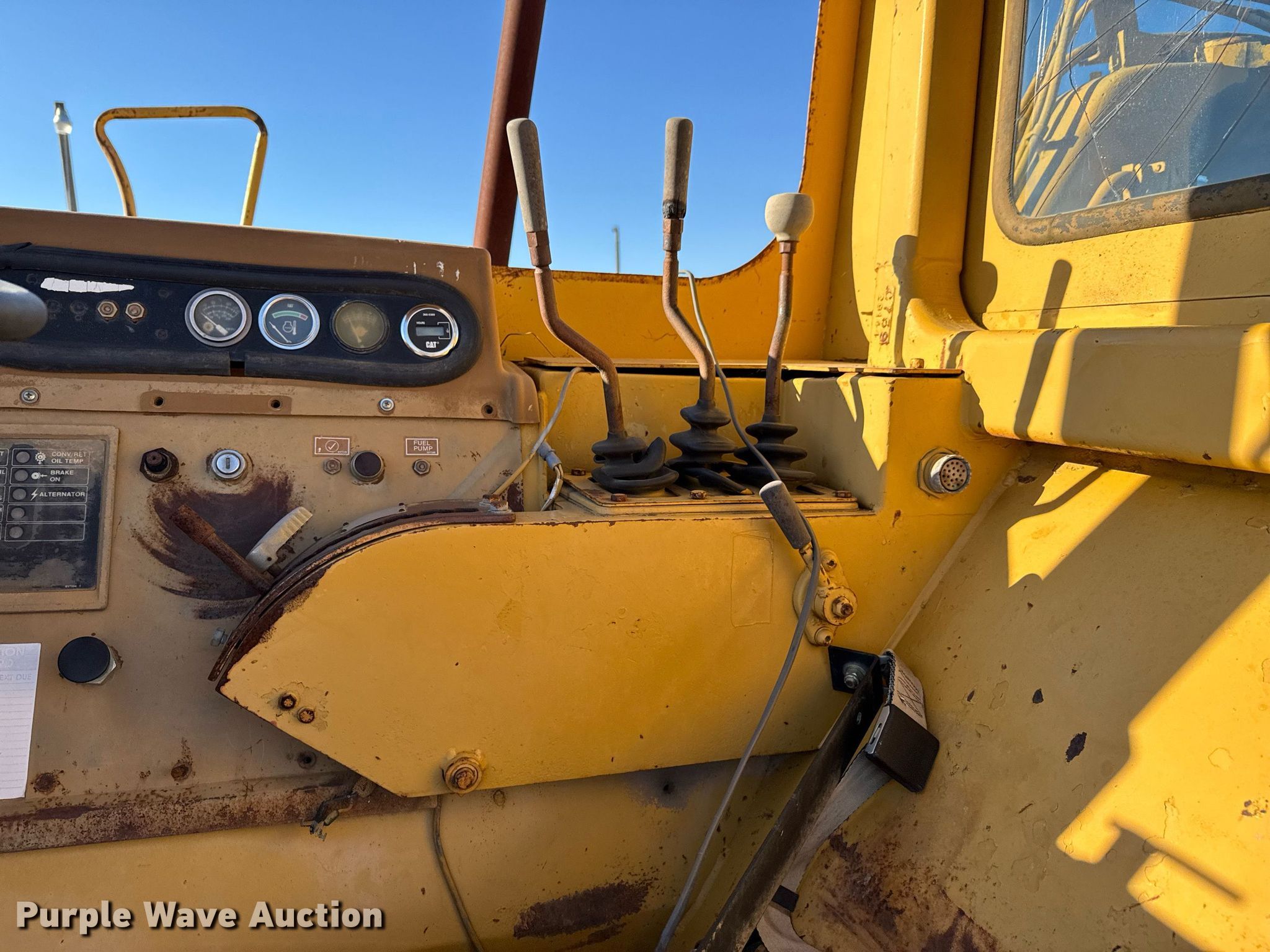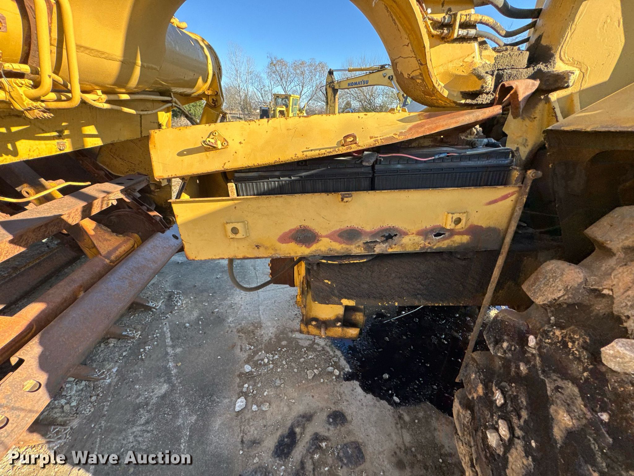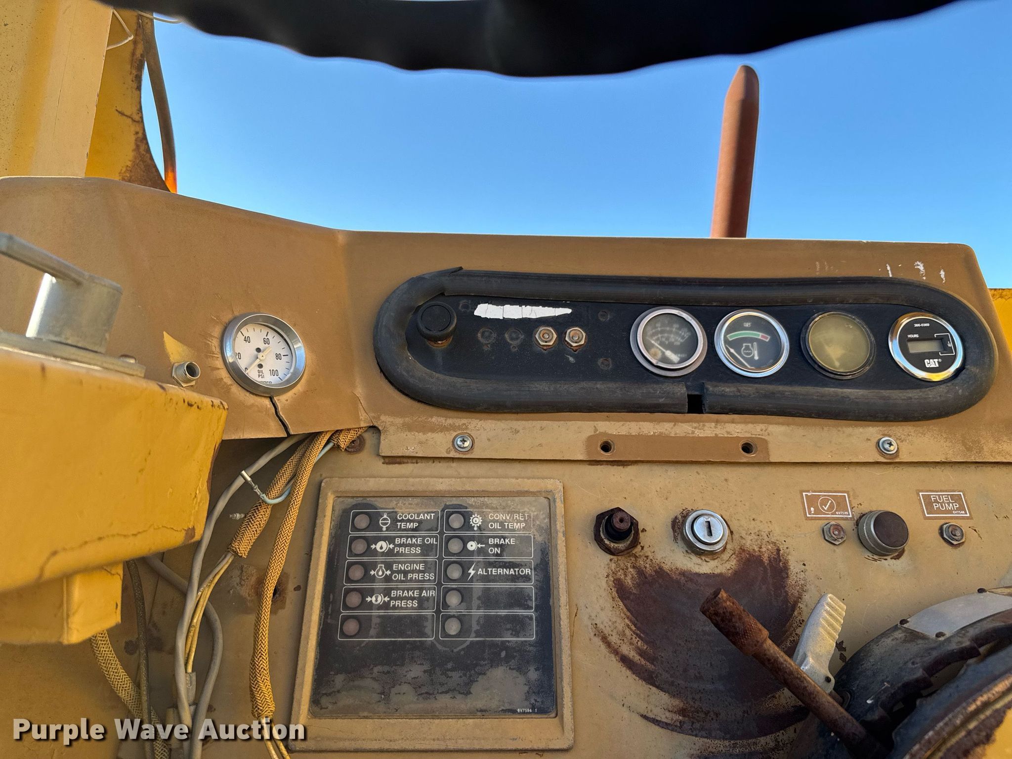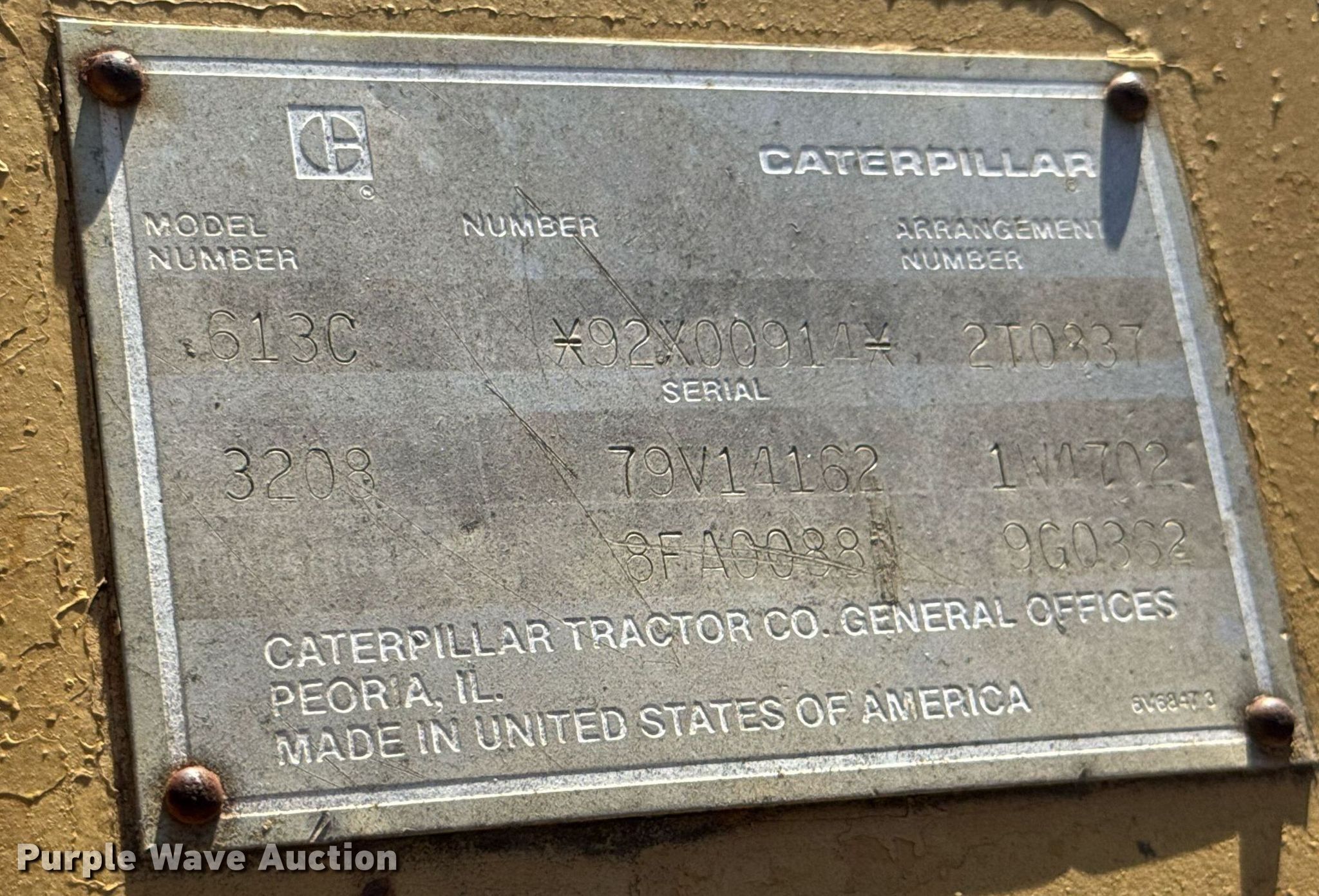 1986 Caterpillar 613C elevating scraper. Hours: Unknown, Serial: 92X00914. Engine Caterpillar 3208, Serial: 79V14162, Cylinders: 6, Fuel type: Diesel. Transmission Powershift, 8F - 1R. Chassis Brakes: Air. Features Bowl capacity: 11 cu.yd., Elevator reverse, Hydraulic lift, Scraper controls: Lever controls No. of controls: 3, Rear push block, Hitch: Rear. Tires Size: 23.5-25. Notes Parts only, Parts missing, Glass missing, Glass cracked, Oil leak, Non-operational unit. Ira Green Construction - Open Inspection December 18, 2024. Claremore, OK 74017