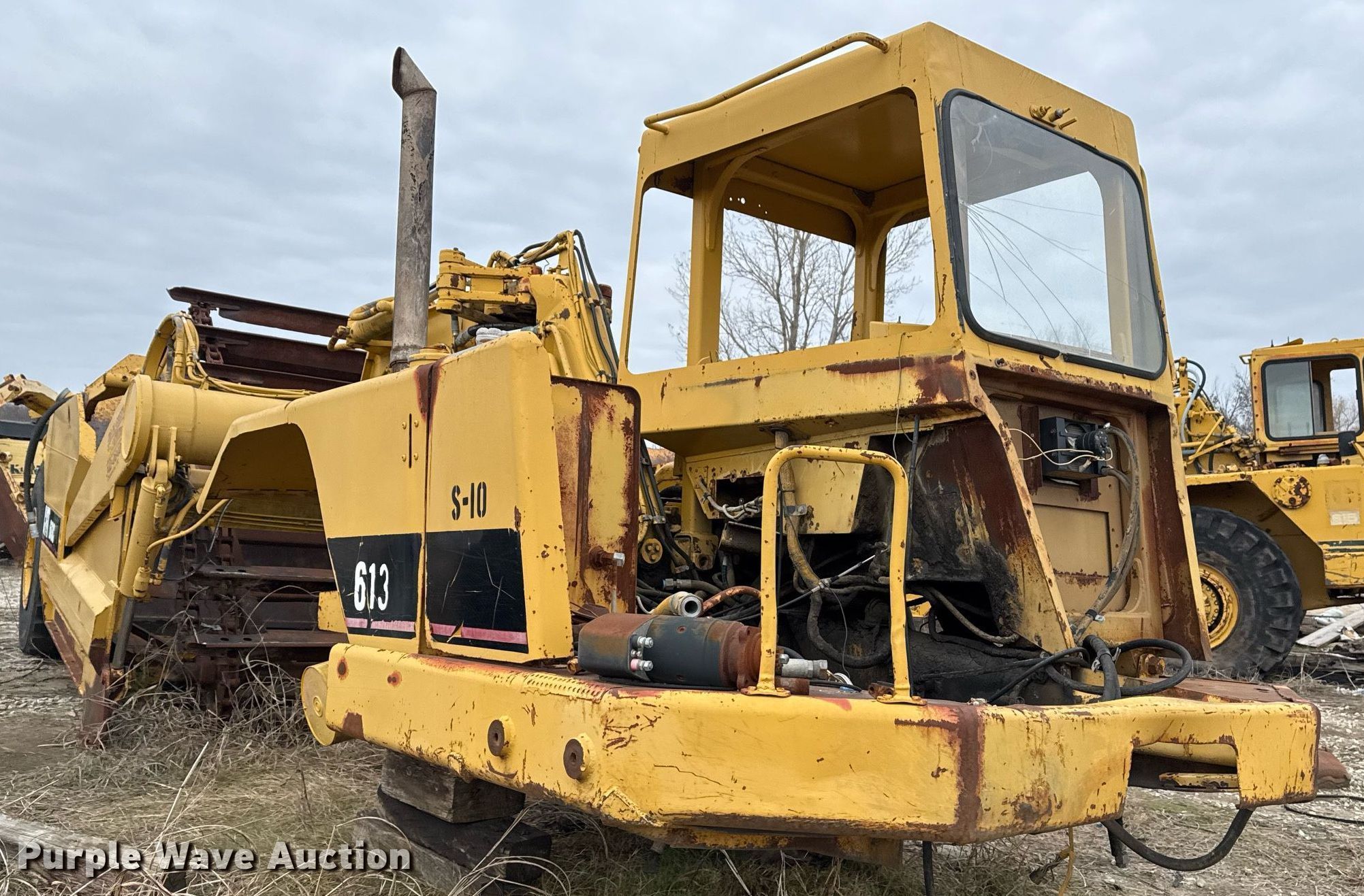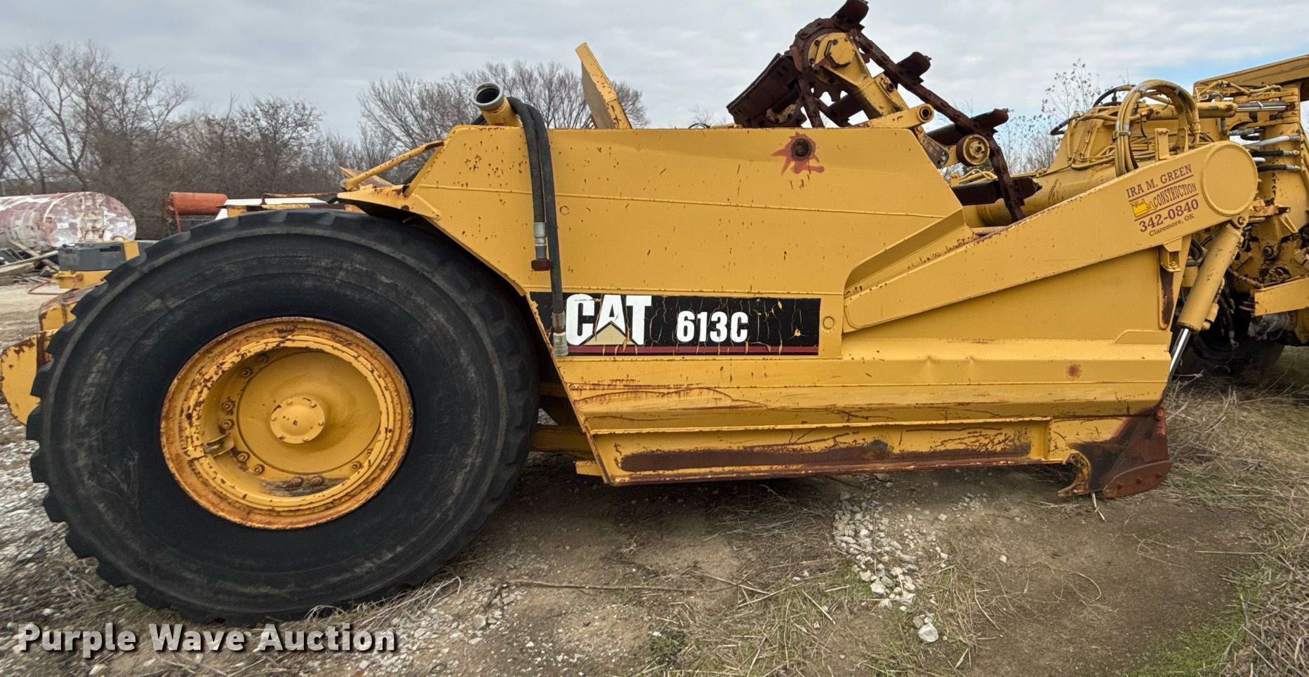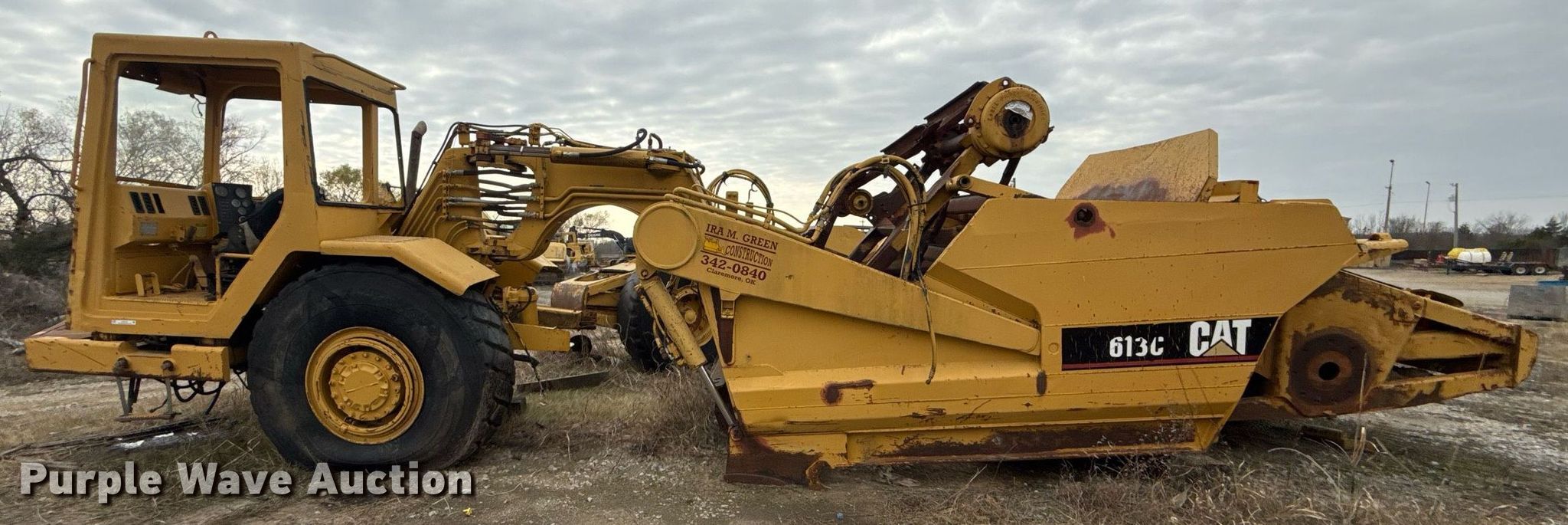 1994 Caterpillar 613C elevating scraper. Hours: 5,209 on meter, Serial: 8LJ00903. Engine No engine. Transmission Powershift, 6F - 1R. Chassis Brakes: Air. Features Elevator reverse, Hydraulic lift, Scraper controls: Lever controls No. of controls: 3, Rear push block, Hitch: Rear. Tires Size: 23.5R25. Notes Glass cracked, Parts missing, Engine missing, Non-operational unit. Ira Green Construction - Open Inspection December 18, 2024. Claremore, OK 74017
