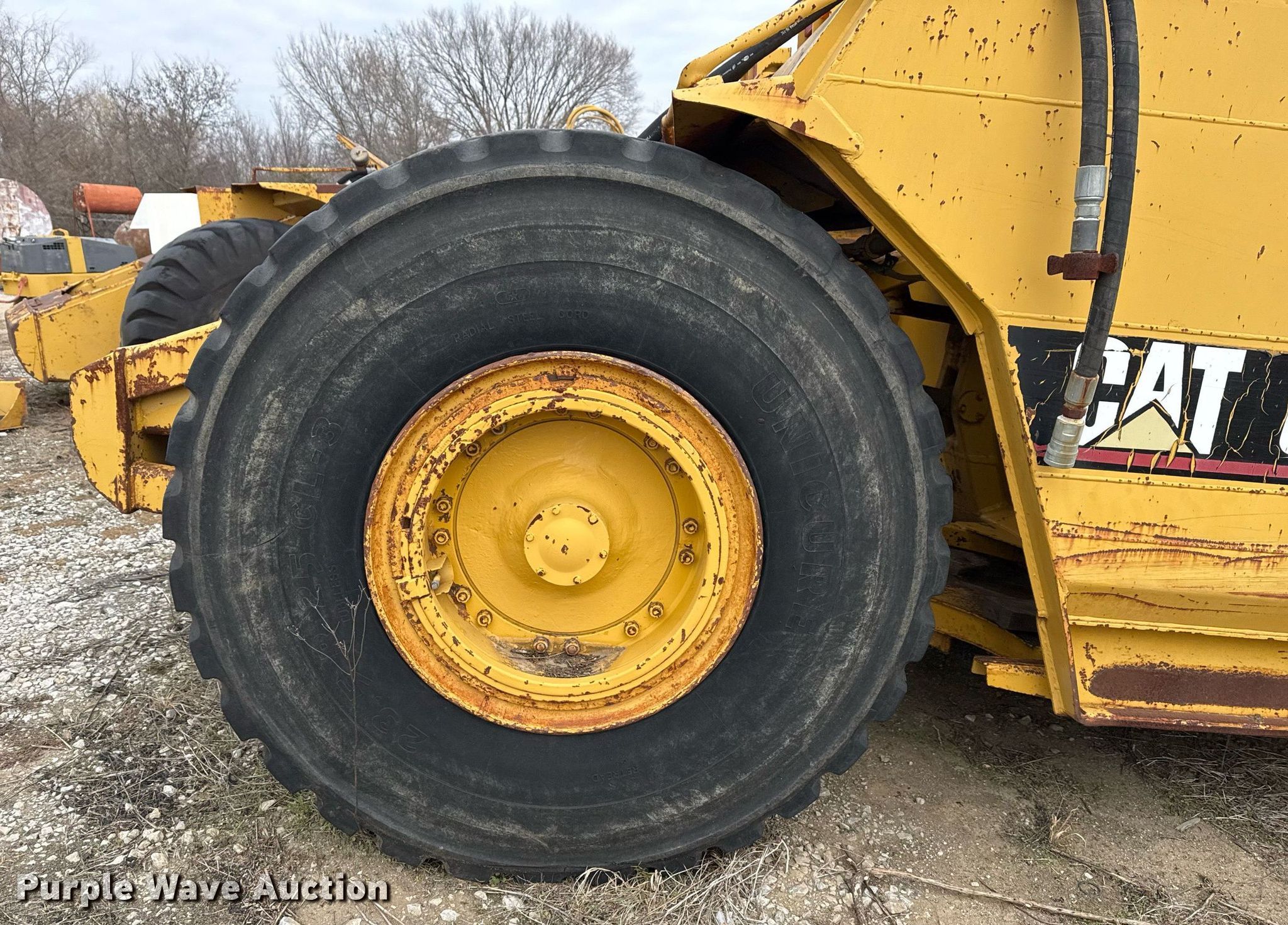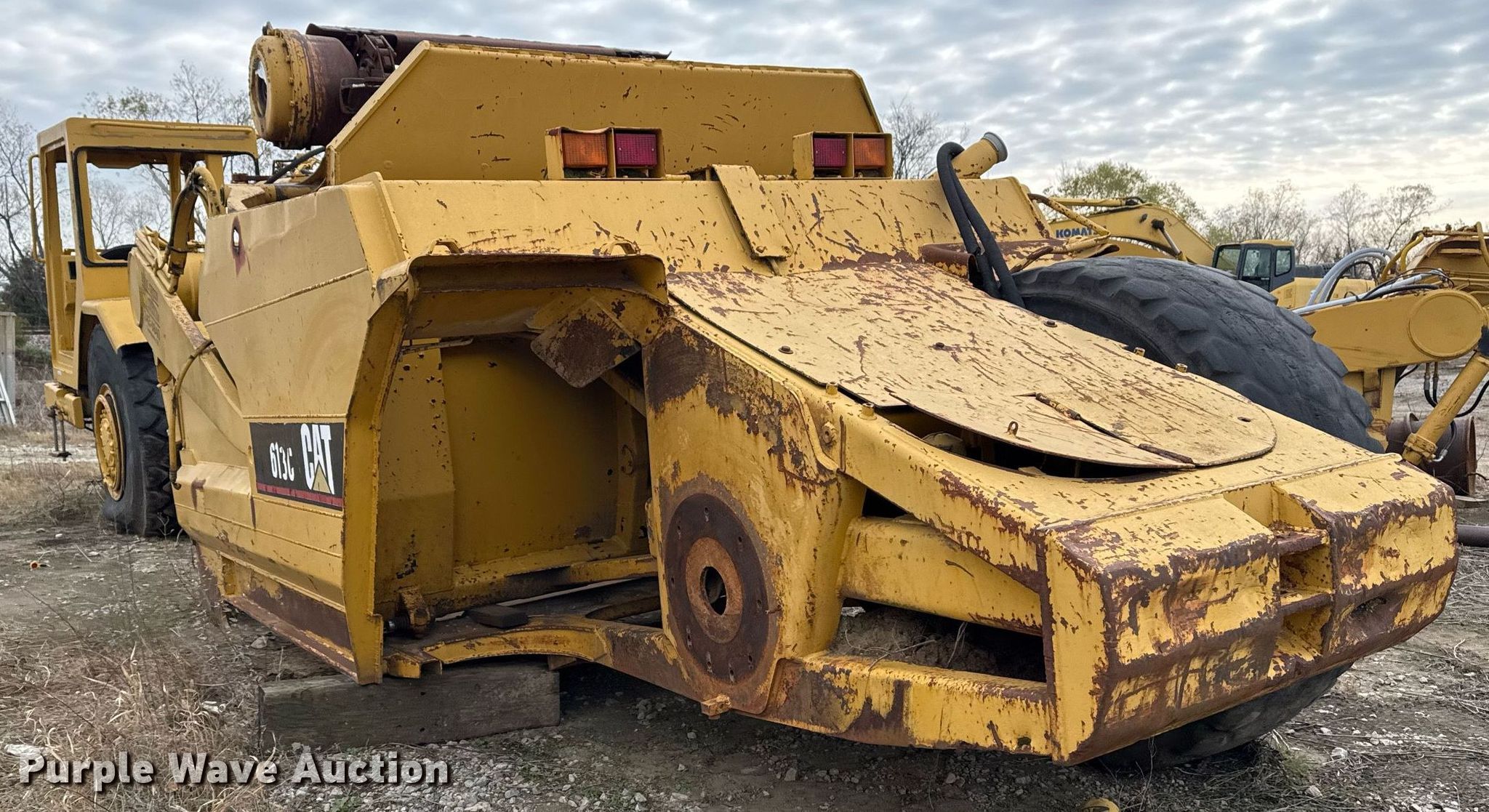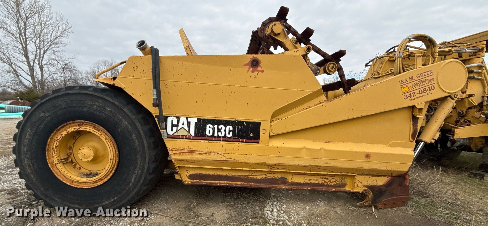 1994 Caterpillar 613C elevating scraper. Hours: 5,209 on meter, Serial: 8LJ00903. Engine No engine. Transmission Powershift, 6F - 1R. Chassis Brakes: Air. Features Elevator reverse, Hydraulic lift, Scraper controls: Lever controls No. of controls: 3, Rear push block, Hitch: Rear. Tires Size: 23.5R25. Notes Glass cracked, Parts missing, Engine missing, Non-operational unit. Ira Green Construction - Open Inspection December 18, 2024. Claremore, OK 74017