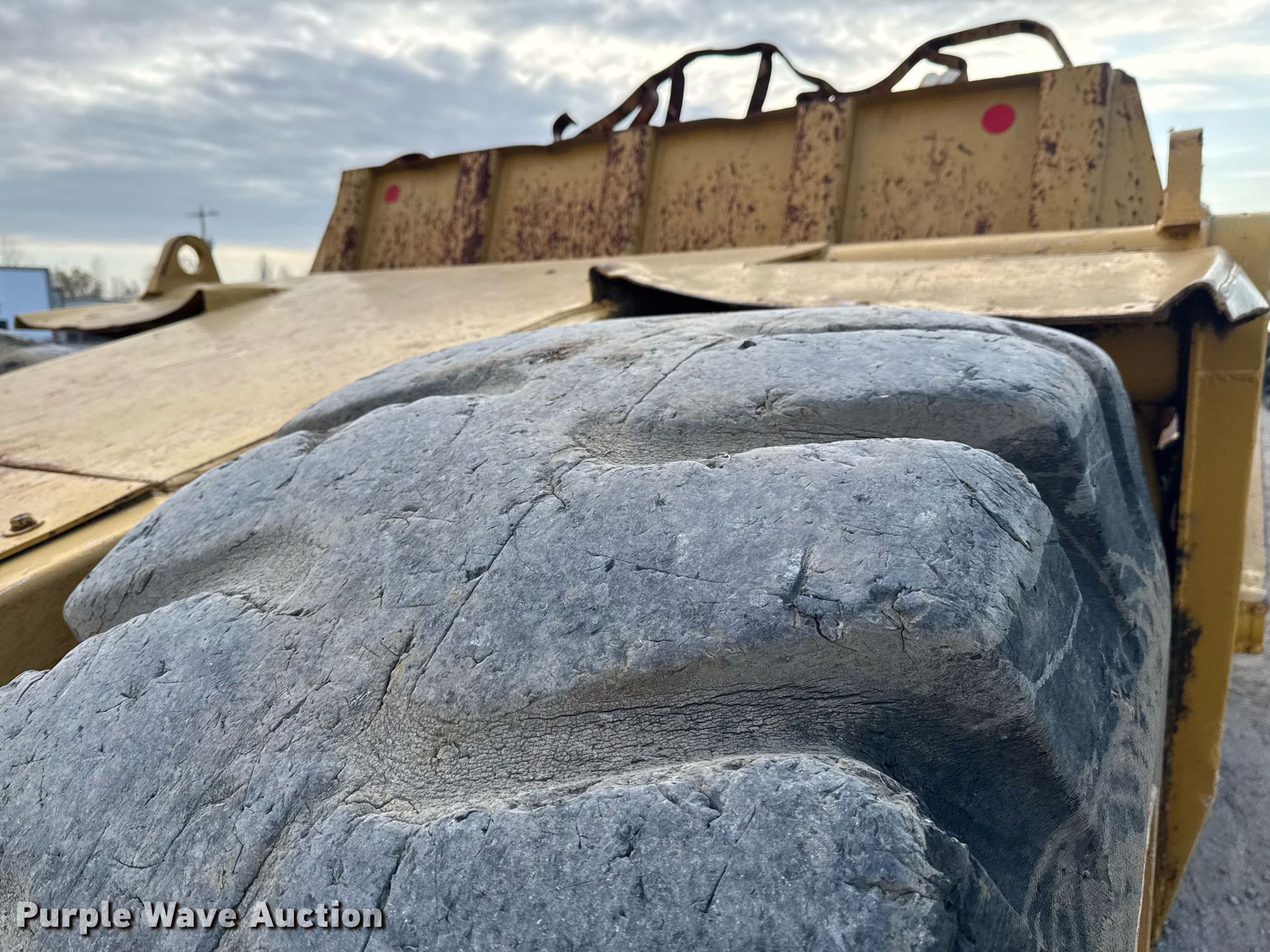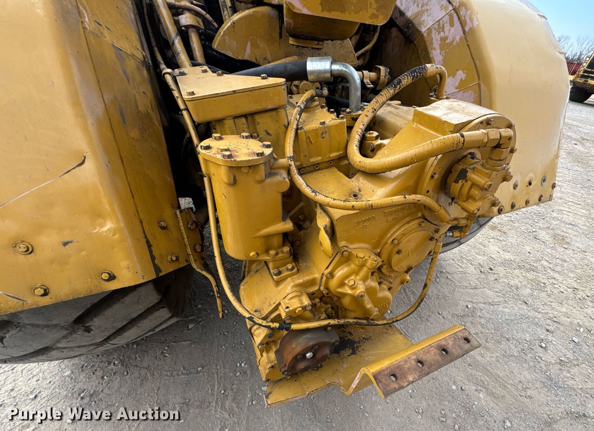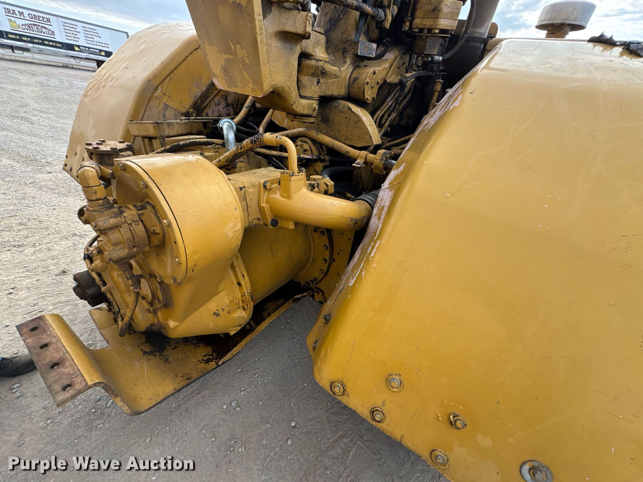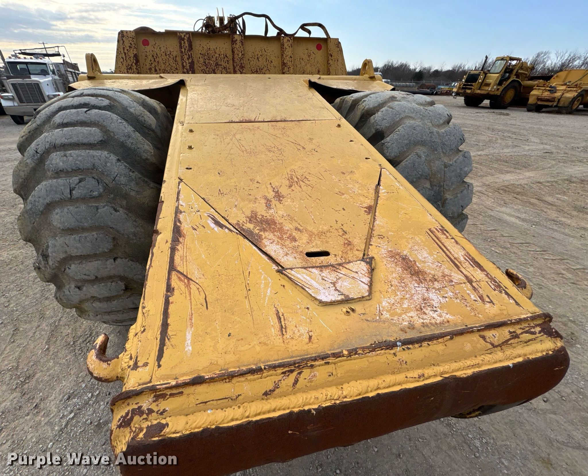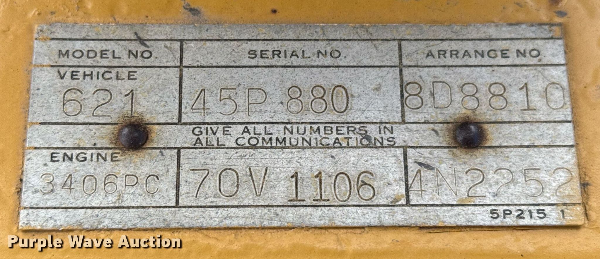 1974 Caterpillar 621B conventional scraper. Hours: 1,385 on meter, Serial: 45P880. Engine Caterpillar 3406PC, Serial: 70V1106, Cylinders: 6, Fuel type: Diesel. Transmission Powershift, 8F - 1R. Chassis Brakes: Air. Features Bowl capacity: 14 cu.yd., Hydraulic lift, Scraper controls: Lever controls No. of controls: 3, Rear push block. Tires Size: 29.5-29. Notes Glass missing, Door missing. Ira Green Construction - Open Inspection December 18, 2024. Claremore, OK 74017