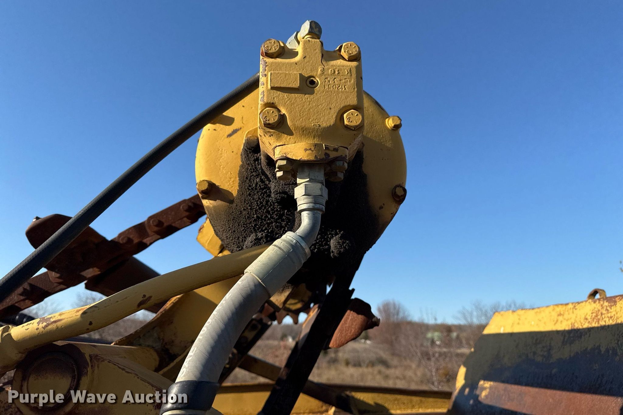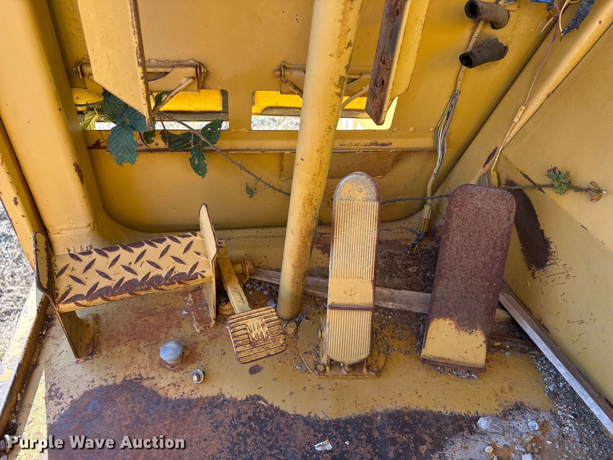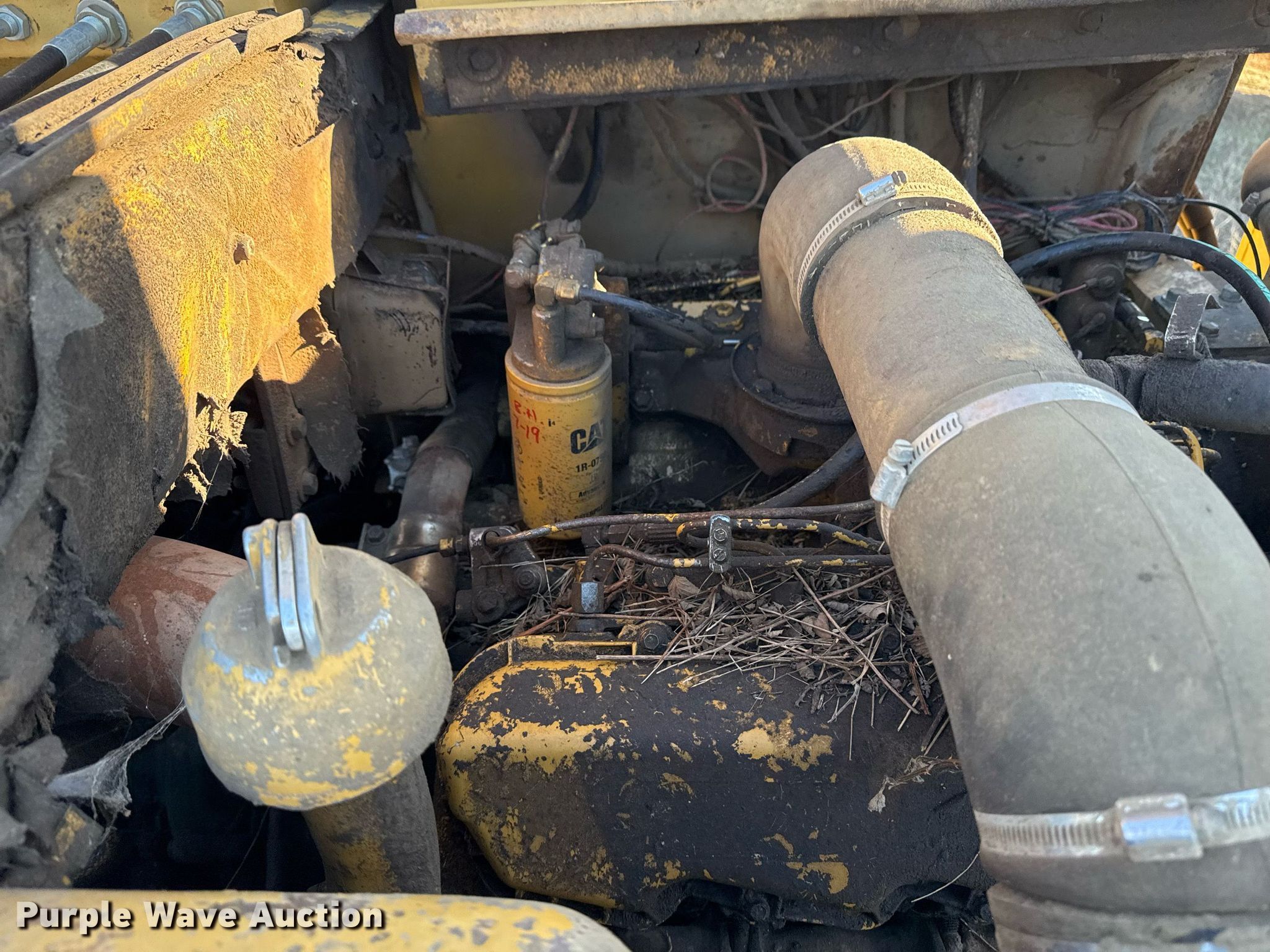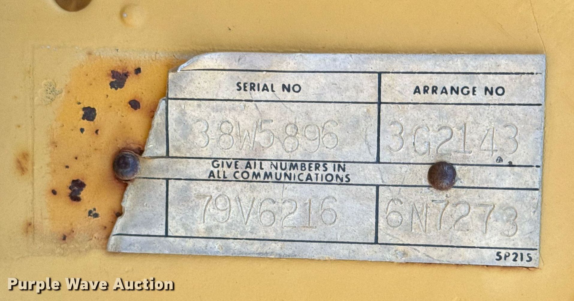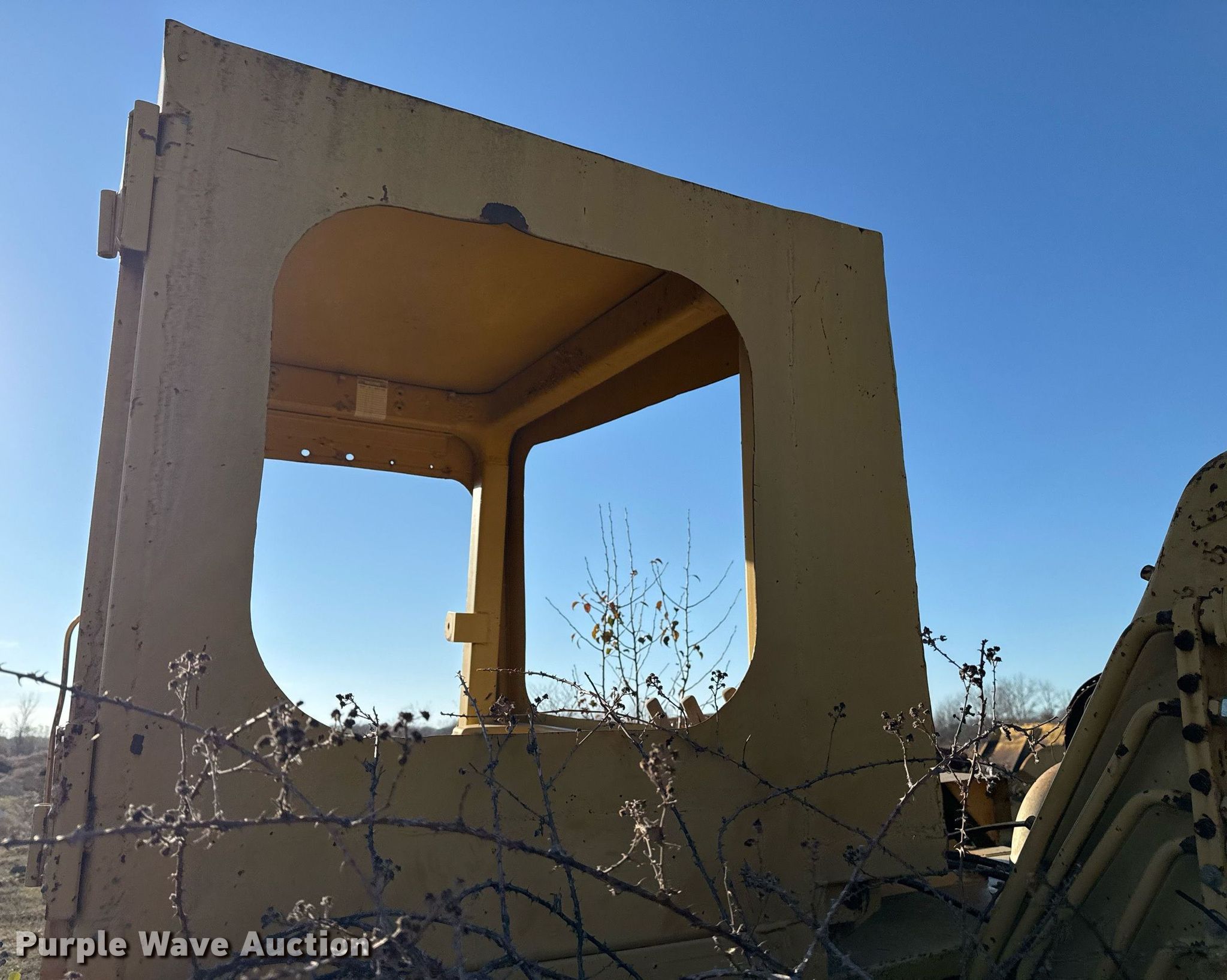 1979 Caterpillar 613B elevating scraper. Hours: 6,998 on meter, Serial: 38W5896. Engine Caterpillar 3208, Serial: 79V6216, Cylinders: 6, Fuel type: Diesel. Transmission Powershift, 4F - 2R. Chassis Brakes: Air. Features Elevator reverse, Hydraulic lift, Scraper controls: Lever controls No. of controls: 4, Rear push block, Hitch: Rear. Tires Size: 23.5-25. Notes Glass missing, Door missing, Possible rodent damage, Non-operational unit. Ira Green Construction - Open Inspection December 18, 2024. Claremore, OK 74017