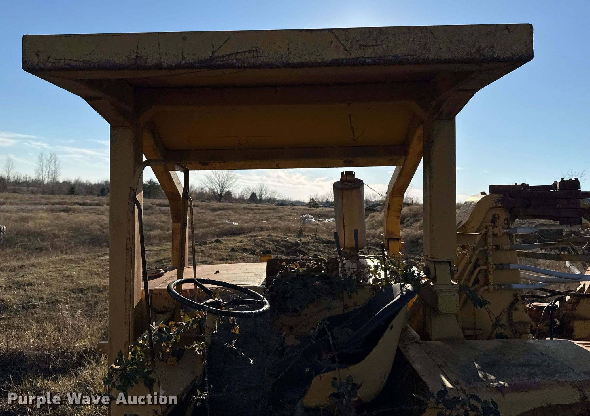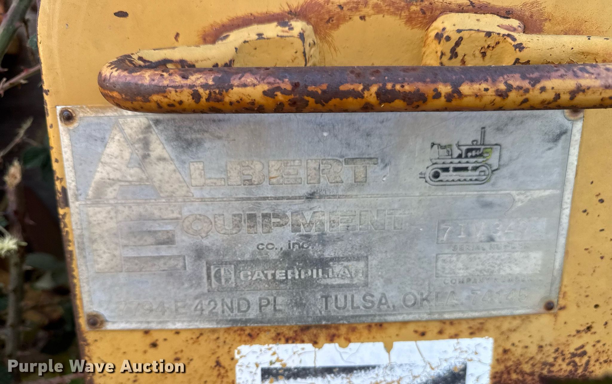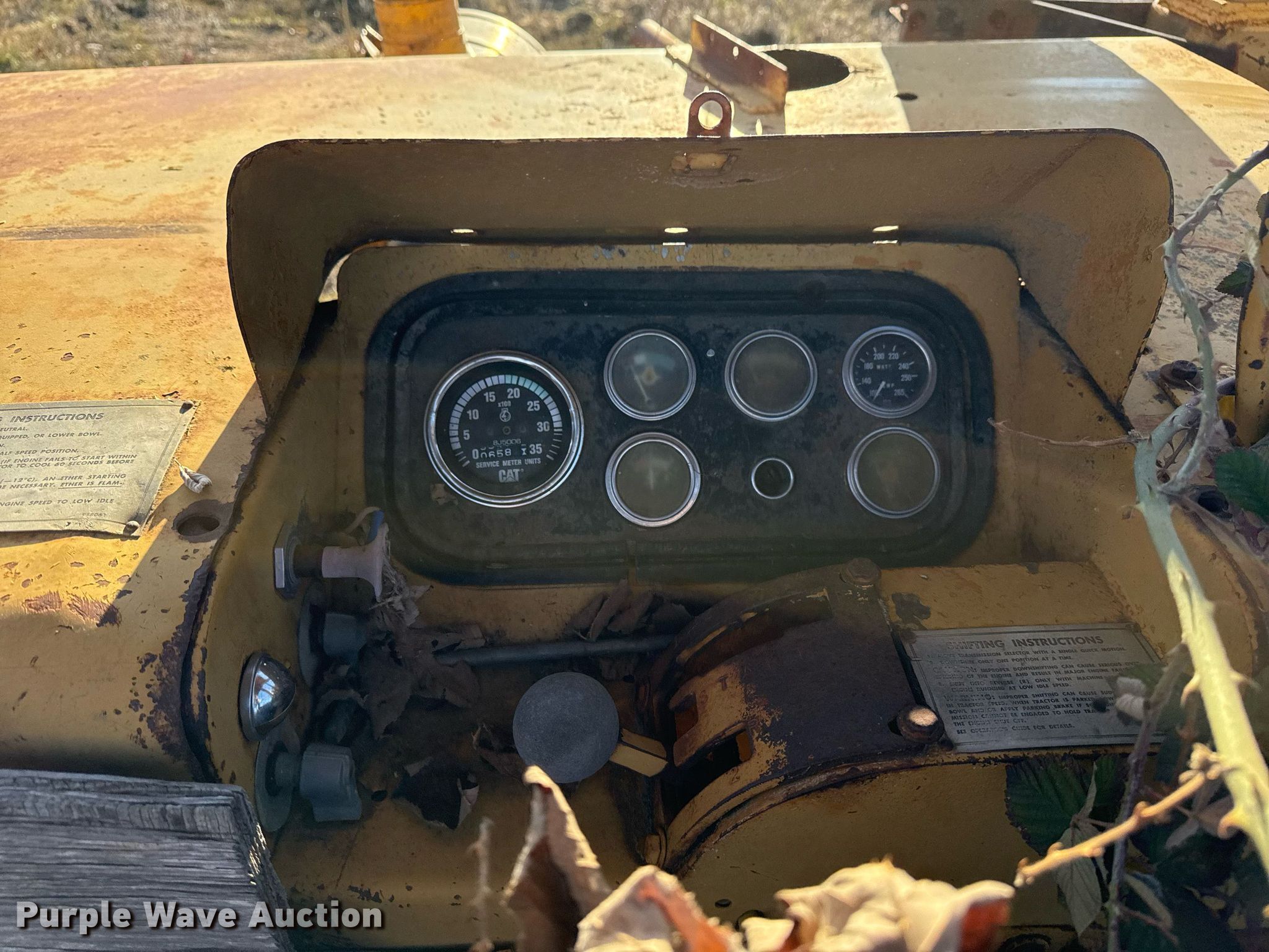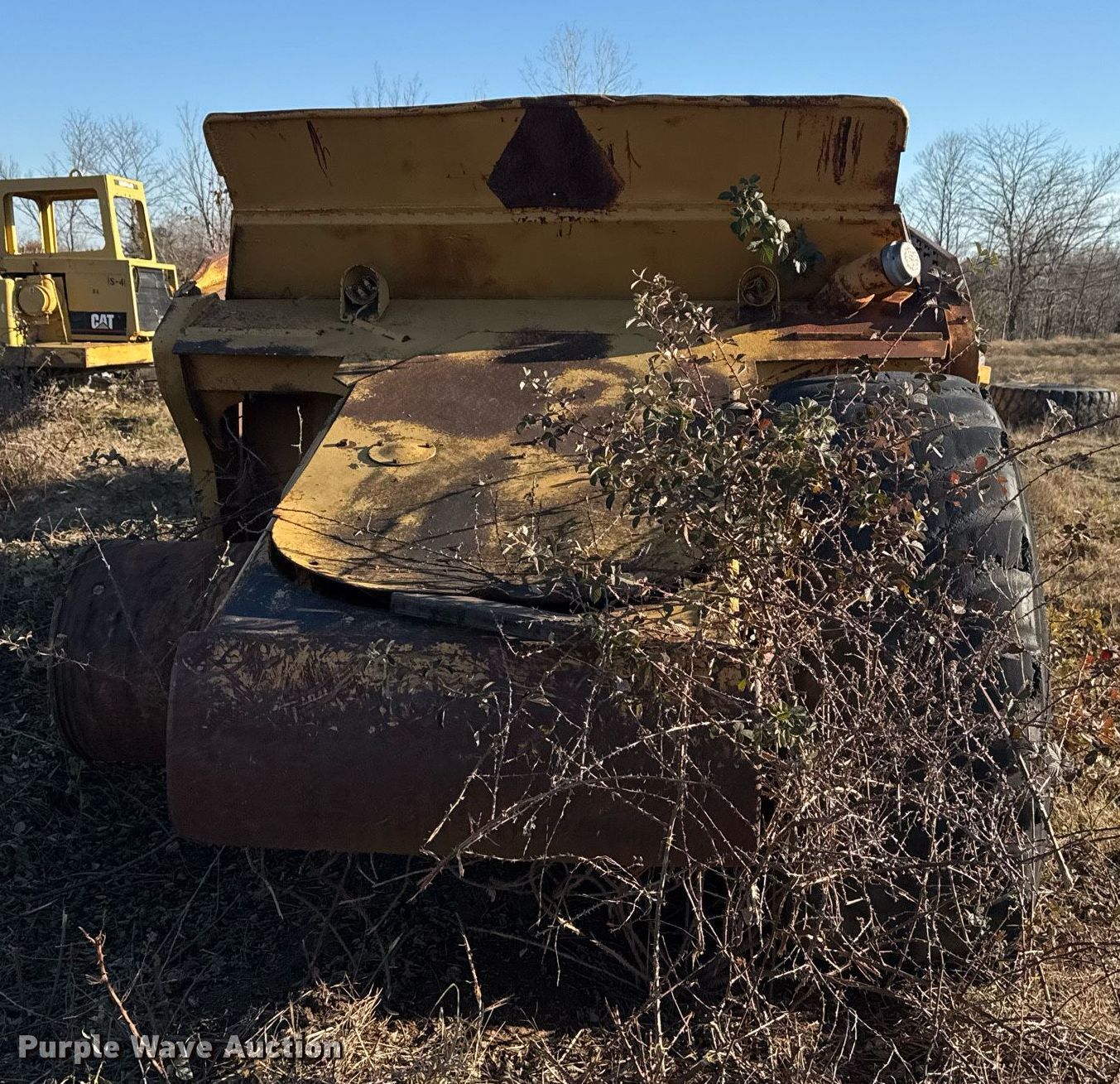 1974 Caterpillar 613 conventional scraper. Hours: 6,581 on meter Actual hours unknown, Serial: 71M3402. Engine Caterpillar, Cylinders: 6, Fuel type: Diesel. Transmission Powershift, 4F - 2R. Chassis Brakes: Air. Features Hydraulic lift, Scraper controls: Lever controls No. of controls: 3, Rear push block. Tires Size: 23.5R25. Notes Possible rodent damage, Parts missing, Tires missing, Non-operational unit. Ira Green Construction - Open Inspection December 18, 2024. Claremore, OK 74017