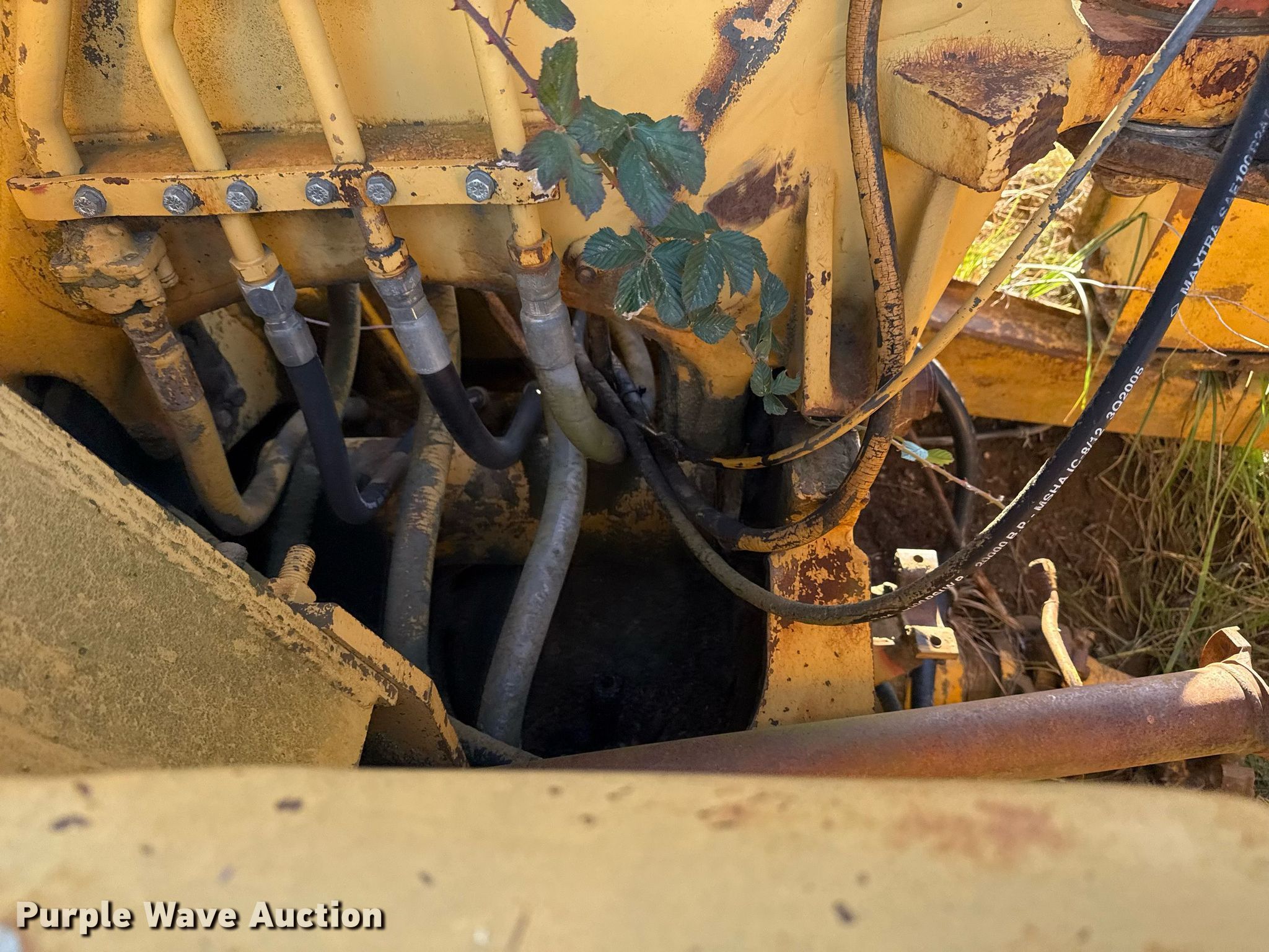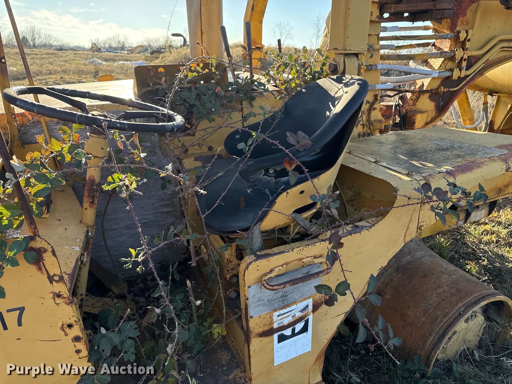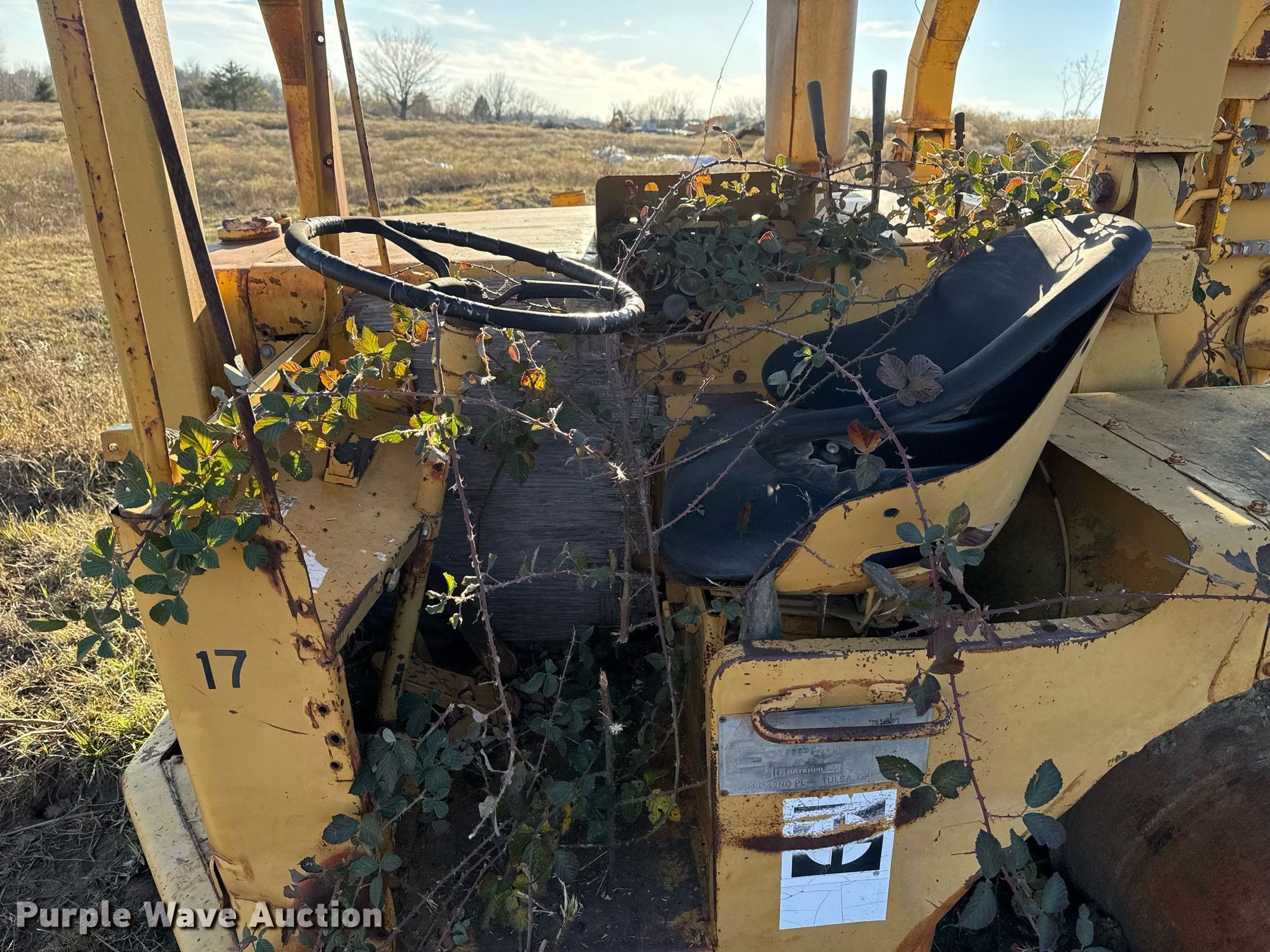 1974 Caterpillar 613 conventional scraper. Hours: 6,581 on meter Actual hours unknown, Serial: 71M3402. Engine Caterpillar, Cylinders: 6, Fuel type: Diesel. Transmission Powershift, 4F - 2R. Chassis Brakes: Air. Features Hydraulic lift, Scraper controls: Lever controls No. of controls: 3, Rear push block. Tires Size: 23.5R25. Notes Possible rodent damage, Parts missing, Tires missing, Non-operational unit. Ira Green Construction - Open Inspection December 18, 2024. Claremore, OK 74017