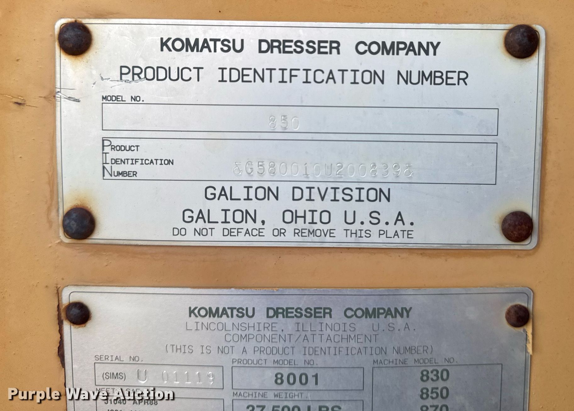 1994 Galion 850 motor grader. Hours: 3,791 on meter, Serial: G580010U200839. Engine Komatsu 614T/505T, Serial: 44914704, Cylinders: 6, Fuel type: Diesel, HP: 201. Transmission Powershift, 6F - 3R. Chassis Differential lock. Operators station Enclosed cab, Heat, Hydraulic control valves: 10. Features Moldboard: Tip control, Side shift, Moldboard total width: 13' 10", Rear ripper Ripper shanks: 3. Tires Size: 14.00-24. Notes Glass cracked, Glass broken, Flat tires, Non-operational unit. Ira Green Construction - Open Inspection December 18, 2024. Claremore, OK 74017