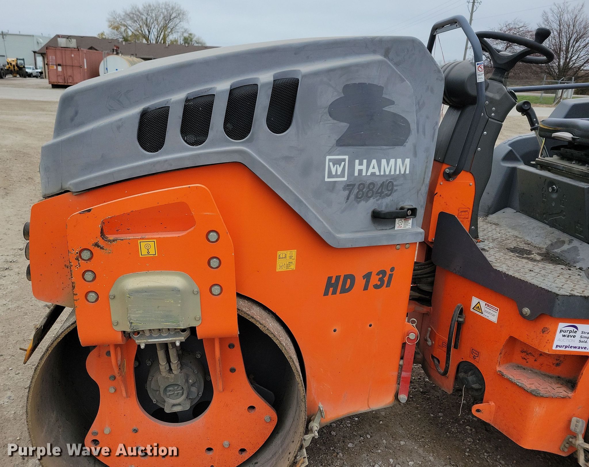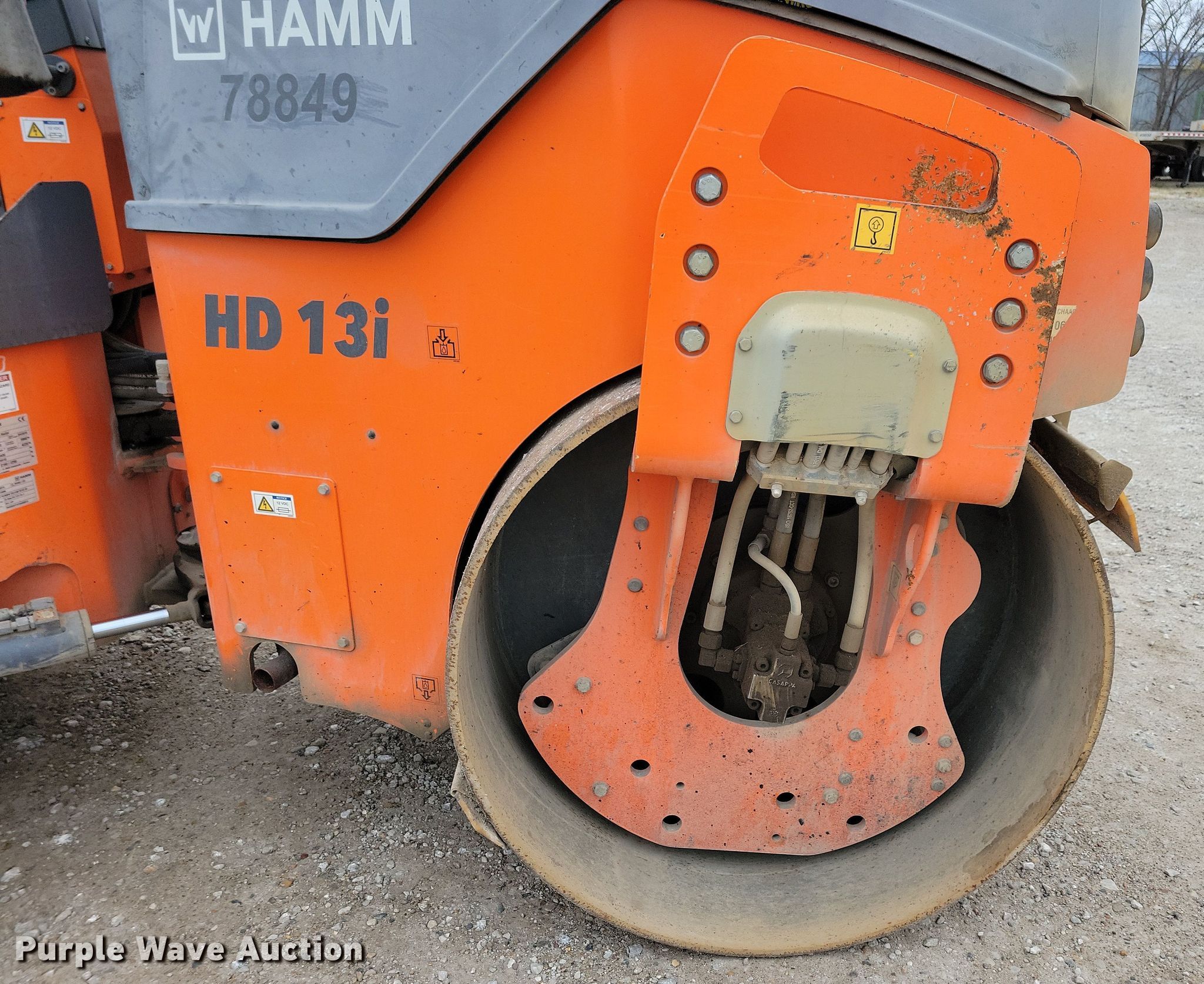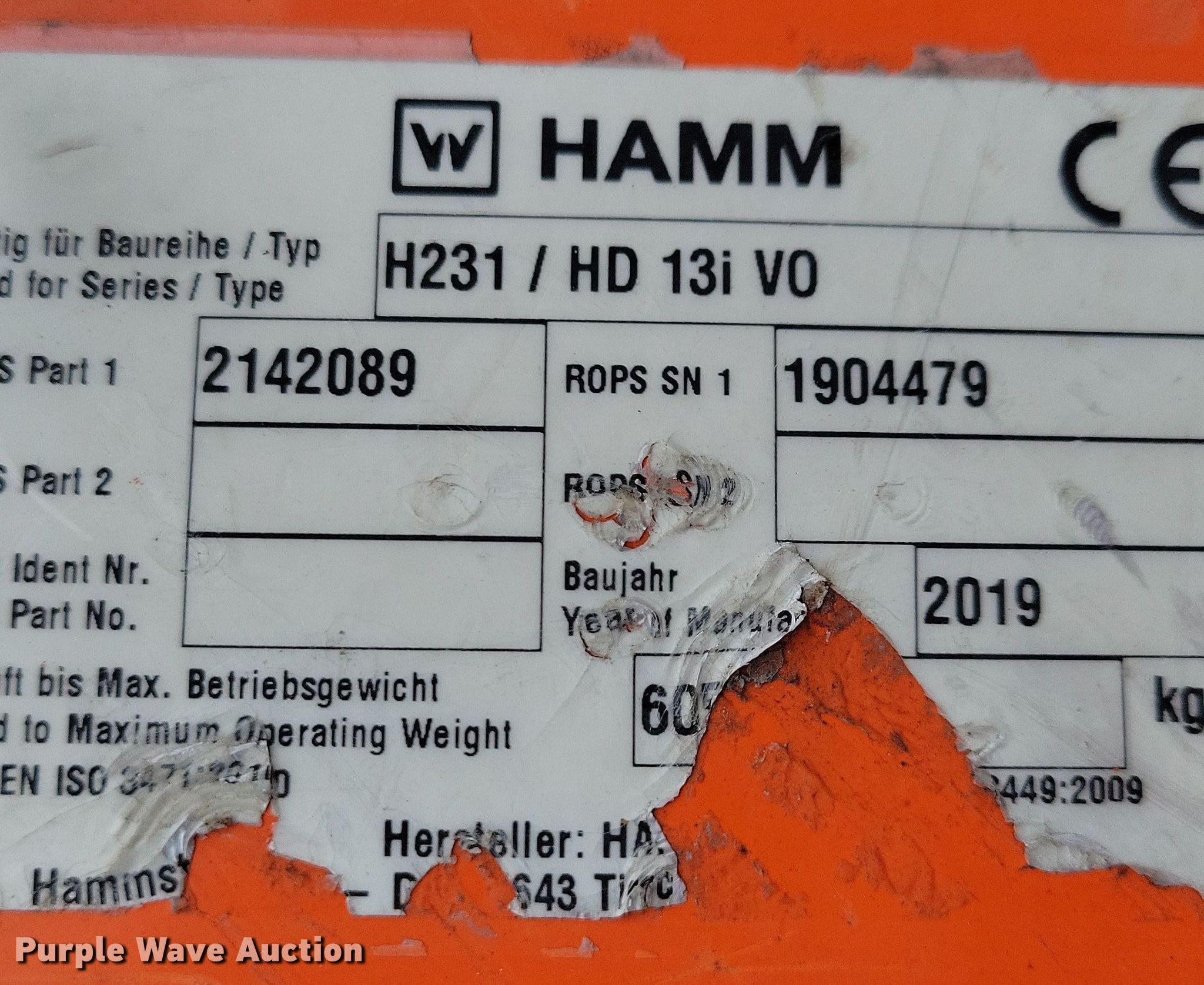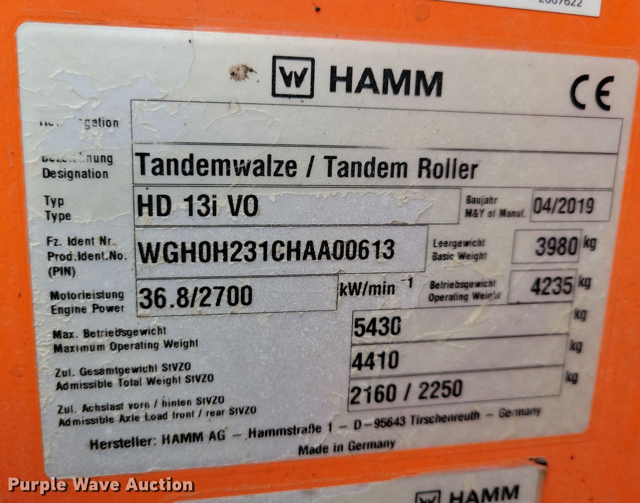 2019 Hamm HD13i double drum vibratory roller. Hours: 1,743 on meter, Serial: WGH0H231CHAA00613, Unit #: 78849. Engine Kubota V2403, Serial: 7JTA899, Displacement: 2.4L, Cylinders: 4, Fuel type: Diesel, kW: 36.8. Transmission Hydrostatic. Operators station OROPS, Vandal cover. Features Drum: Smooth, Vibratory system: Double, Independent drum controls, Two speed, Front drum Width: 51", Diameter: 35", Rear drum Width: 51", Diameter: 35", Drum scrapers: Front, Rear, Water spray applicator: Front, Rear, Dual propel system. Notes Dead battery. Rasmussen Group. Des Moines, IA 50313