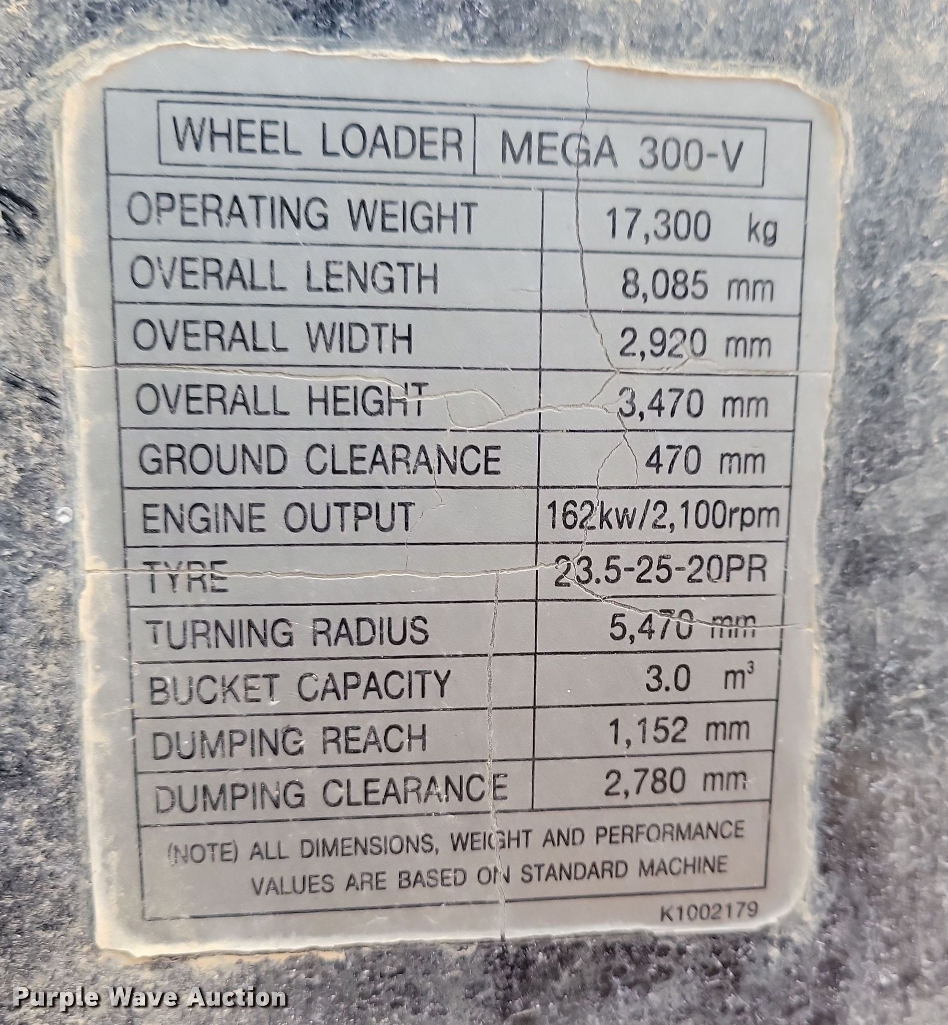 2005 Daewoo Mega 300V wheel loader. Hours: 13,250 on meter, Serial: 3029, Unit #: 53920. Engine Displacement: 8.0L, Cylinders: 6, Fuel type: Diesel, HP: 209, kW: 156. Transmission Powershift, 4F - 4R. Operators station Enclosed cab, AC, Heat, Bucket controls: Joystick. Features Counter weights, Bucket Width: 115", Cutting edge: Bolt-on. Tires Size: 23.5R25. Rasmussen Group. Des Moines, IA 50313
