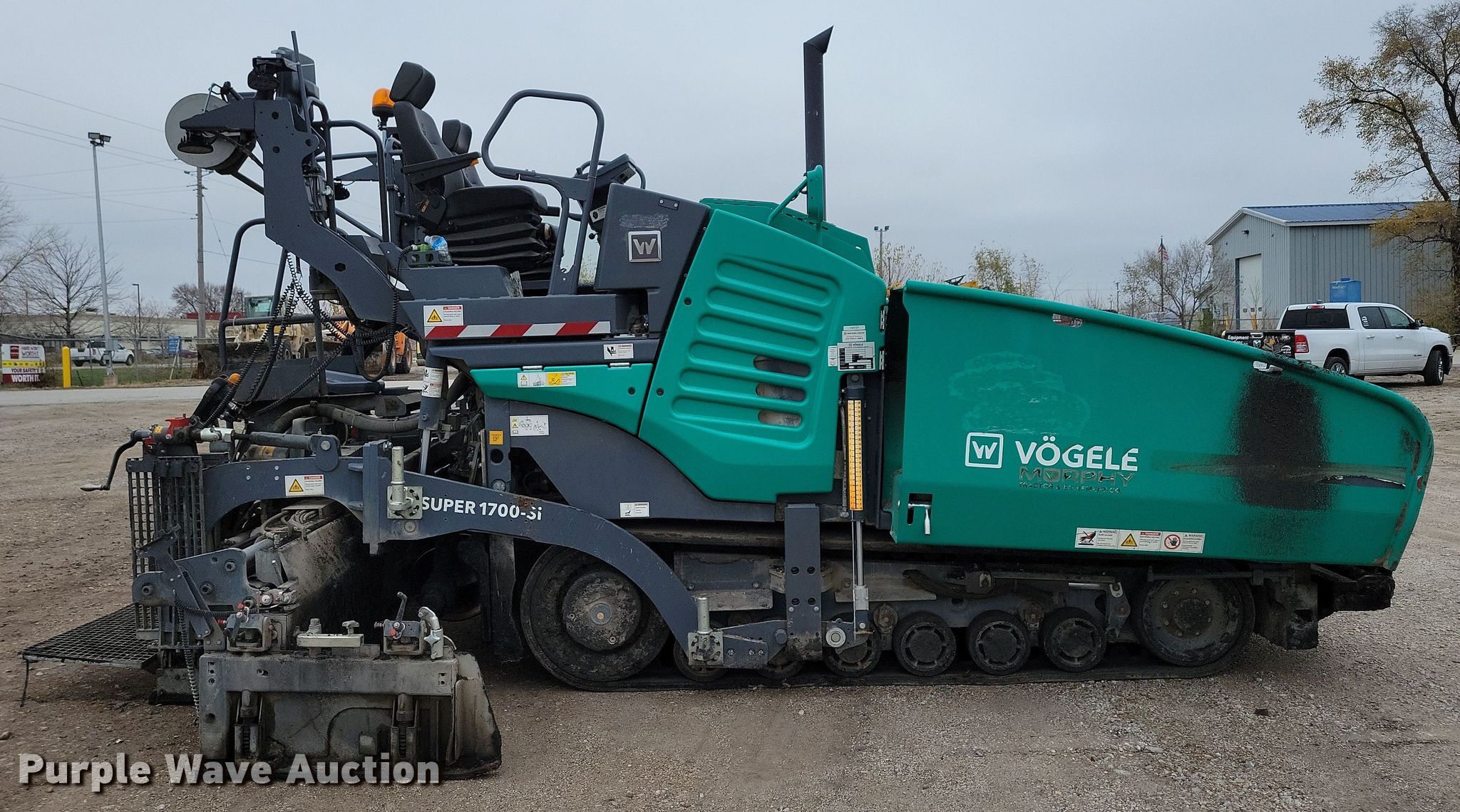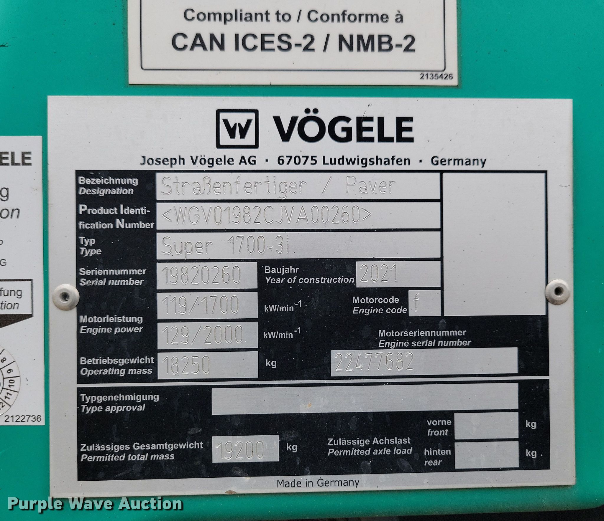 2021 Vogele Super 1700-3i paver. Hours: 1,906 on meter, Serial: 19820260, Unit #: 78741. Engine Cummins QSB, Serial: 22477682, Displacement: 4.5L, Cylinders: 4, Fuel type: Diesel, HP: 173, kW: 129. Transmission Hydrostatic, 2F - 2R. Features Screed Vogele 30AB, Paving width: 8' to 15', Extensions Quantity: 2, Screed heater: Electric, Sonic Vogele, Front spread hopper width: 10', Material conveyor Width: 48", Grade and slope controls. Tracks Width: 14", Rubber. Notes Additional parts. Rasmussen Group. Des Moines, IA 50313