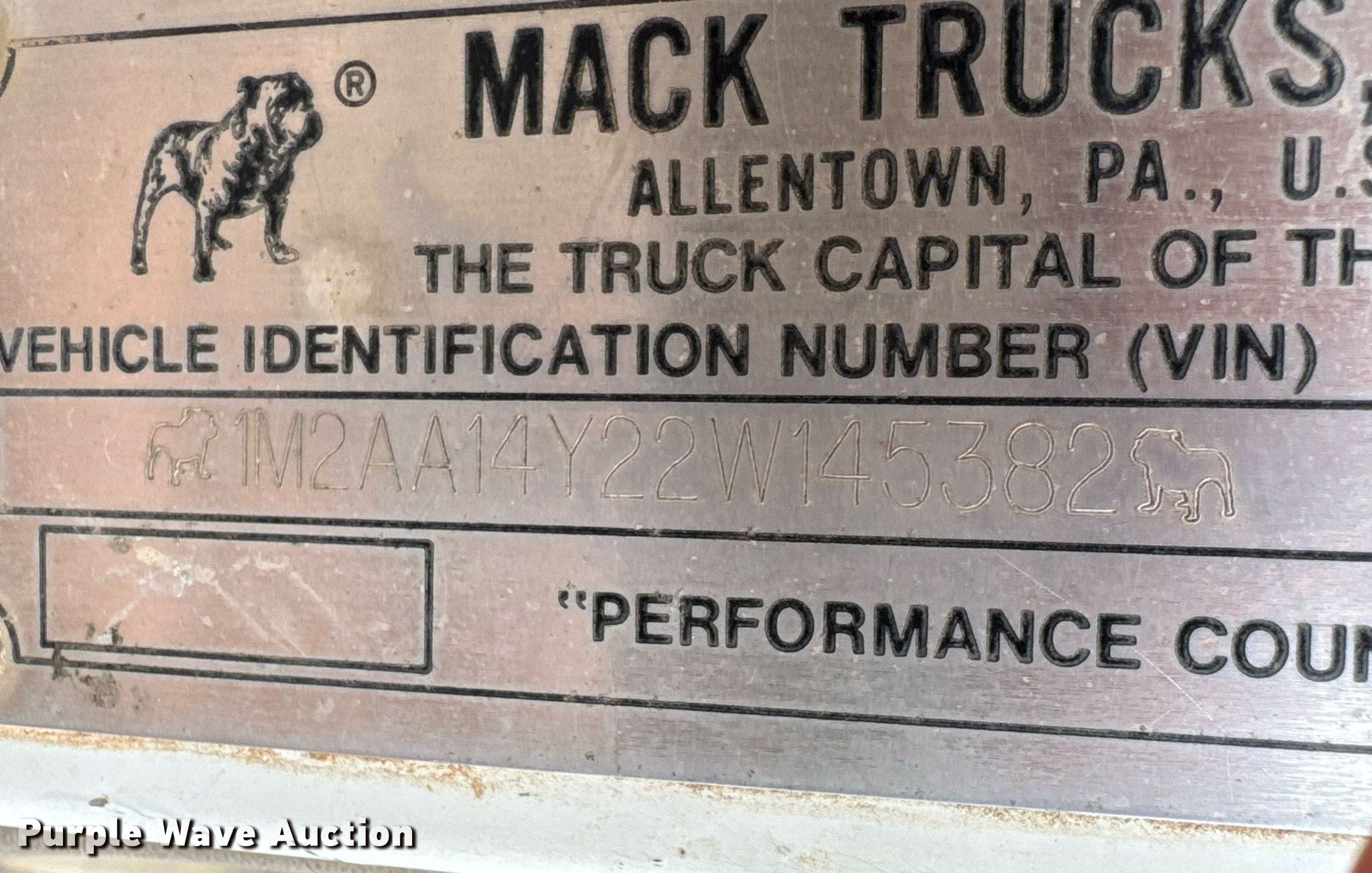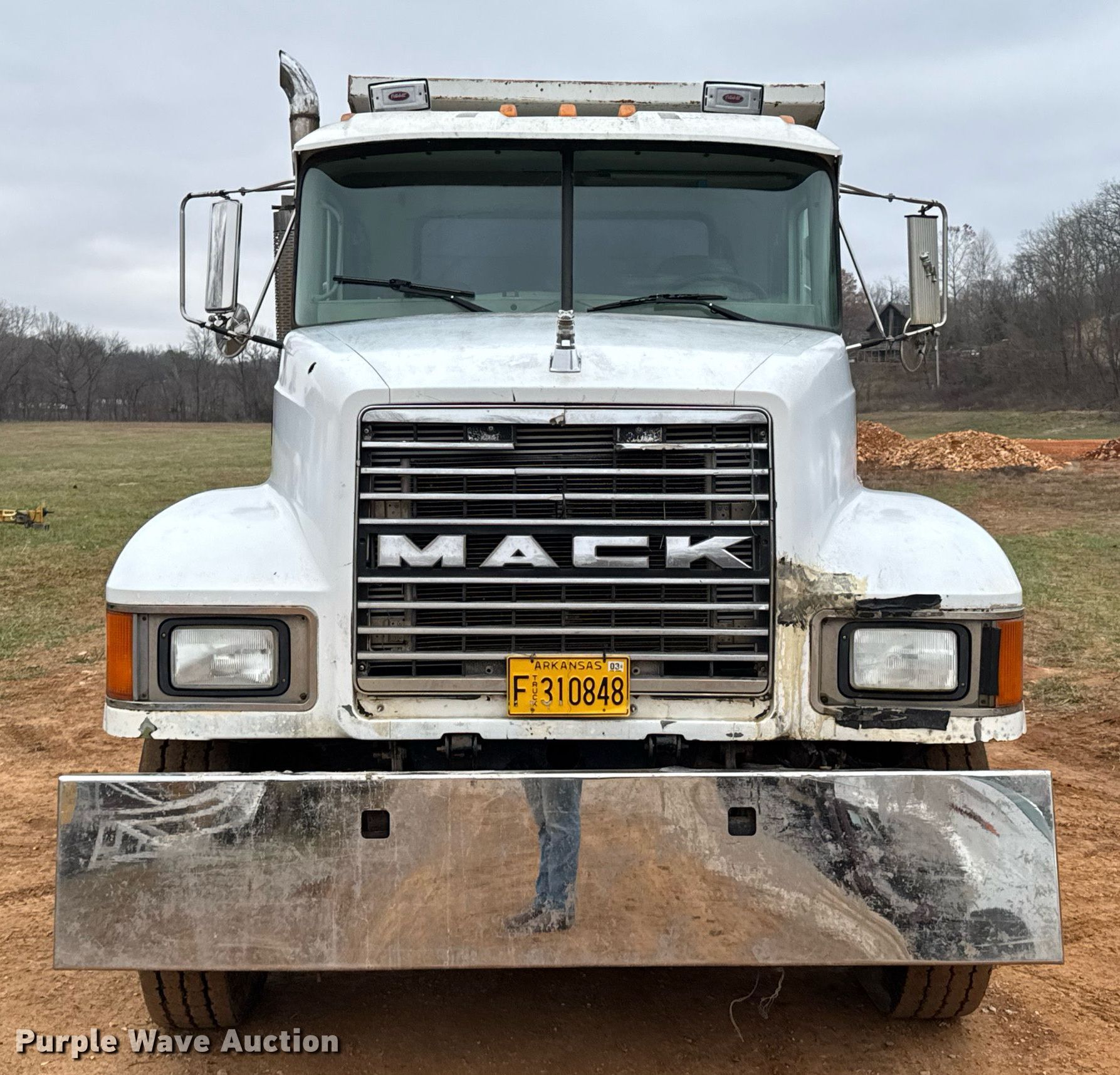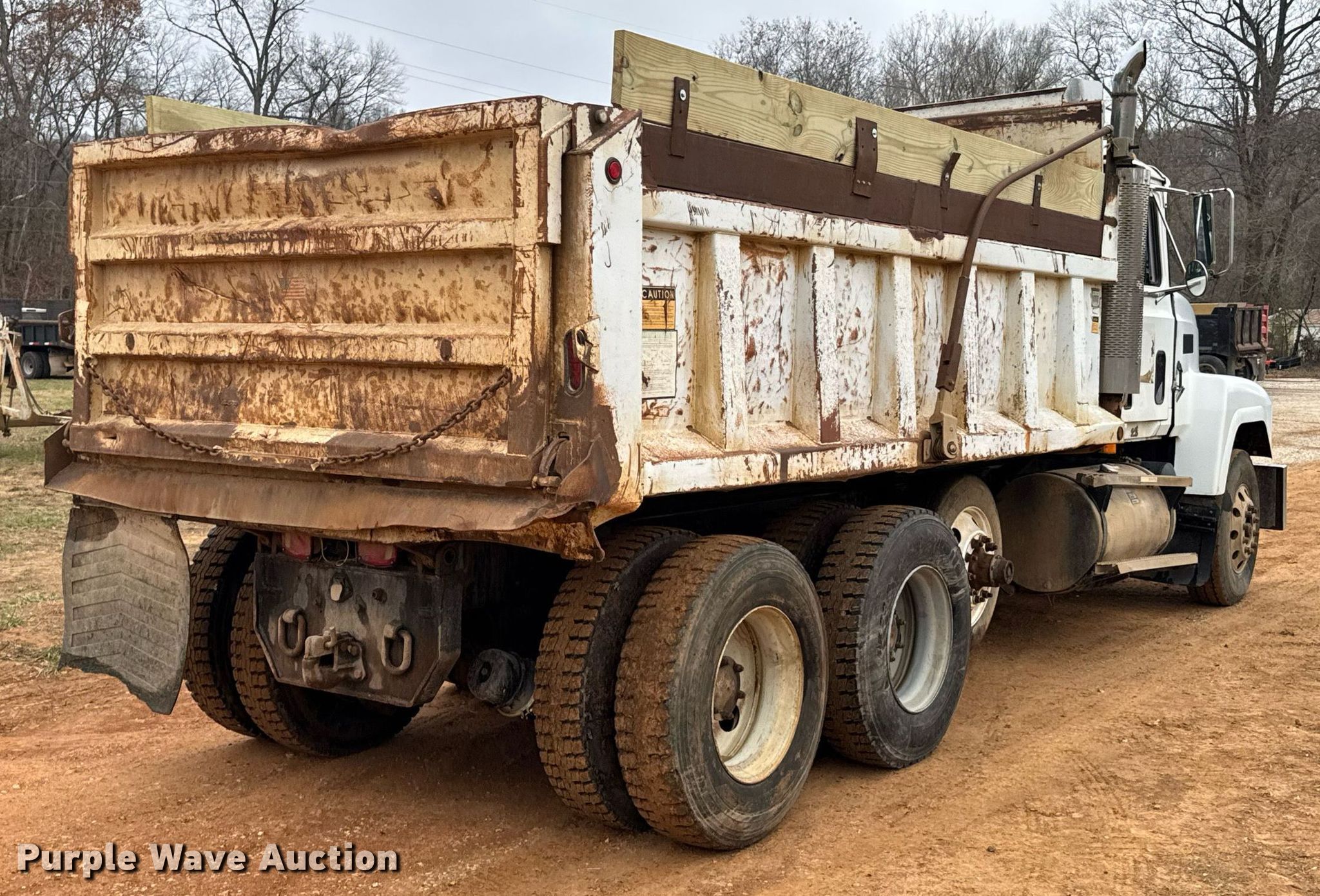 2002 Mack CH613 dump truck. Miles: 399,866 on odometer, Hours: 17,892 on meter, VIN: 1M2AA14Y22W145382. Engine Displacement: 12.0L, Cylinders: 6, Fuel type: Diesel. Transmission Eaton Fuller, Manual, Speed: 13. Chassis Axles: Triple, Pusher axle, Suspension: Camelback, Brakes: Air, PTO. Interior AC, Heat, Heated mirrors, Cruise control. Features Dump bed Davis, 15' L x 96" W, Side height: 44", Side board height: 10", Bed type: Steel, Ram: Single, End gate: Air operated. Tires Size: 11R22.5, Lift axle: 255/70R22.5. Notes Dash warning indicator: ABS, Electrical, Windshield chipped or cracked. Arkansas title. Title distribution may be delayed up to 30 days from verification of funds. Rogers, AR 72756