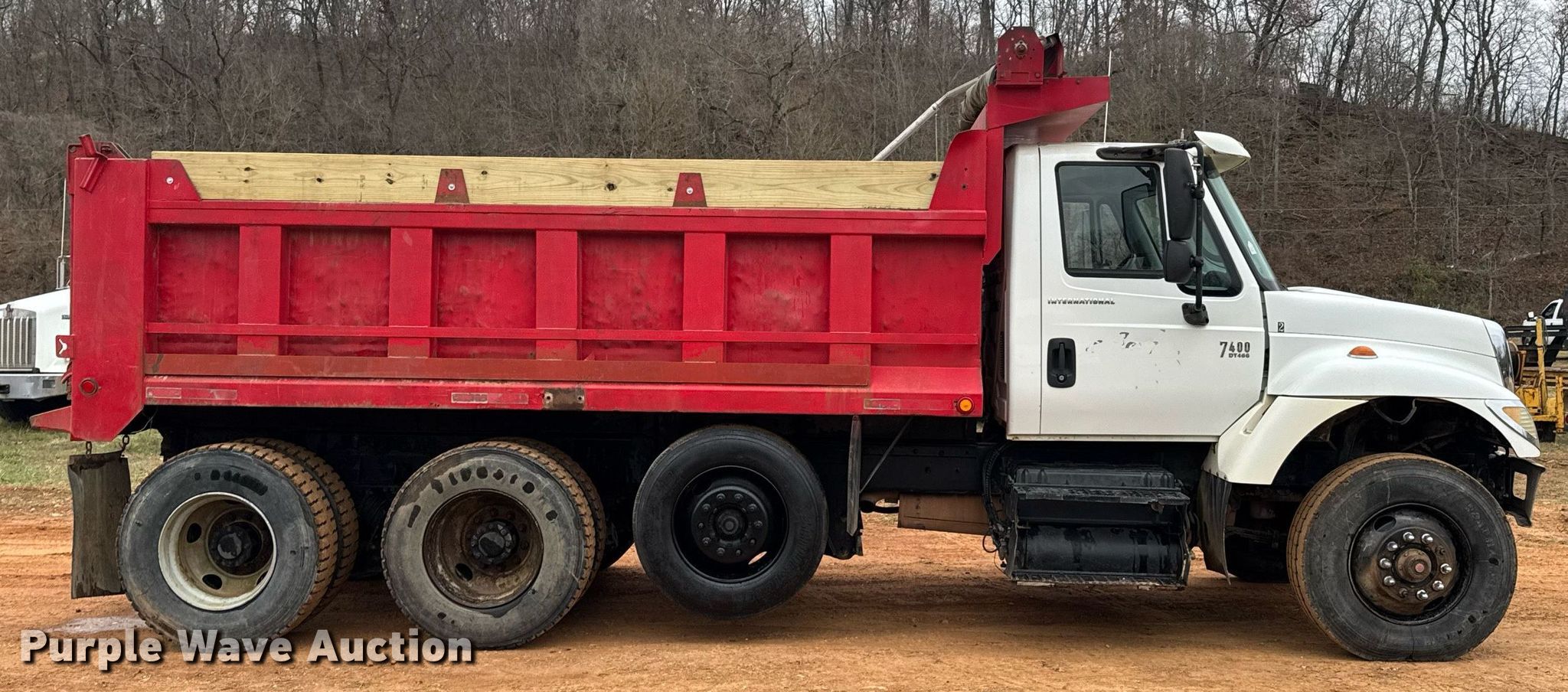 2003 International 7400 dump truck. Miles: 334,129 on odometer, VIN: 1HTWHAAT63J060268. Engine International DT466, Displacement: 7.6L, Cylinders: 6, Fuel type: Diesel. Transmission Automatic. Chassis Axles: Triple, Pusher axle, Differential lock: Inter-axle, Suspension: Spring, Brakes: Air, PTO. Interior AC, Heat. Features Dump bed Godwin Manufacturing 500TR, 15' L x 96" W, Side height: 40", Side board height: 10", Bed type: Steel, Roll tarp, Ram: Single, End gate: Air operated. Tires Size: 11R22.5, Lift axle: 255/70R22.5. Notes Dash warning indicator: Washer fluid, Check electric system, Windshield chipped or cracked, Unknown operating condition of roll tarp. Arkansas title. Title distribution may be delayed up to 30 days from verification of funds. Rogers, AR 72756