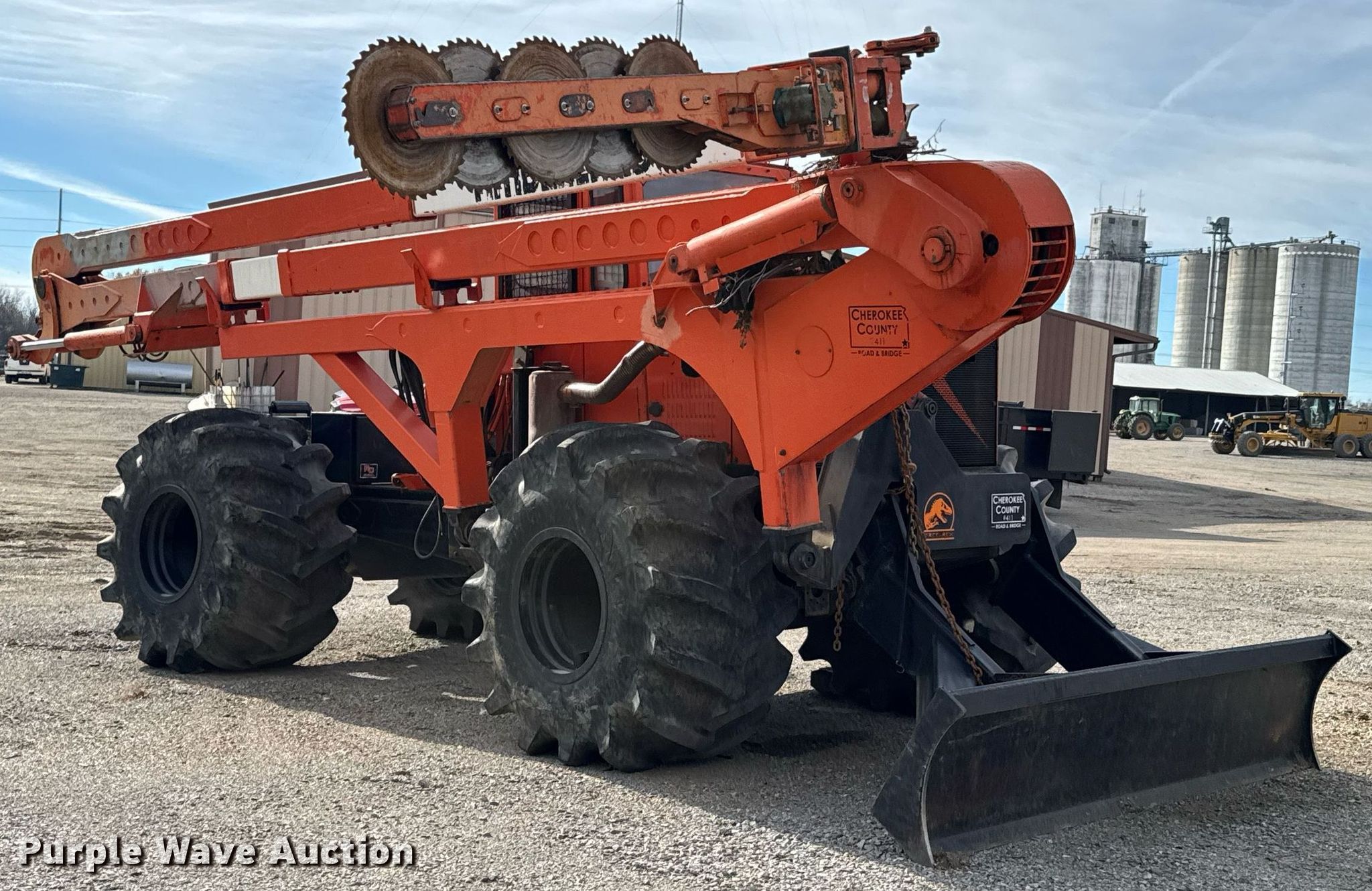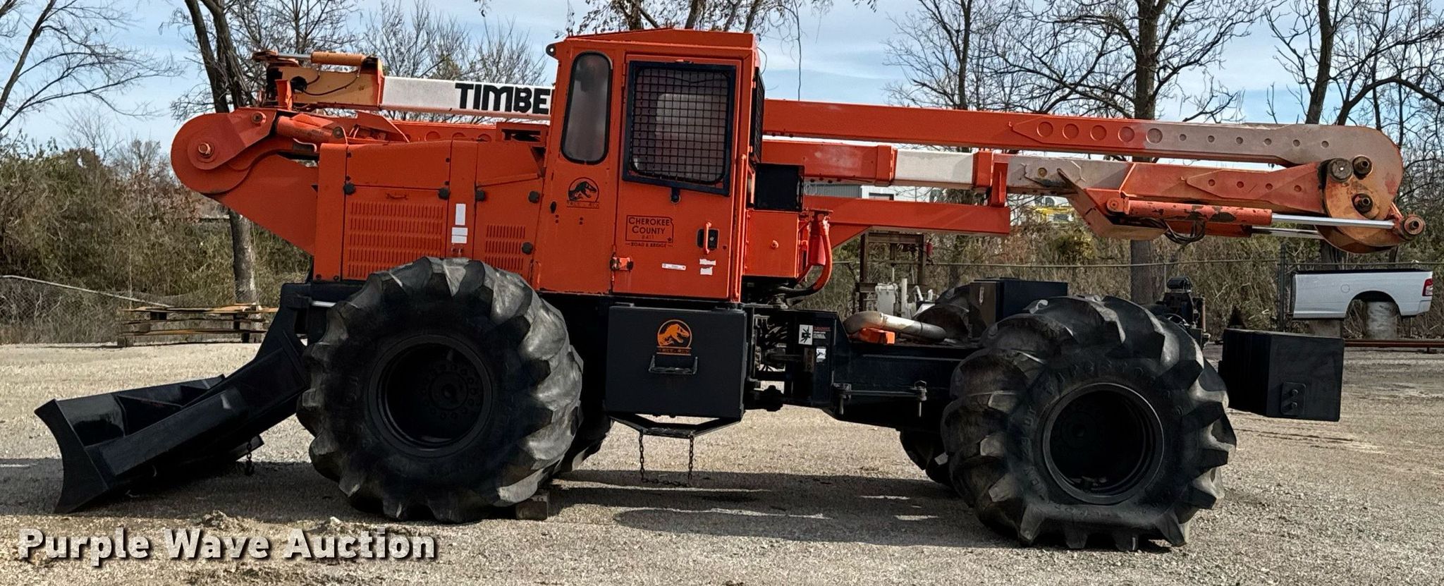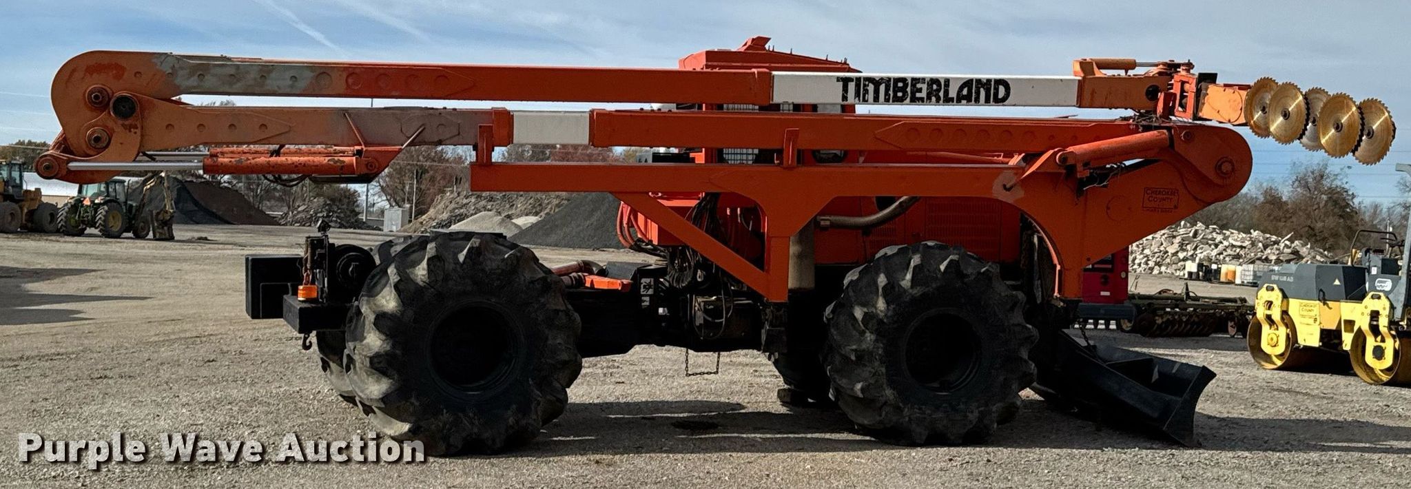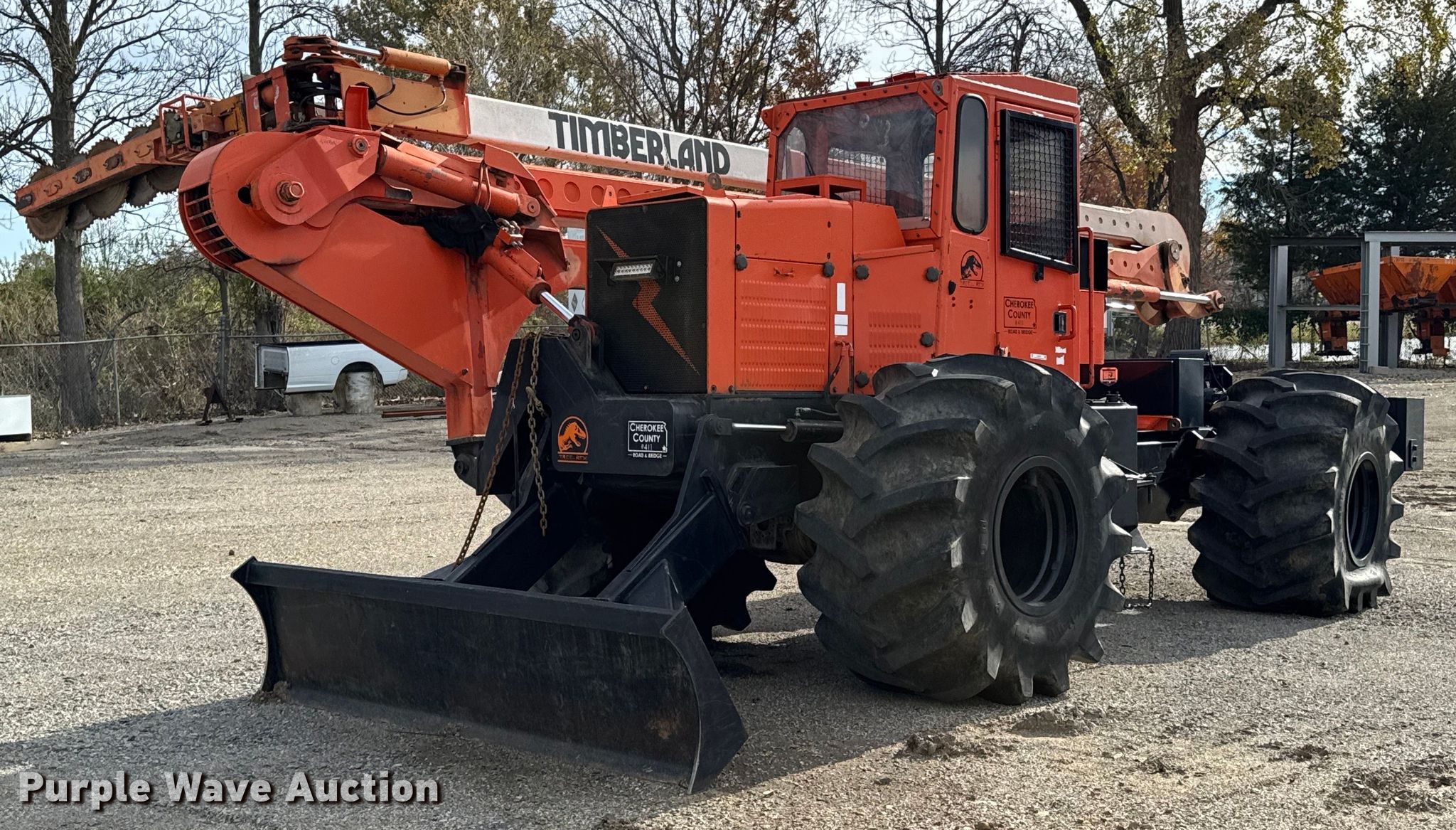 Timberland C45 tree trimmer. Hours: 3,526 on meter, Serial: 970112. Engine Cummins B5.9C, Serial: 46140821, Displacement: 5.9L, Cylinders: 6, Fuel type: Diesel, HP: 152. Transmission Powershift, 4F - 4R. Chassis Differential lock. Operators station Enclosed cab, AC, Heat. Features Boom, Blades: 5 Diameter: 18", Backfill blade Width: 112", Winch DP Manufacturing, Capacity: 30,000 lbs, Counter weights: 12. Tires Size: 67x34.00-26. Notes Non-operational engine , Unknown operating condition of AC, Non-operational unit. Cherokee County Road and Bridge. Columbus, KS 66725
