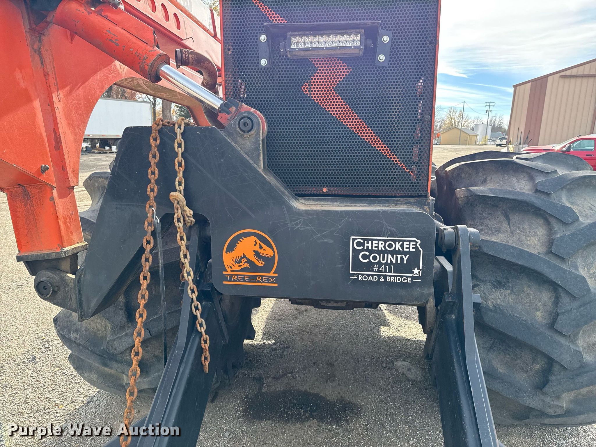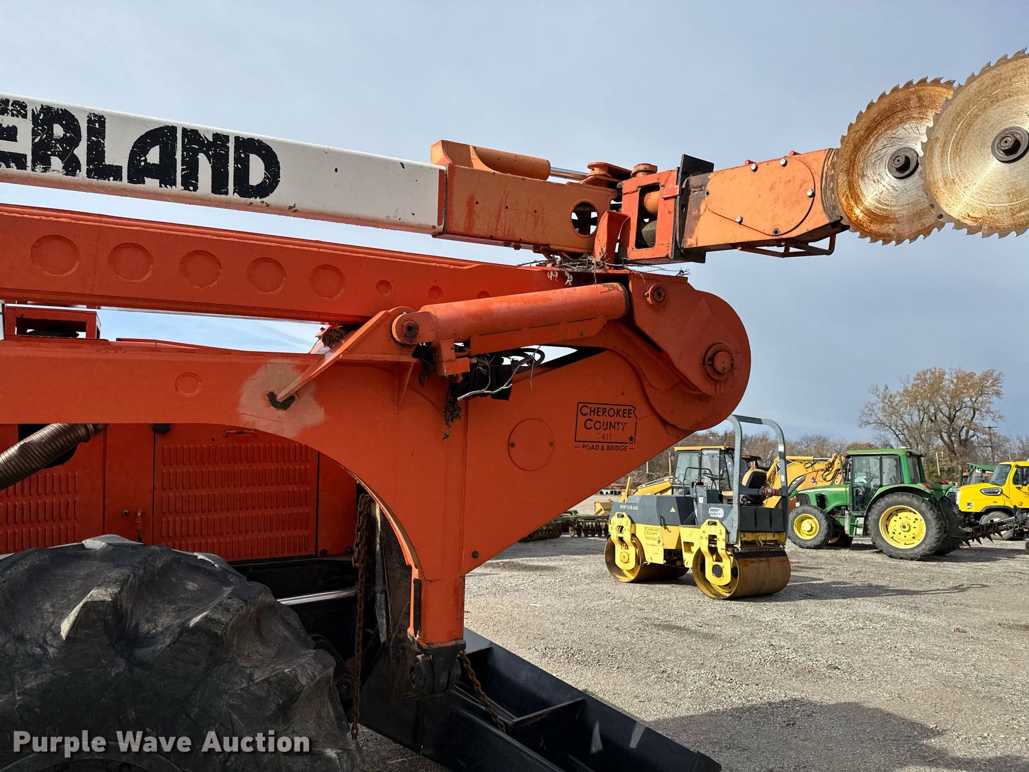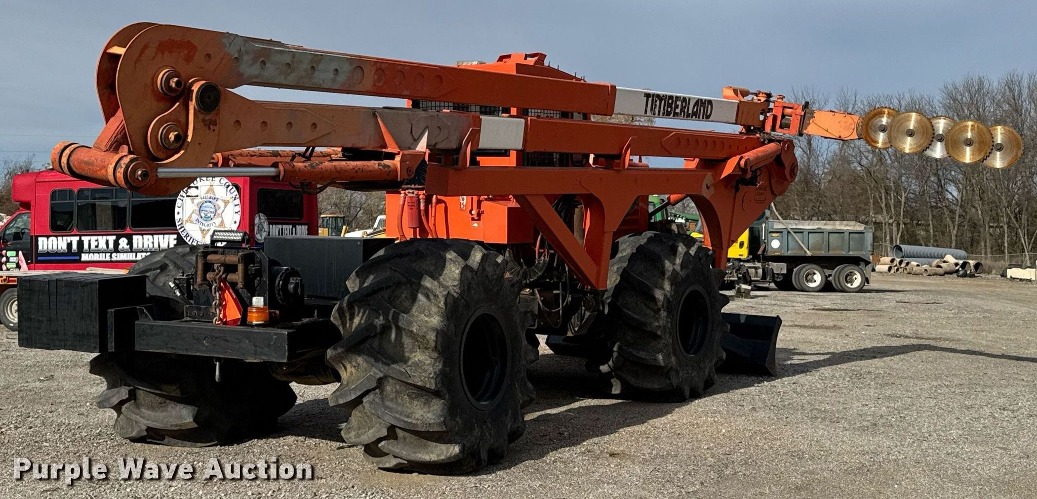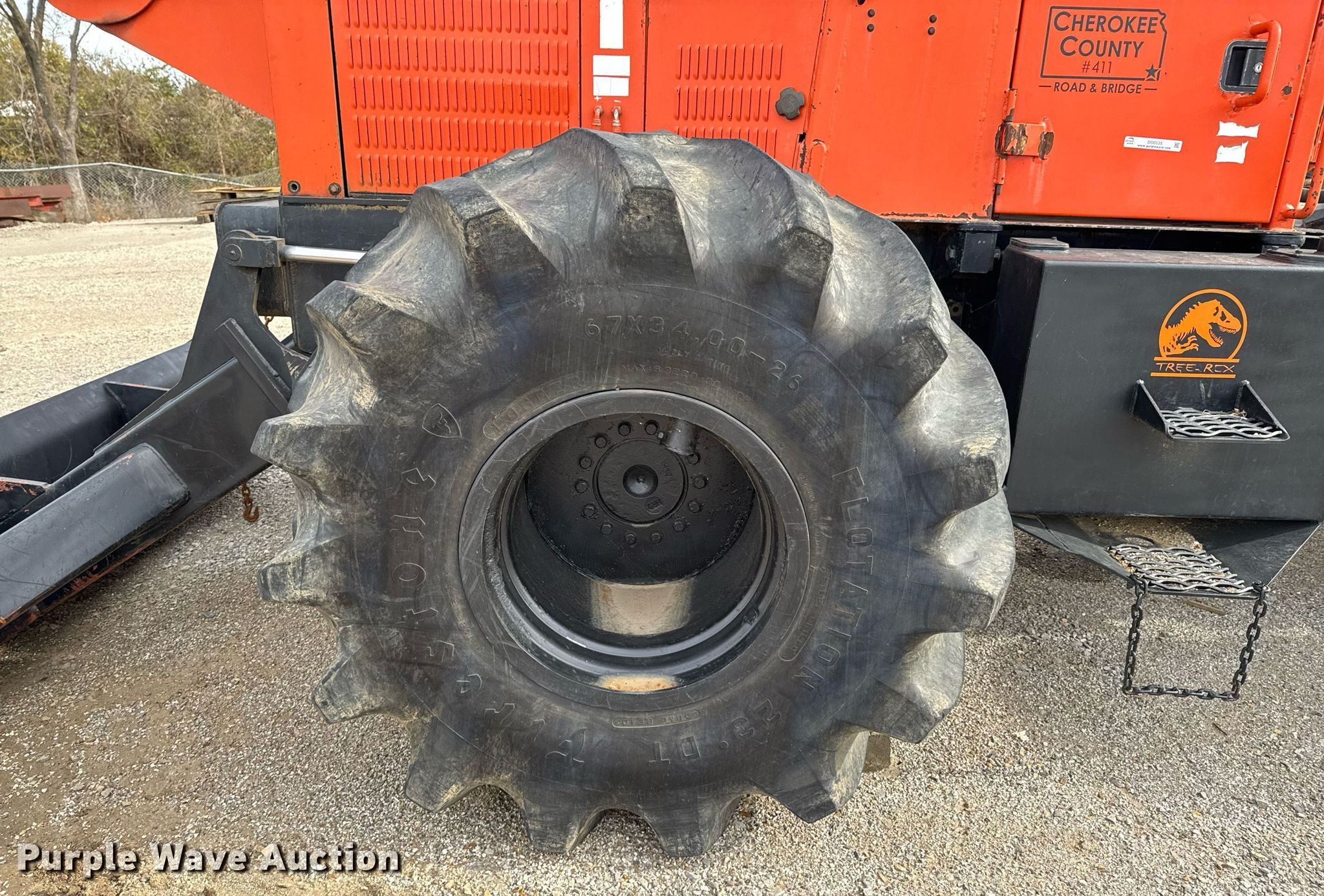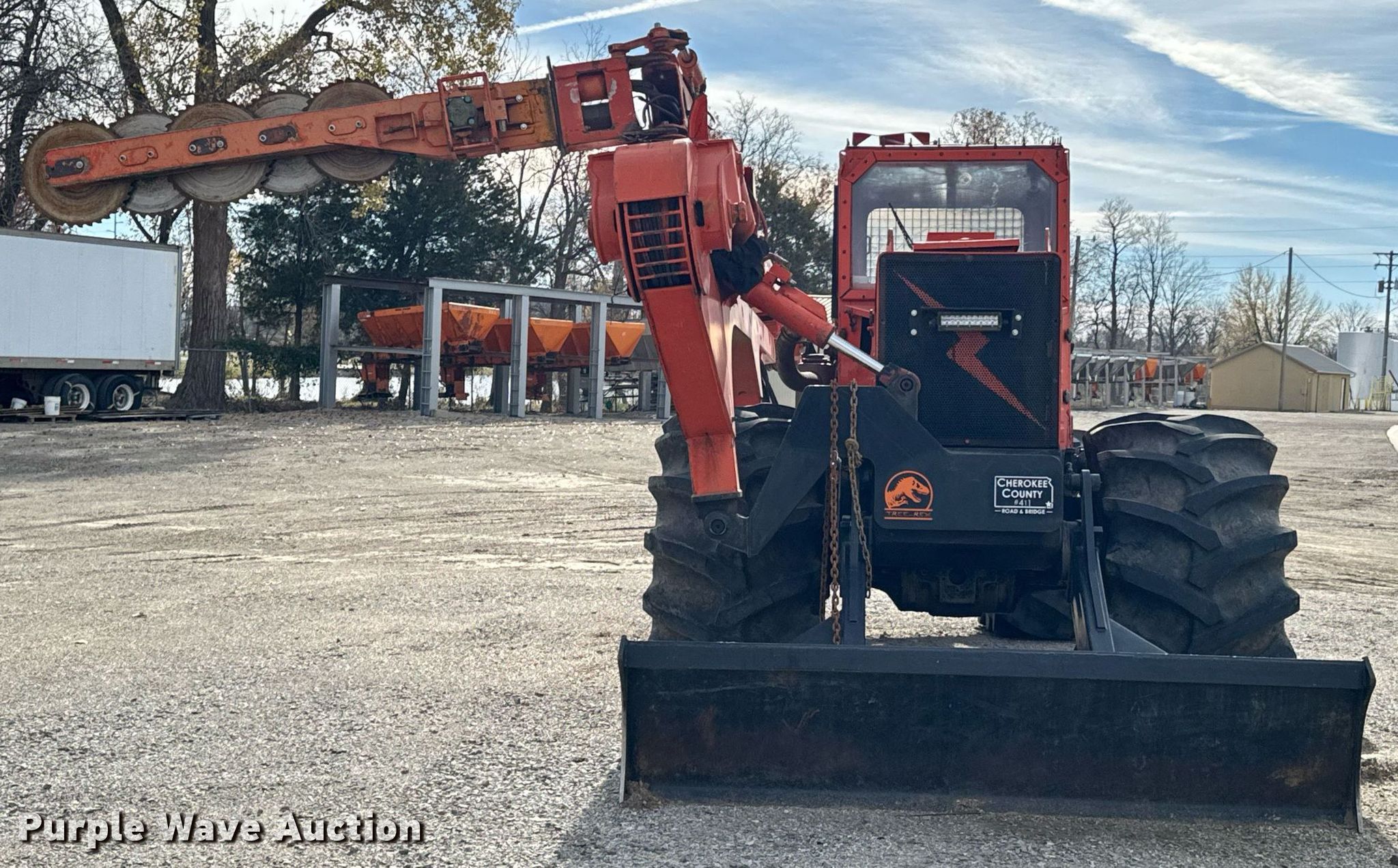 Timberland C45 tree trimmer. Hours: 3,526 on meter, Serial: 970112. Engine Cummins B5.9C, Serial: 46140821, Displacement: 5.9L, Cylinders: 6, Fuel type: Diesel, HP: 152. Transmission Powershift, 4F - 4R. Chassis Differential lock. Operators station Enclosed cab, AC, Heat. Features Boom, Blades: 5 Diameter: 18", Backfill blade Width: 112", Winch DP Manufacturing, Capacity: 30,000 lbs, Counter weights: 12. Tires Size: 67x34.00-26. Notes Non-operational engine , Unknown operating condition of AC, Non-operational unit. Cherokee County Road and Bridge. Columbus, KS 66725