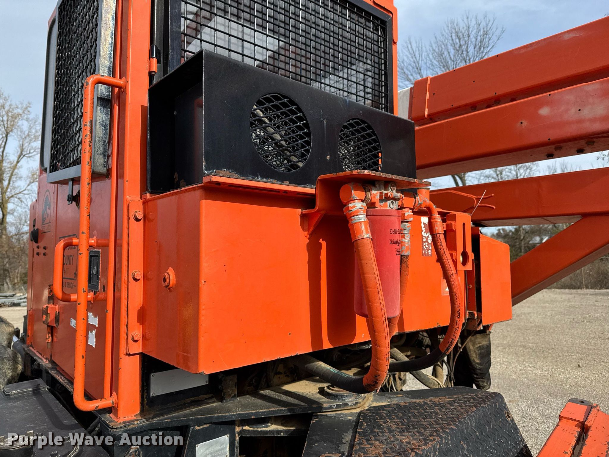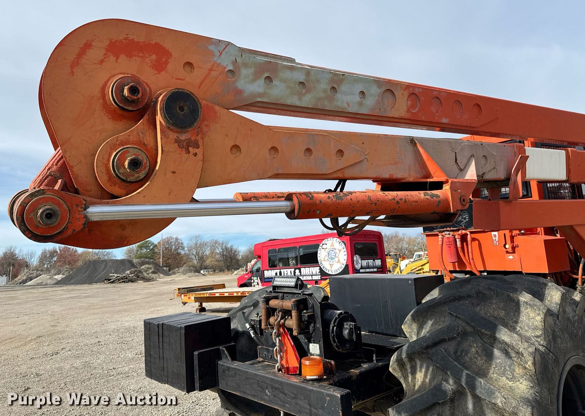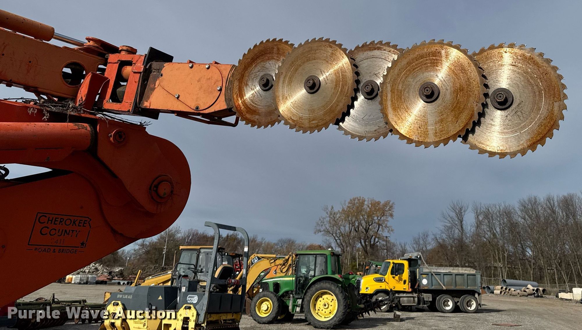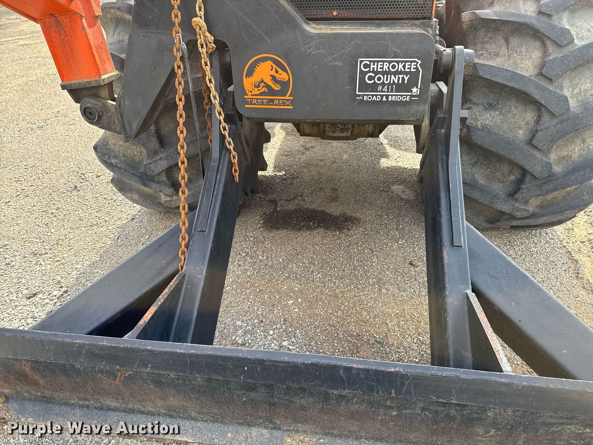 Timberland C45 tree trimmer. Hours: 3,526 on meter, Serial: 970112. Engine Cummins B5.9C, Serial: 46140821, Displacement: 5.9L, Cylinders: 6, Fuel type: Diesel, HP: 152. Transmission Powershift, 4F - 4R. Chassis Differential lock. Operators station Enclosed cab, AC, Heat. Features Boom, Blades: 5 Diameter: 18", Backfill blade Width: 112", Winch DP Manufacturing, Capacity: 30,000 lbs, Counter weights: 12. Tires Size: 67x34.00-26. Notes Non-operational engine , Unknown operating condition of AC, Non-operational unit. Cherokee County Road and Bridge. Columbus, KS 66725