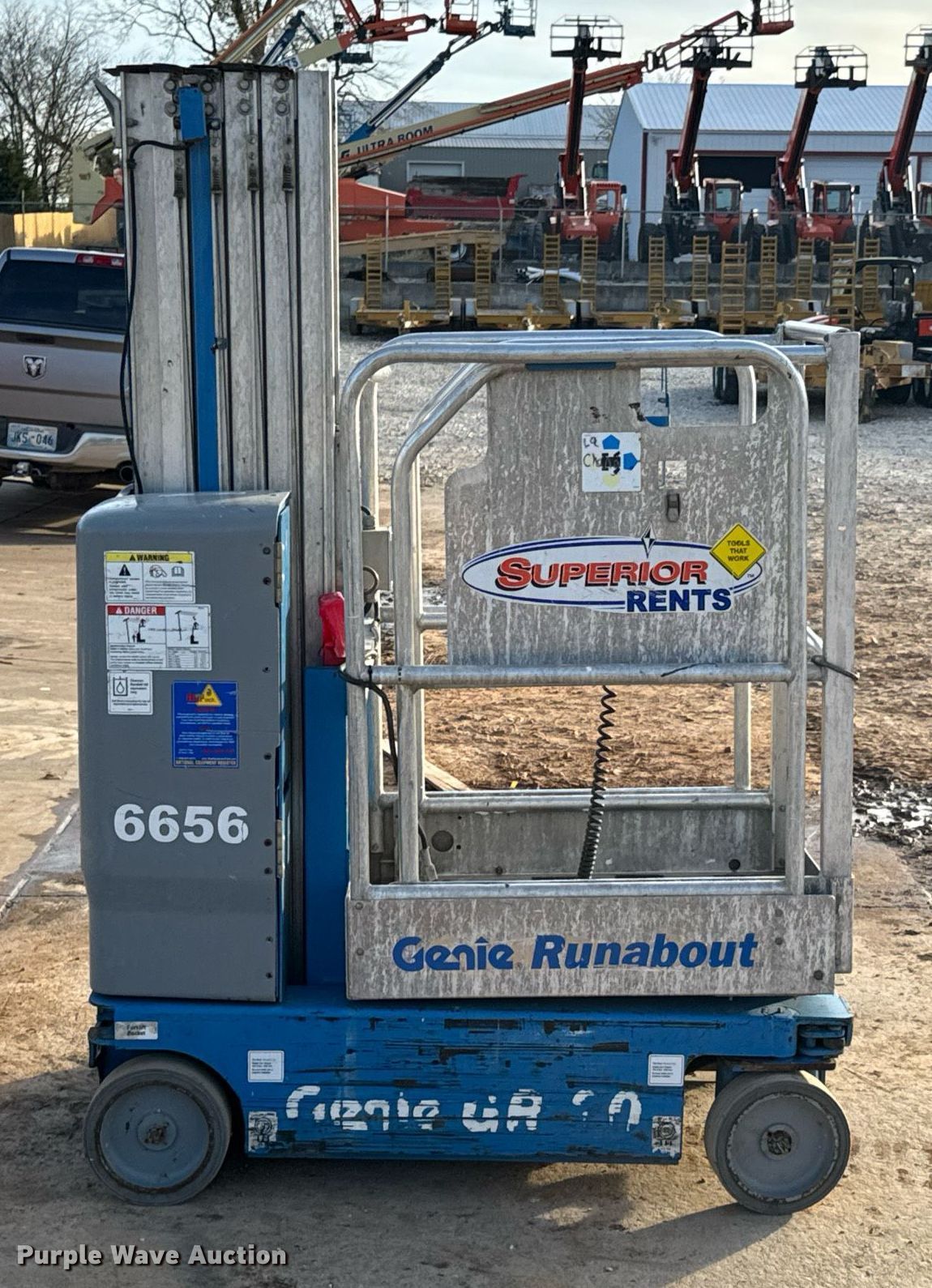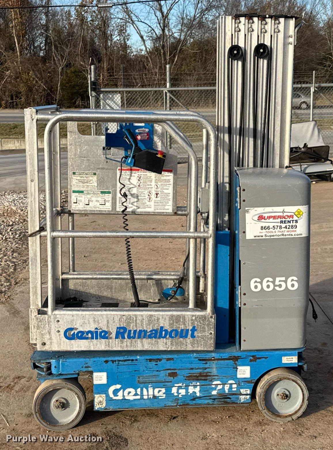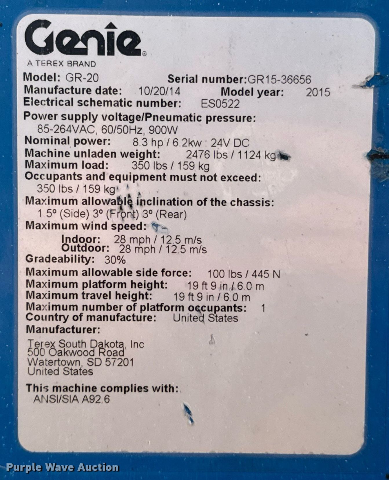 Purple Wave is selling a used Scissor or Vertical Lift in Missouri. This item is a 2015 Genie GR20 vertical lift with the following: Hours: 352 on meter, Serial: GR15-36656