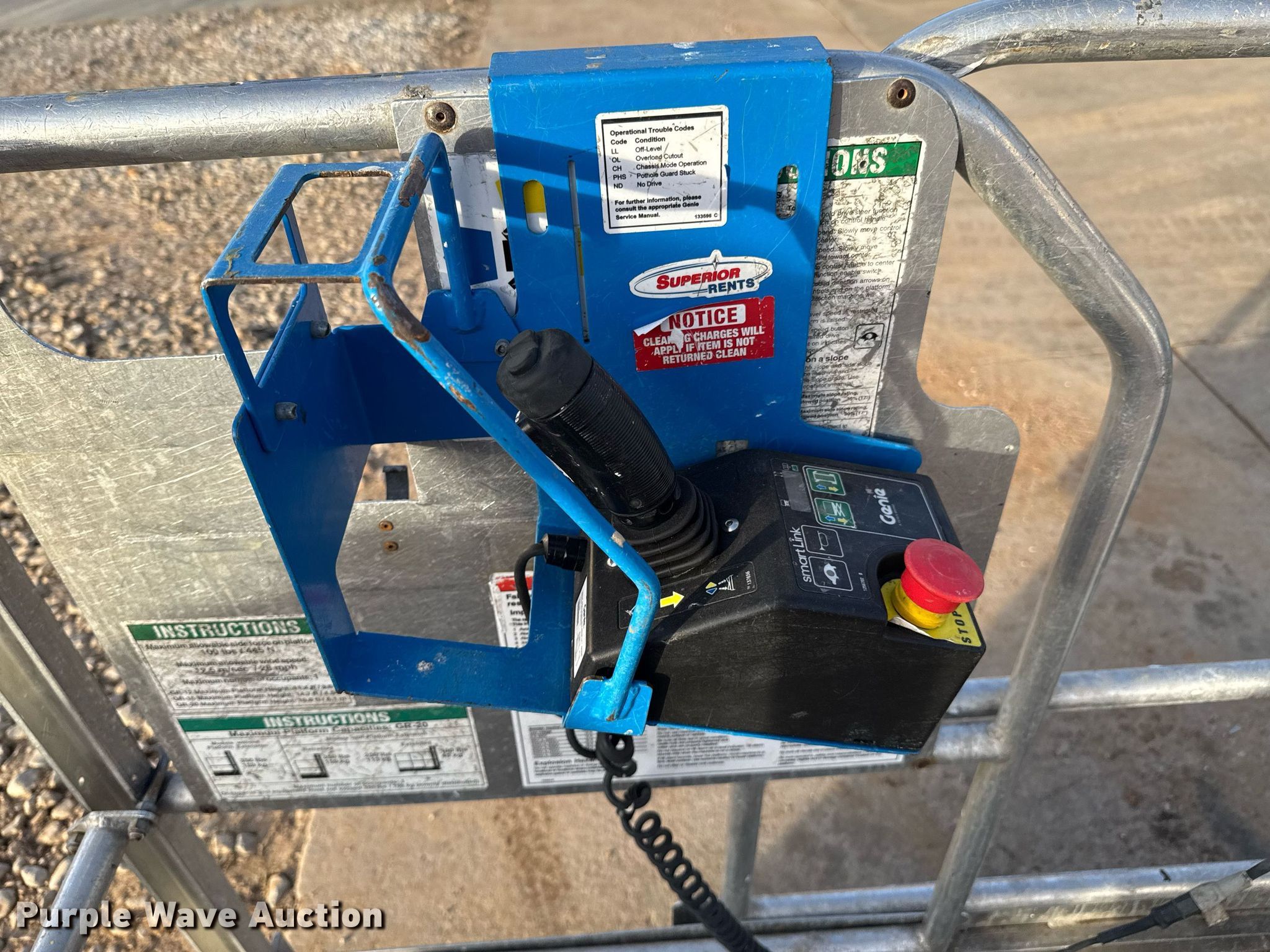 2015 Genie GR20 vertical lift. Hours: 352 on meter, Serial: GR15-36656. Electric Motor Volts: 24. Features Maximum lift capacity: 350 lbs, Maximum lift height: 19' 9", Platform: 36" L x 24" W, AC power outlet, Controls: Remote Control, Ground, Platform extensions: Manual. Tires Tire size: 10x3, Solid. Superior Rents. Joplin, MO 64801