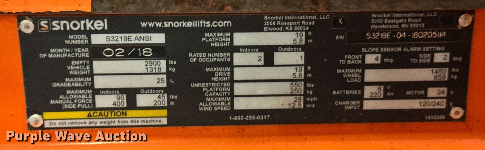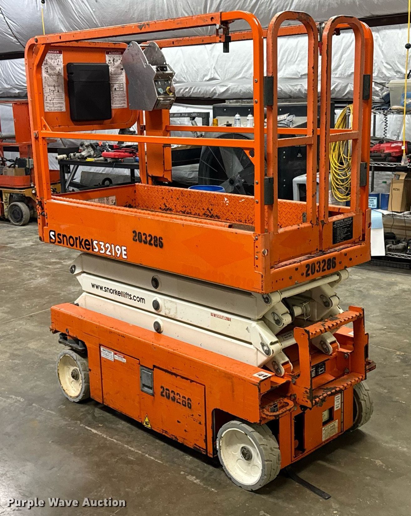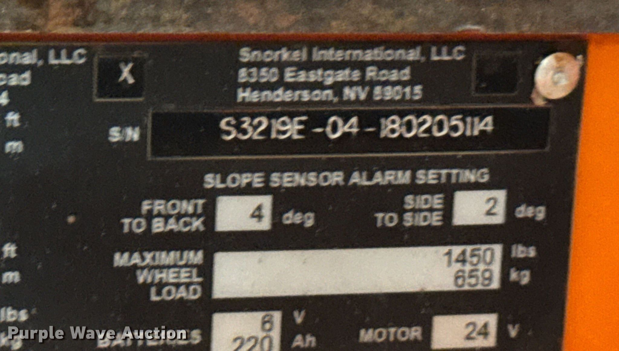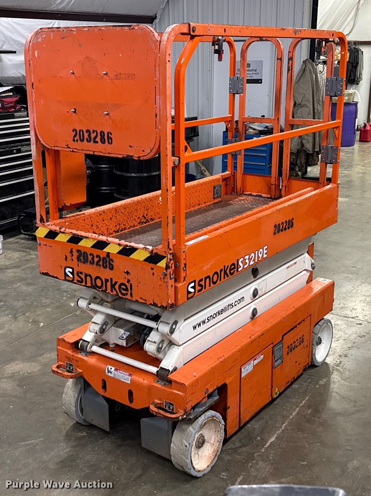 Purple Wave is selling a used Scissor or Vertical Lift in Oklahoma. This item is a 2018 Snorkel 3219E scissor lift with the following: Hours: 526 on meter, Serial: S3219E-04-180205114