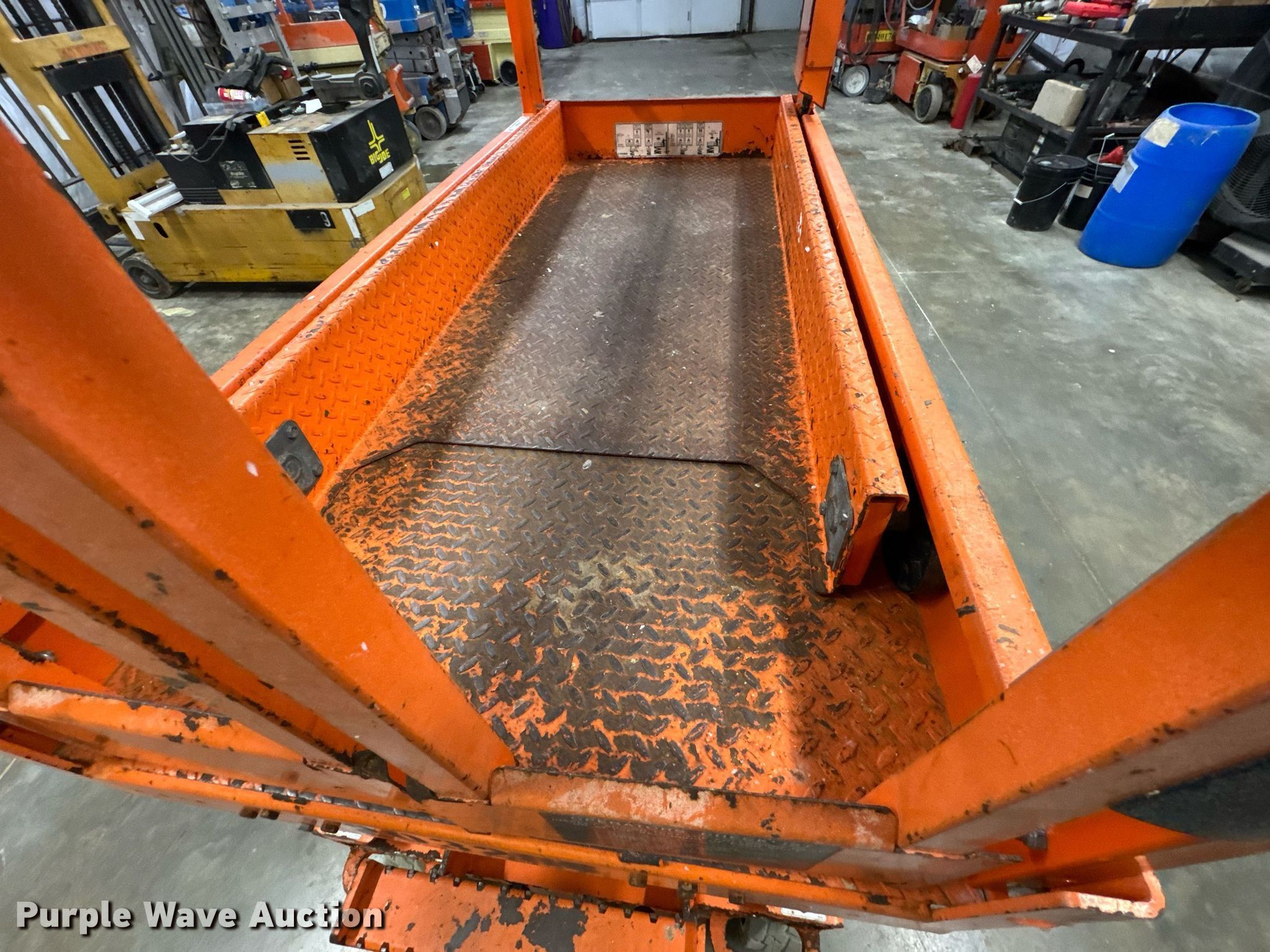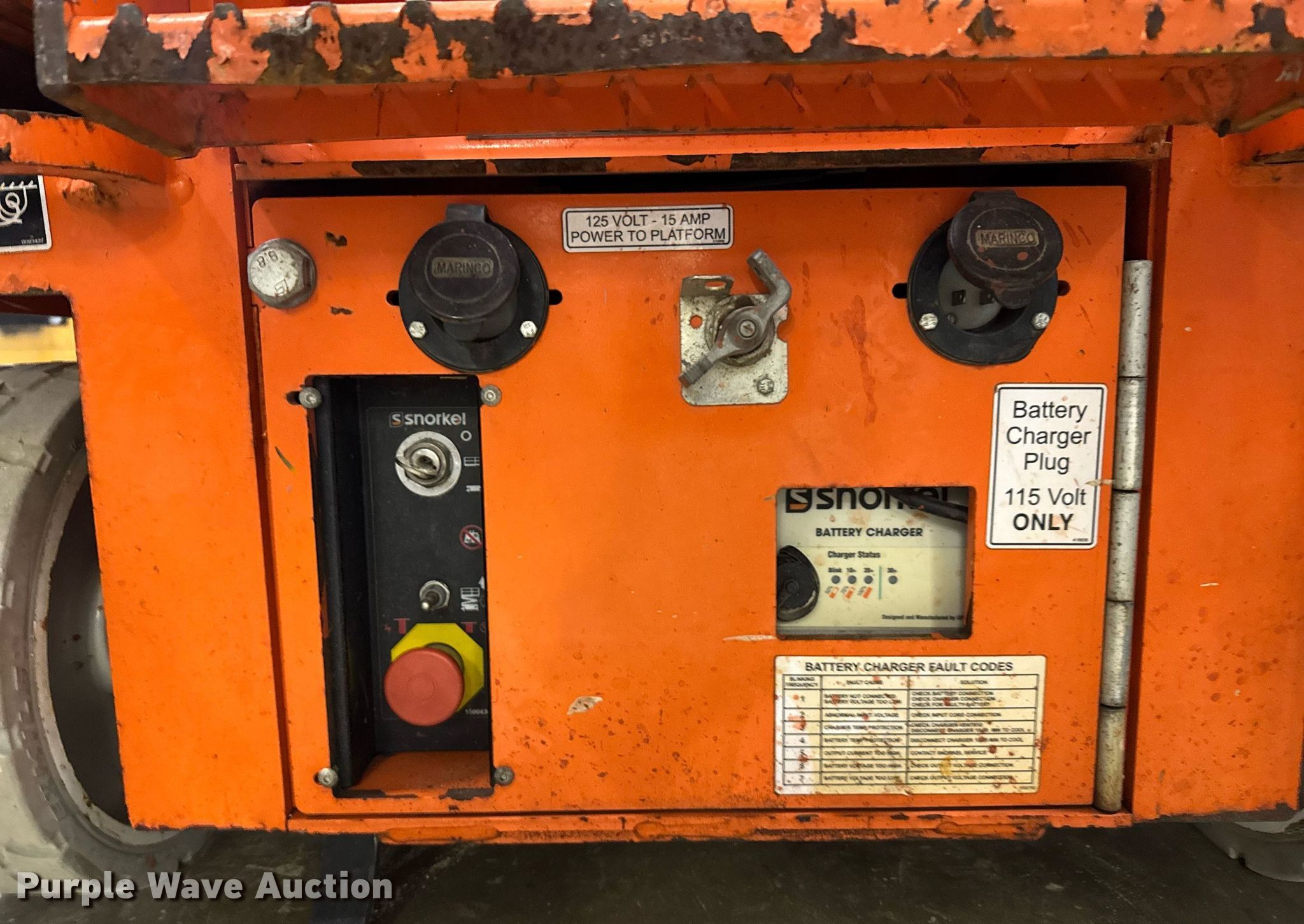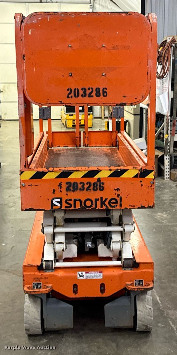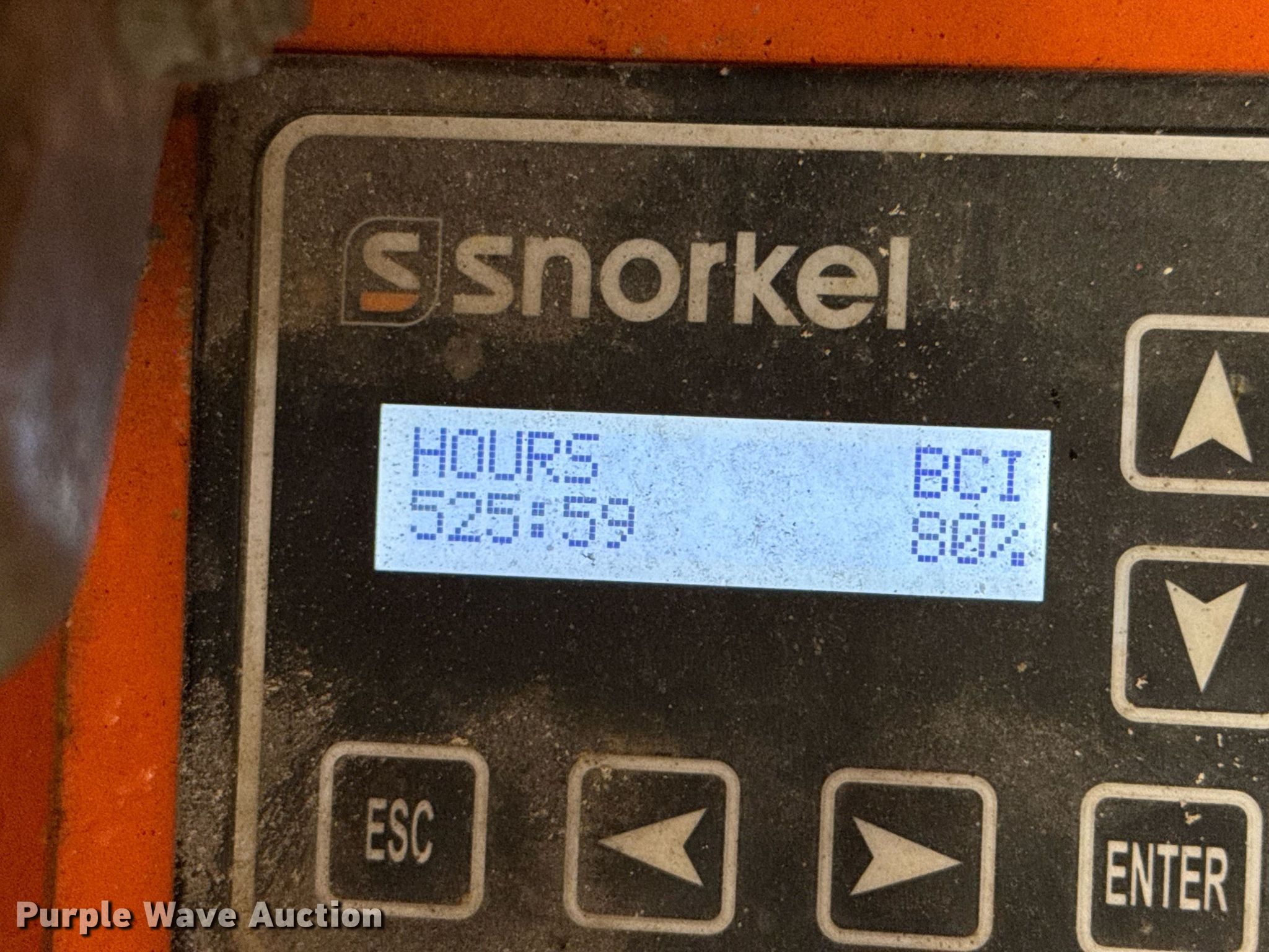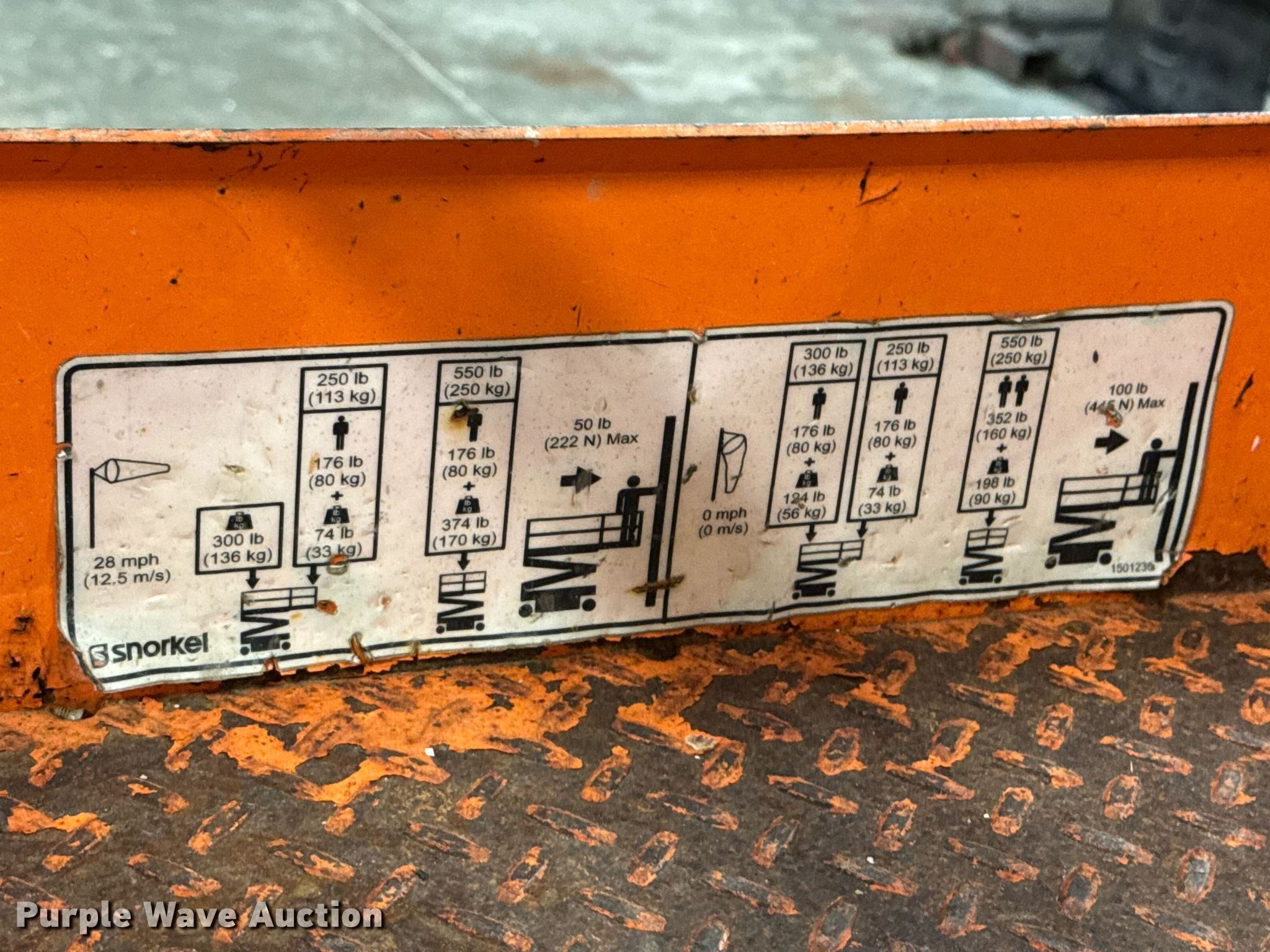 2018 Snorkel 3219E scissor lift. Hours: 526 on meter, Serial: S3219E-04-180205114. Electric Motor Volts: 24. Features Maximum lift capacity: 550 lbs, Maximum lift height: 19', Platform: 66" L x 30" W, AC power outlet, Controls: Remote control, Platform extensions: Manual. Tires Tire size: 12x4, Solid. Chouteau, OK 74337